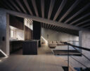 森田悠紀建築設計事務所による、東京の「上目黒の家」。往来のある緑道に面した敷地。内外の“適切な関係”の構築を求め、壁柱を並べて“視線の抜けを確保”しつつ“外からの斜めの視線を遮る”建築を考案。土地の様々な条件に応えた末に“回廊の様な空間”が立上がる2階、キッチン photo©西川公朗