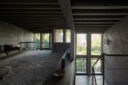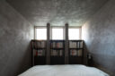往来のある緑道に面した敷地での計画。建築家は、内外の“適切な関係”の構築を求め、壁柱を並べて“視線の抜けを確保”しつつ“外からの斜めの視線を遮る”建築を考案しました。また、土地の様々な条件に応えた末に“回廊の様な空間”が立上がりました。