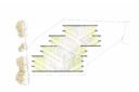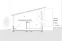 断面計画では地形に呼応し、緑道へ視線を導く2枚の屋根を架け、厳しい斜線制限を躱しつつ、低い軒で北側建物からの視線を遮り、落ち着いたスケール感を実現した。また敷地は内水氾濫による浸水が想定されているため、高基礎にしながらも、量塊感のあるコンクリートで内部を囲い込むことによる安心感をもたらした。