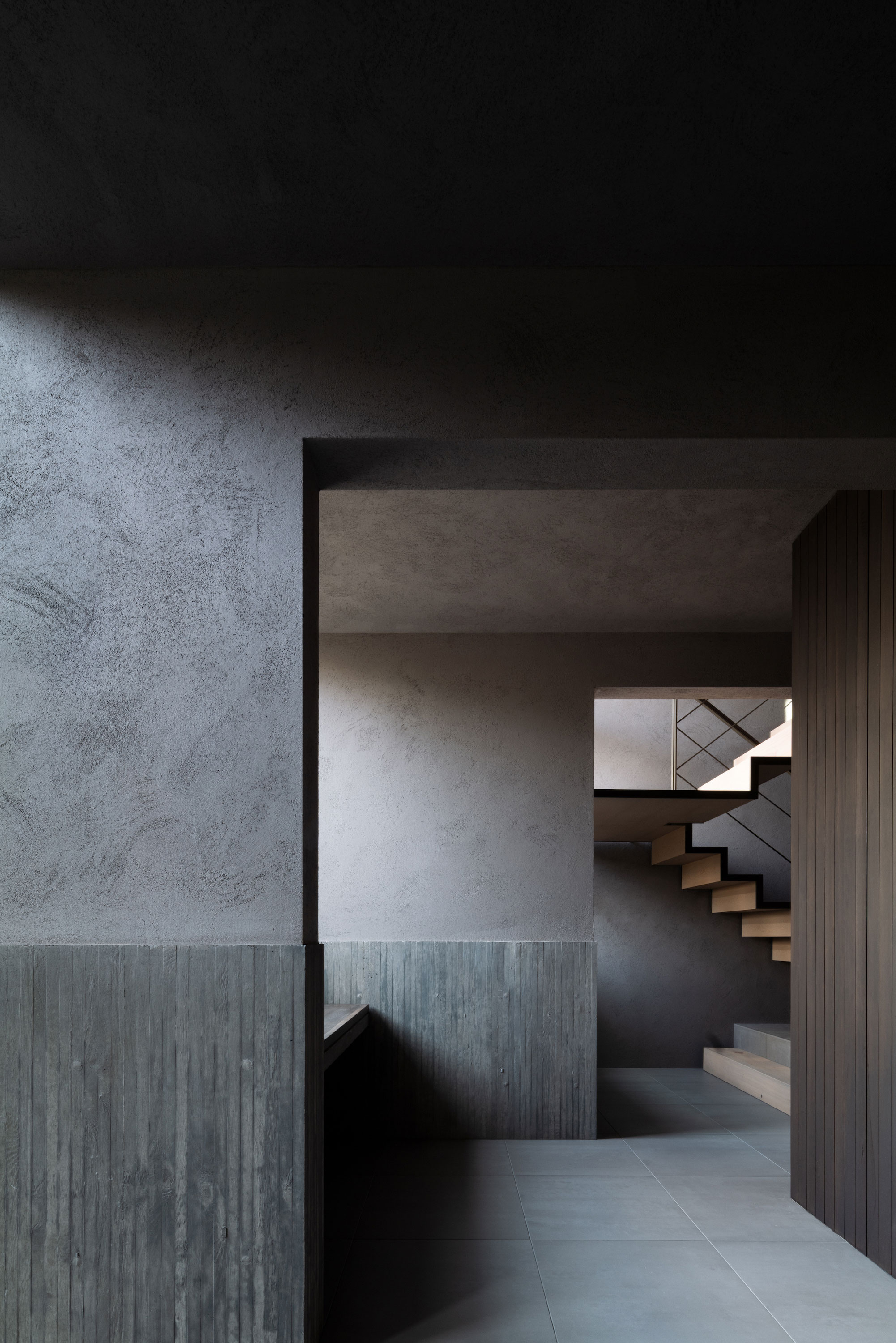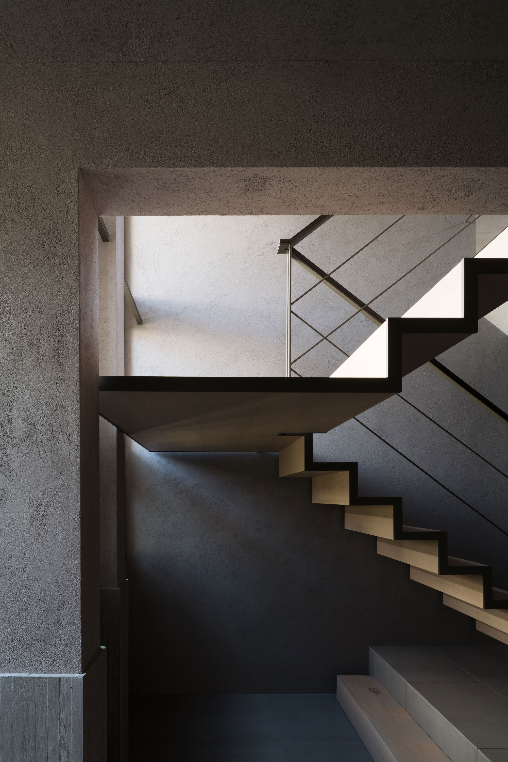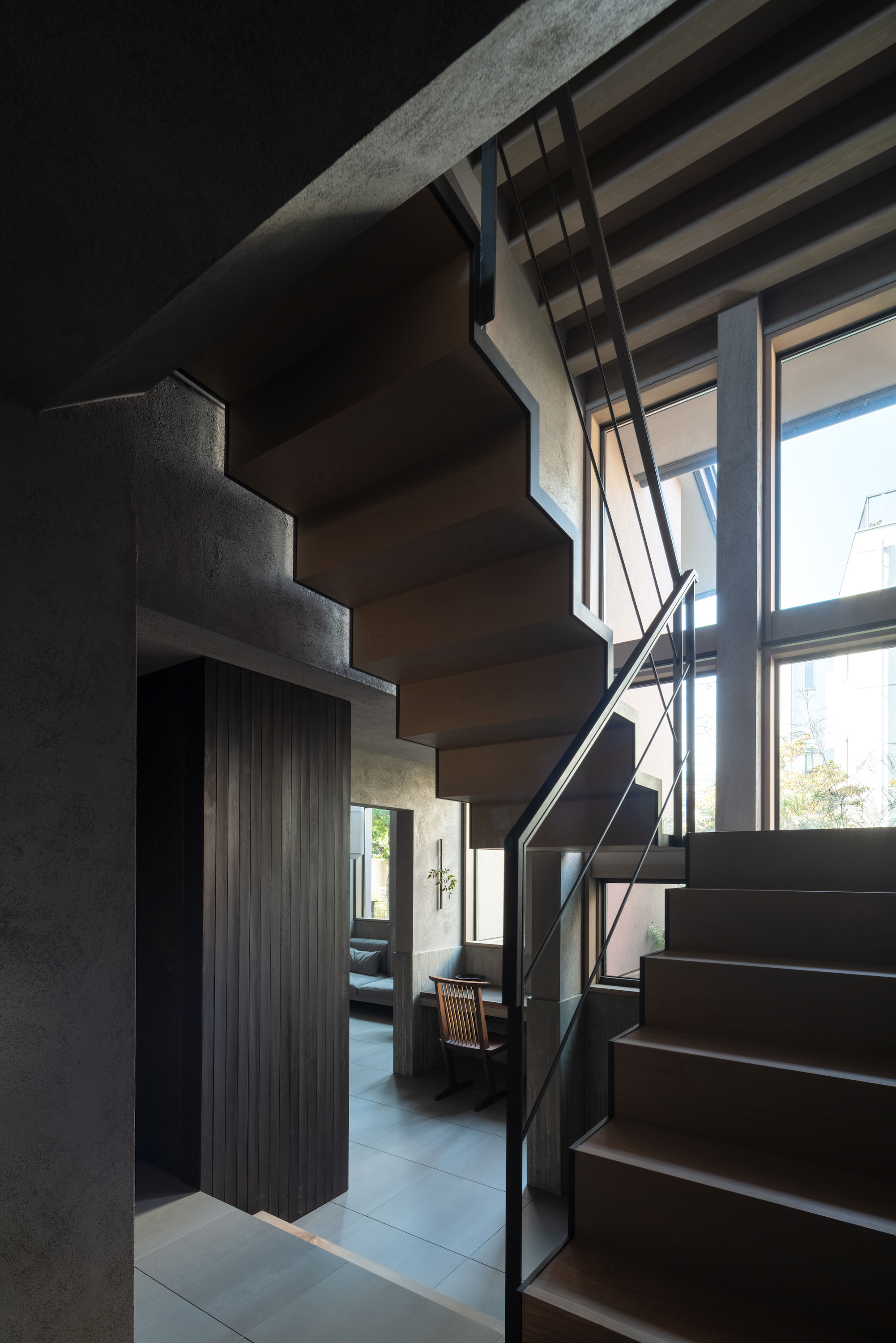 森田悠紀建築設計事務所による、東京の「上目黒の家」。往来のある緑道に面した敷地。内外の“適切な関係”の構築を求め、壁柱を並べて“視線の抜けを確保”しつつ“外からの斜めの視線を遮る”建築を考案。土地の様々な条件に応えた末に“回廊の様な空間”が立上がる1階から2階への階段 photo©西川公朗