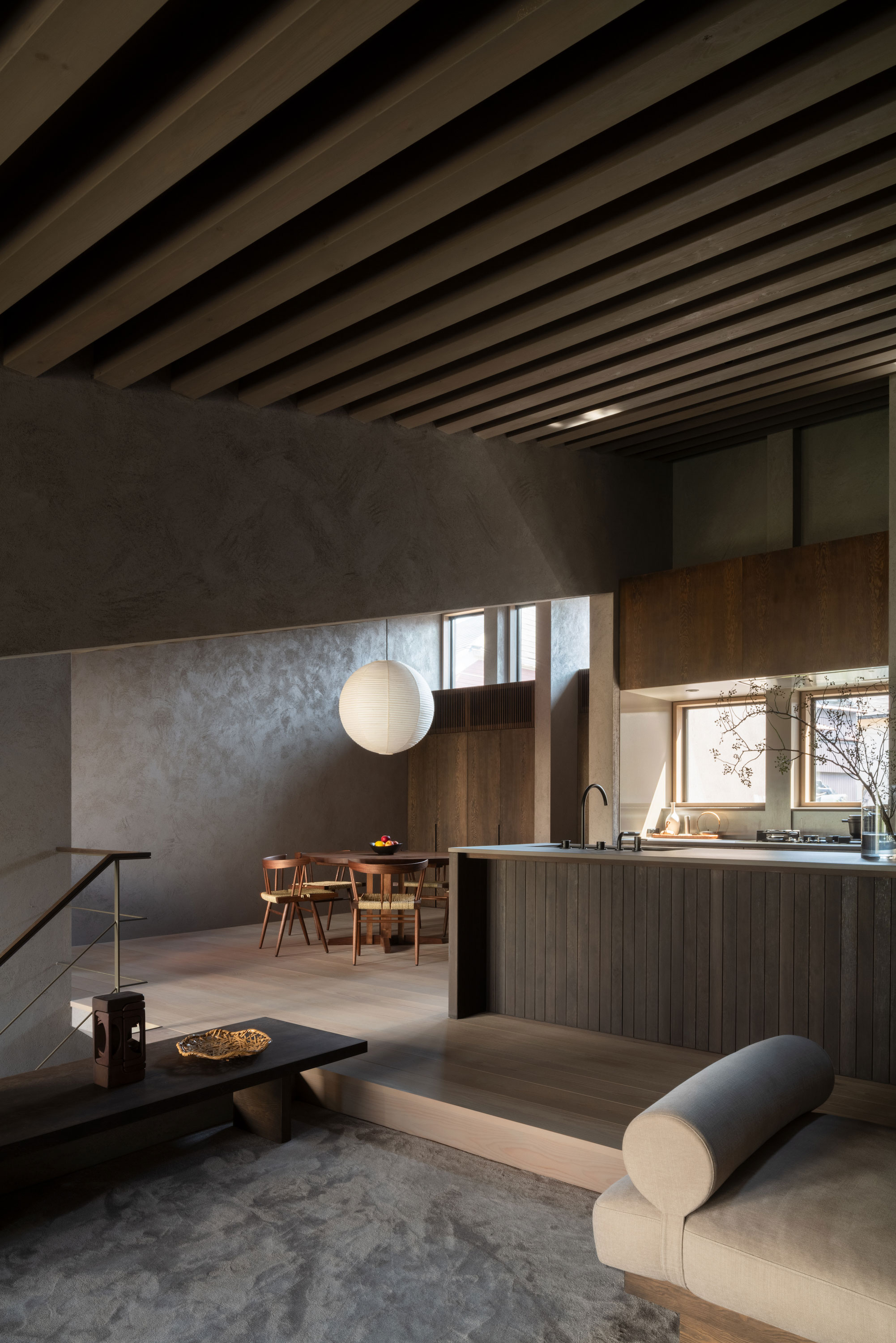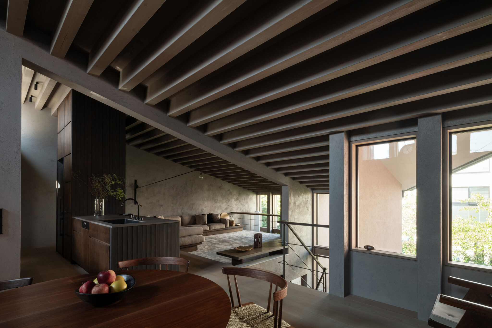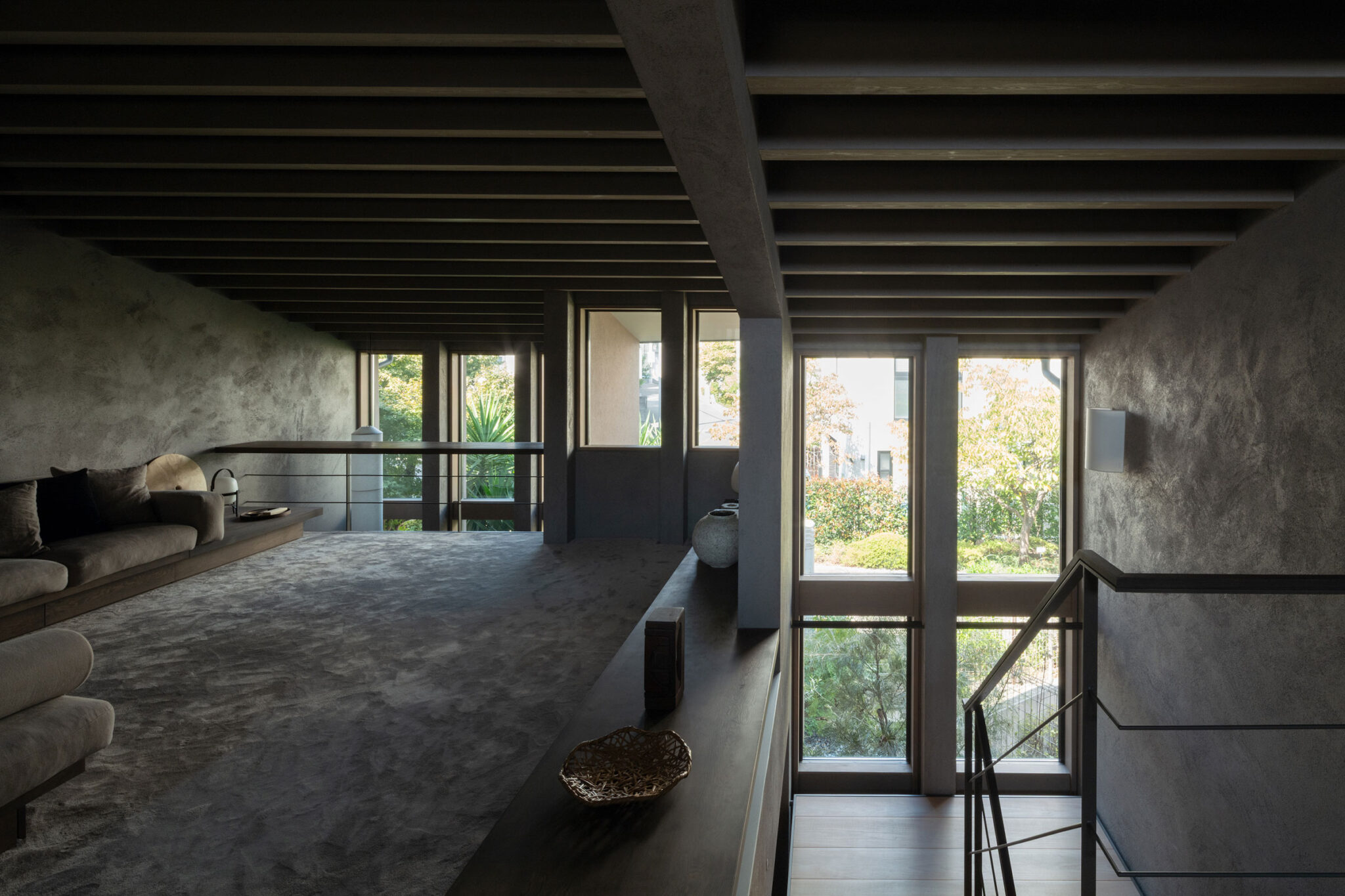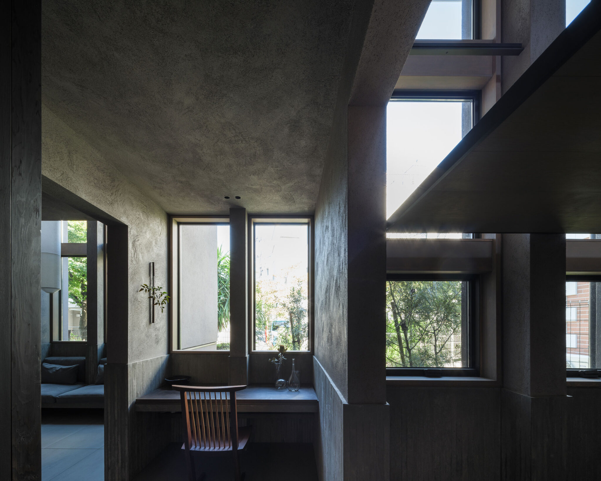 建主は、この家では時間の流れがゆっくりと感じられると語った。壁柱による奥行きのある開口は、緑道と室内という異なる領域を際立たせ、風に揺れる緑道の木々や人の動きを鮮明に切り取る。一方、内部の静けさはその対比によって引き立ち、洞窟の中から外界を眺めるような初源的な感覚と共に、意識は今という瞬間へ開かれていく。