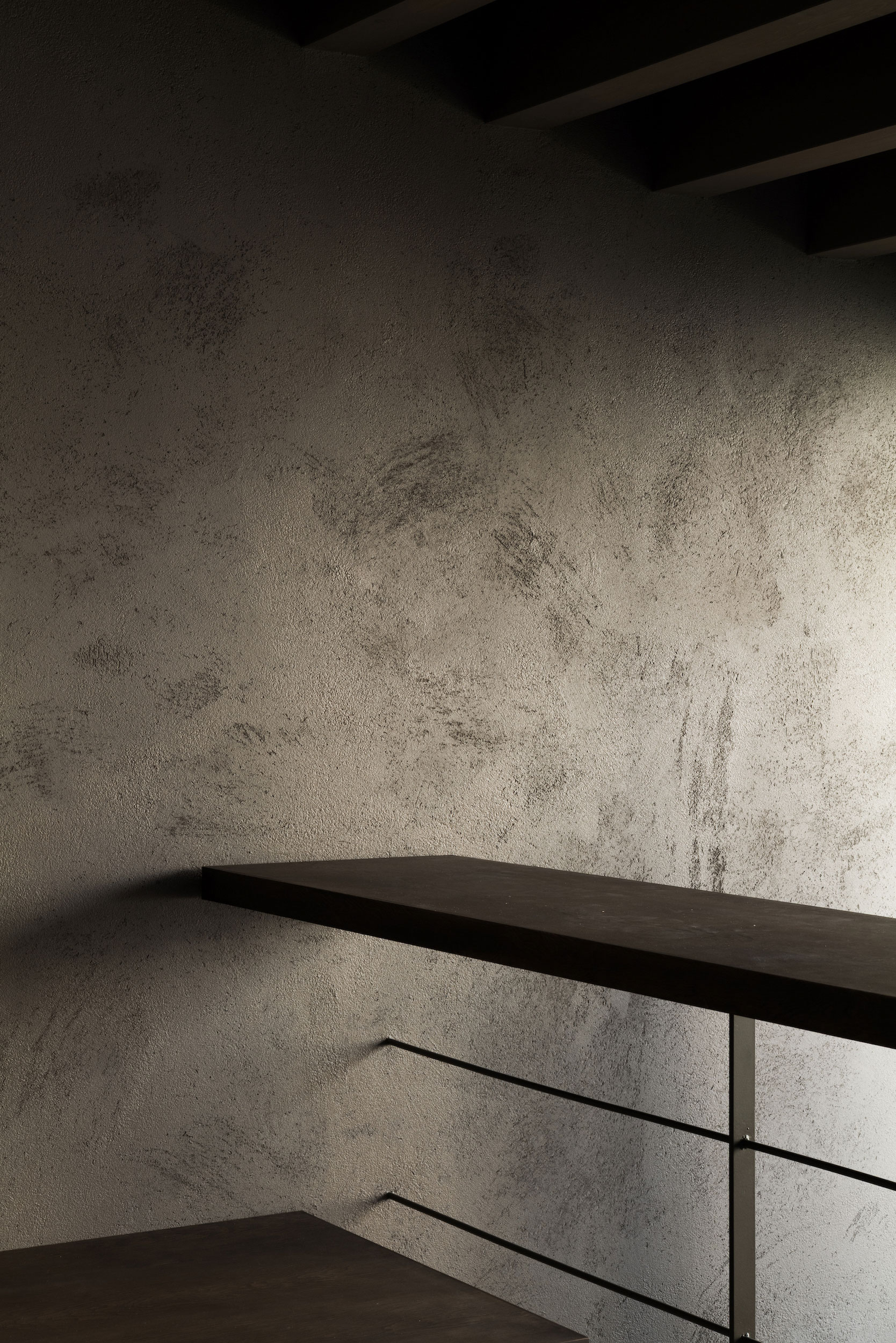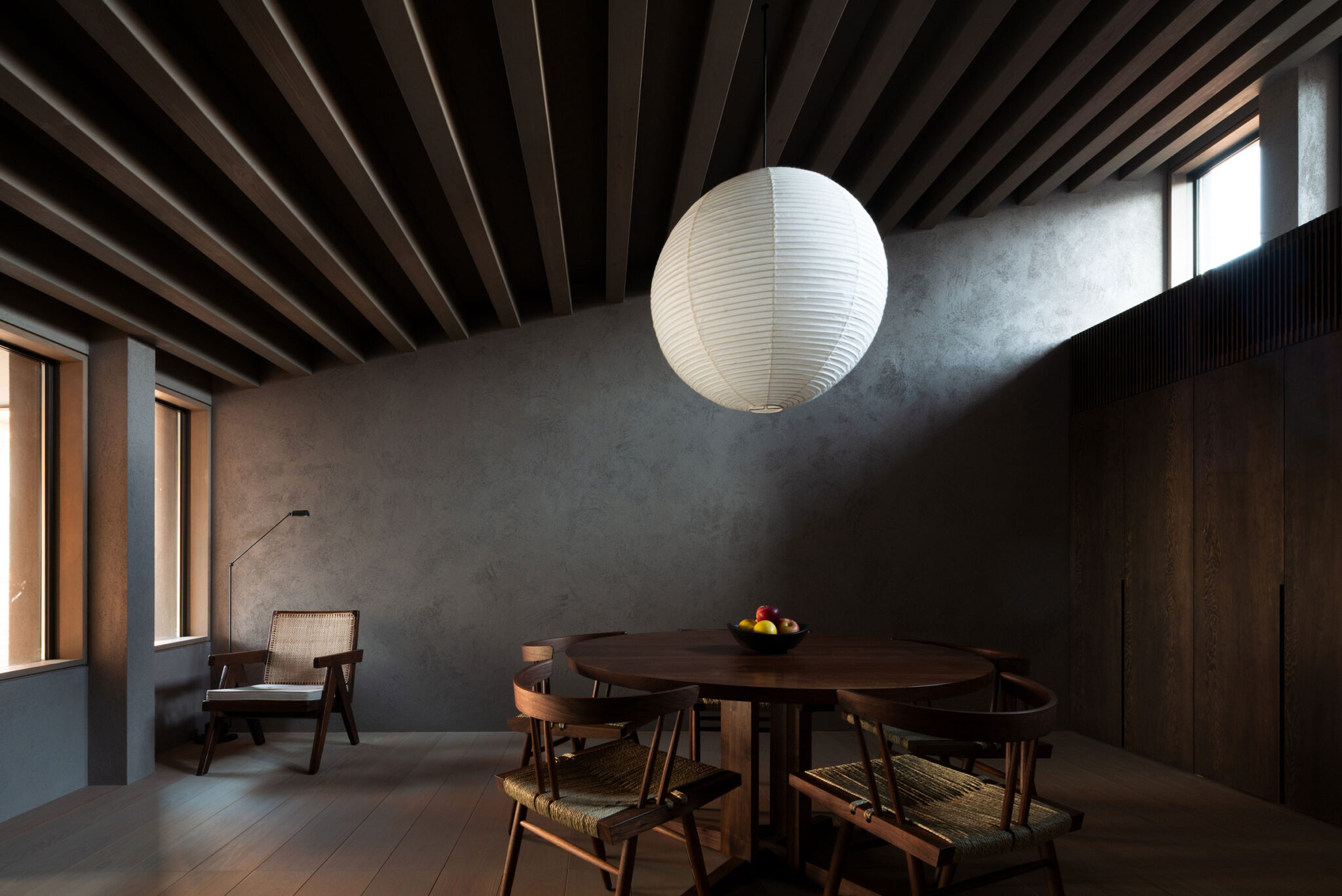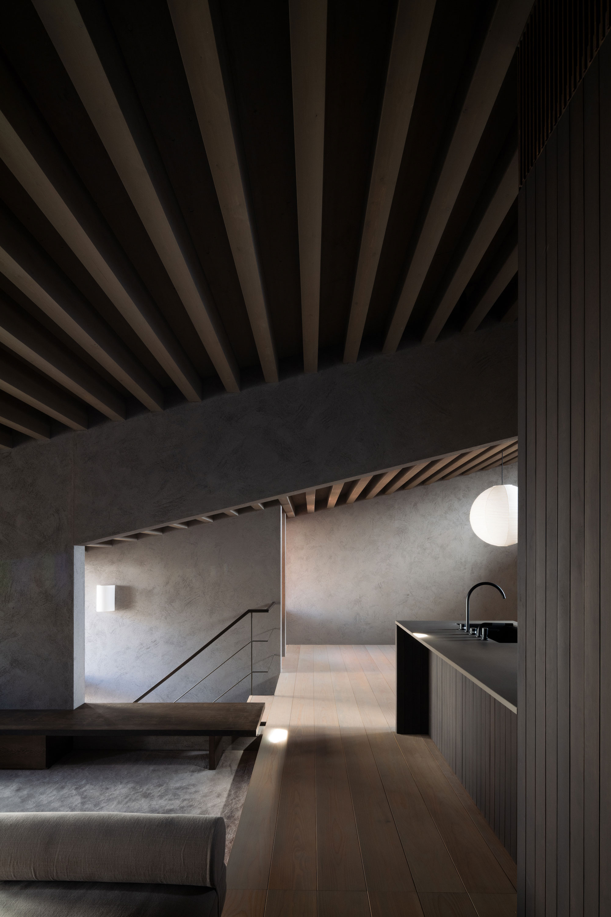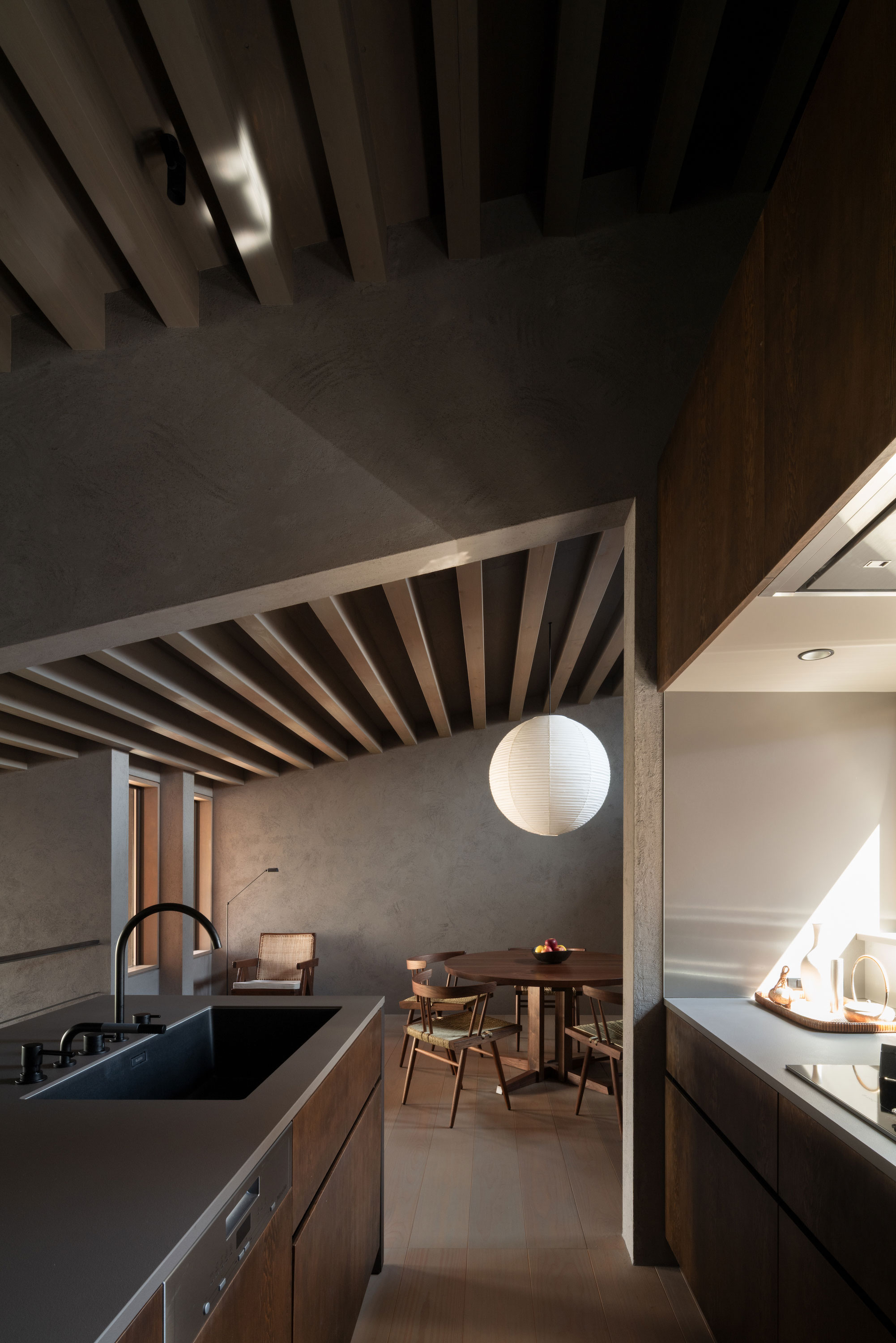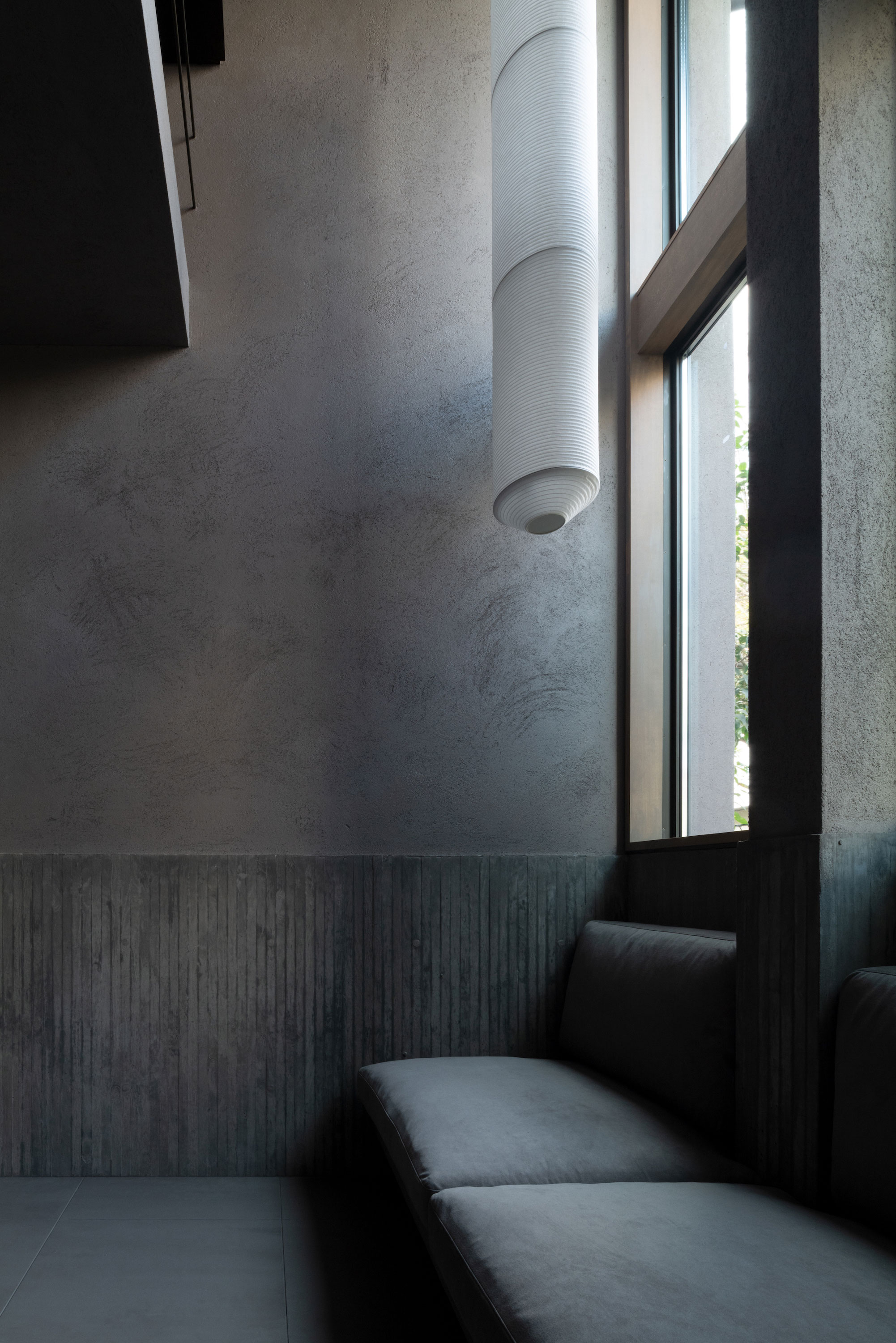 建主は、この家では時間の流れがゆっくりと感じられると語った。壁柱による奥行きのある開口は、緑道と室内という異なる領域を際立たせ、風に揺れる緑道の木々や人の動きを鮮明に切り取る。一方、内部の静けさはその対比によって引き立ち、洞窟の中から外界を眺めるような初源的な感覚と共に、意識は今という瞬間へ開かれていく。