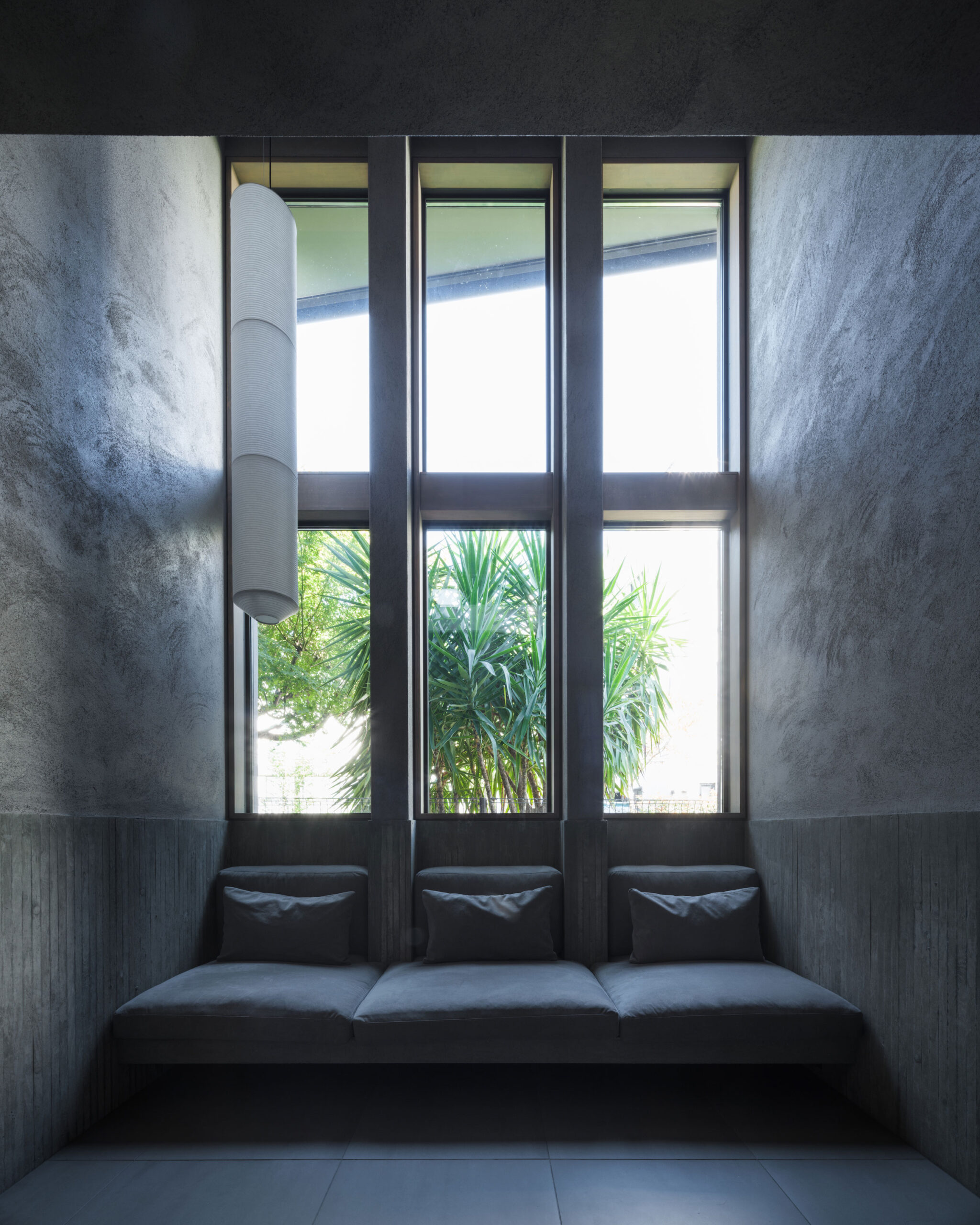 往来のある緑道に面した敷地での計画。建築家は、内外の“適切な関係”の構築を求め、壁柱を並べて“視線の抜けを確保”しつつ“外からの斜めの視線を遮る”建築を考案しました。また、土地の様々な条件に応えた末に“回廊の様な空間”が立上がりました。