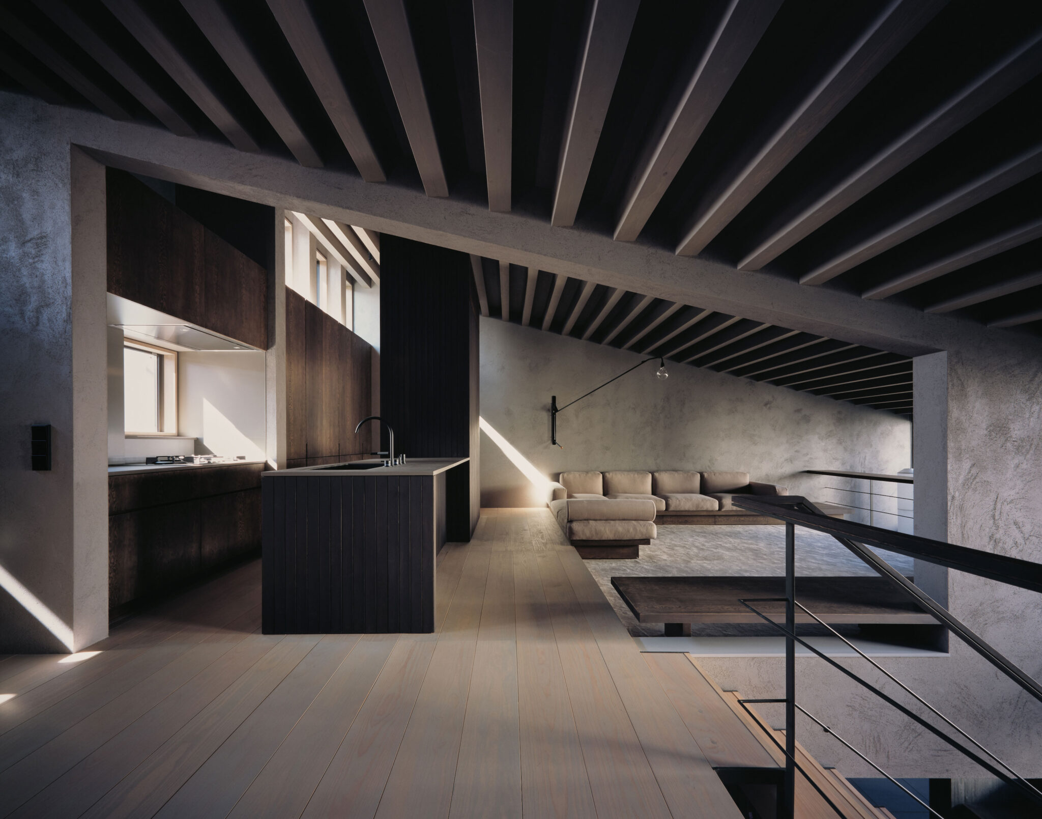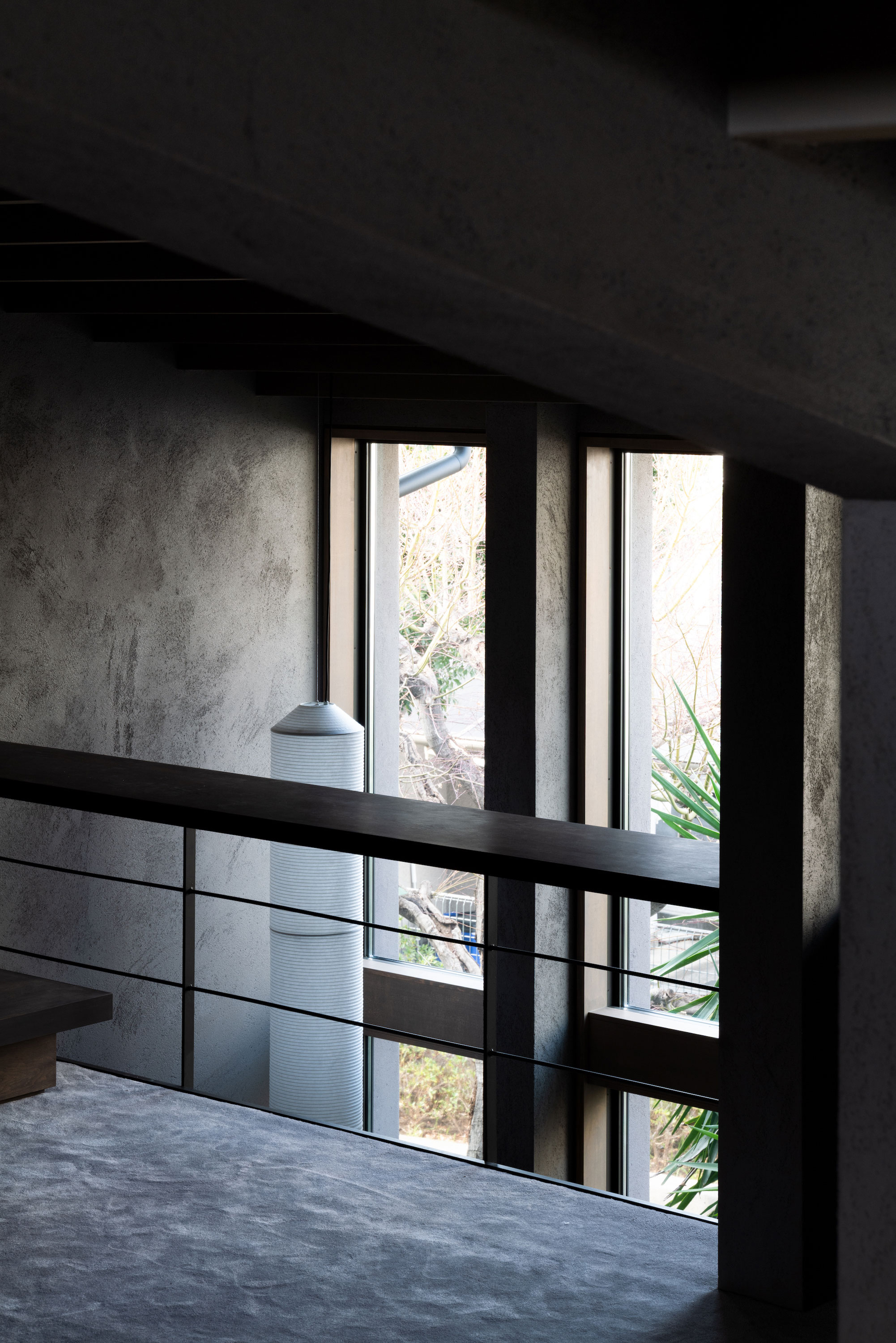 森田悠紀建築設計事務所による、東京の「上目黒の家」。往来のある緑道に面した敷地。内外の“適切な関係”の構築を求め、壁柱を並べて“視線の抜けを確保”しつつ“外からの斜めの視線を遮る”建築を考案。土地の様々な条件に応えた末に“回廊の様な空間”が立上がる2階、リビング、手摺 photo©西川公朗
