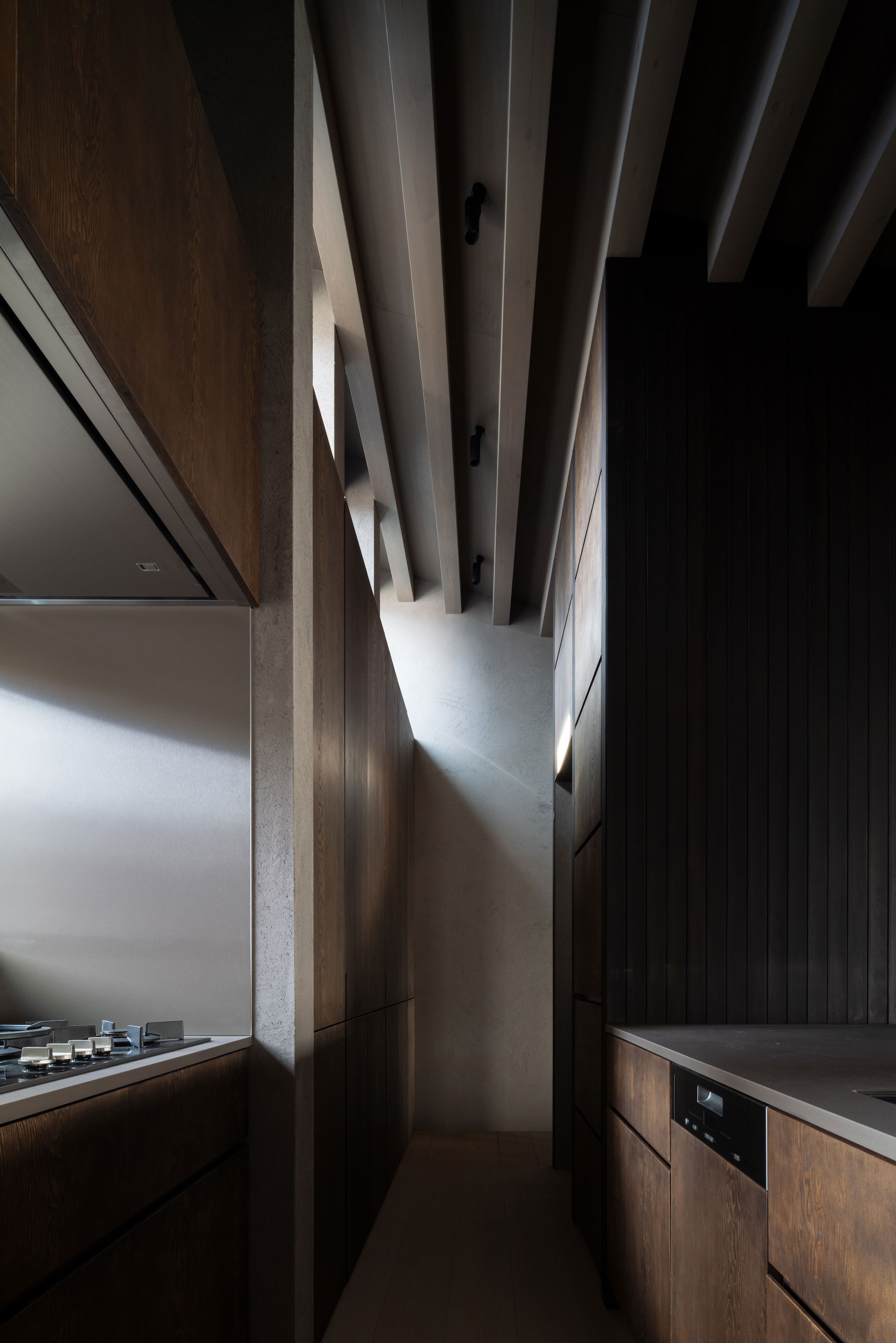 森田悠紀建築設計事務所による、東京の「上目黒の家」。往来のある緑道に面した敷地。内外の“適切な関係”の構築を求め、壁柱を並べて“視線の抜けを確保”しつつ“外からの斜めの視線を遮る”建築を考案。土地の様々な条件に応えた末に“回廊の様な空間”が立上がる2階、キッチン photo©西川公朗
