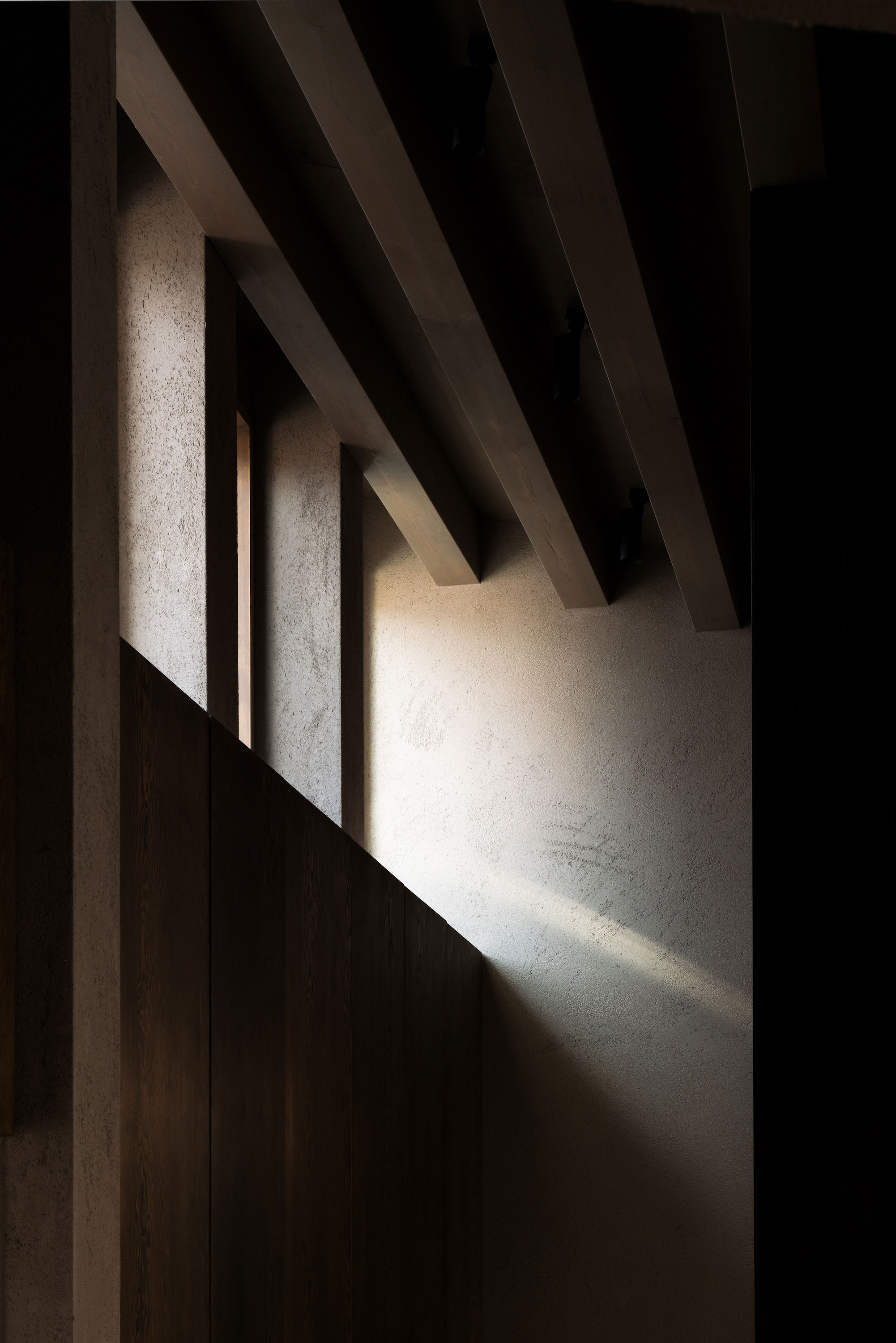 森田悠紀建築設計事務所による、東京の「上目黒の家」。往来のある緑道に面した敷地。内外の“適切な関係”の構築を求め、壁柱を並べて“視線の抜けを確保”しつつ“外からの斜めの視線を遮る”建築を考案。土地の様々な条件に応えた末に“回廊の様な空間”が立上がる1階、書斎から2階への階段を見る。 photo©西川公朗