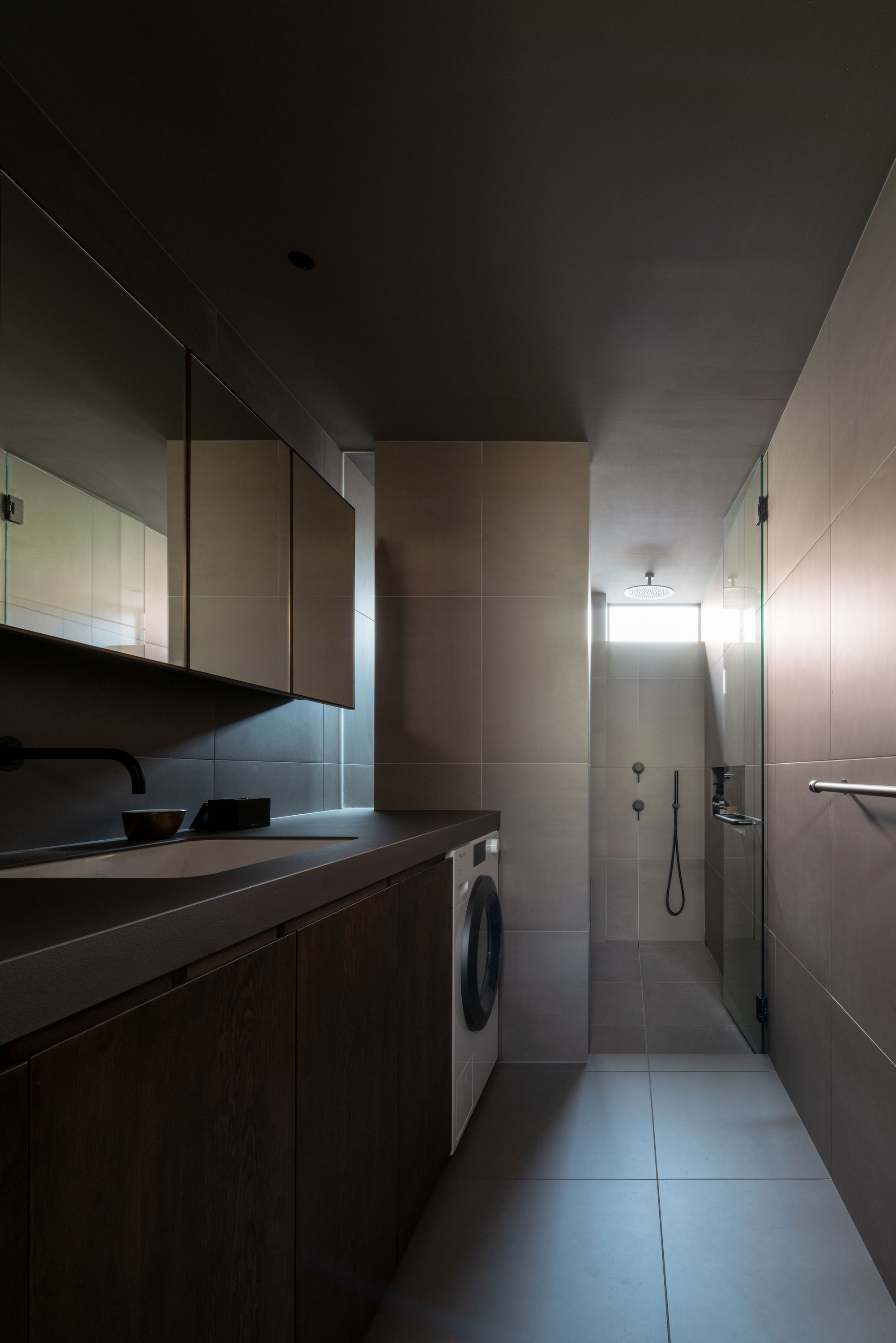 森田悠紀建築設計事務所による、東京の「上目黒の家」。往来のある緑道に面した敷地。内外の“適切な関係”の構築を求め、壁柱を並べて“視線の抜けを確保”しつつ“外からの斜めの視線を遮る”建築を考案。土地の様々な条件に応えた末に“回廊の様な空間”が立上がる1階、洗面から浴室を見る。 photo©西川公朗