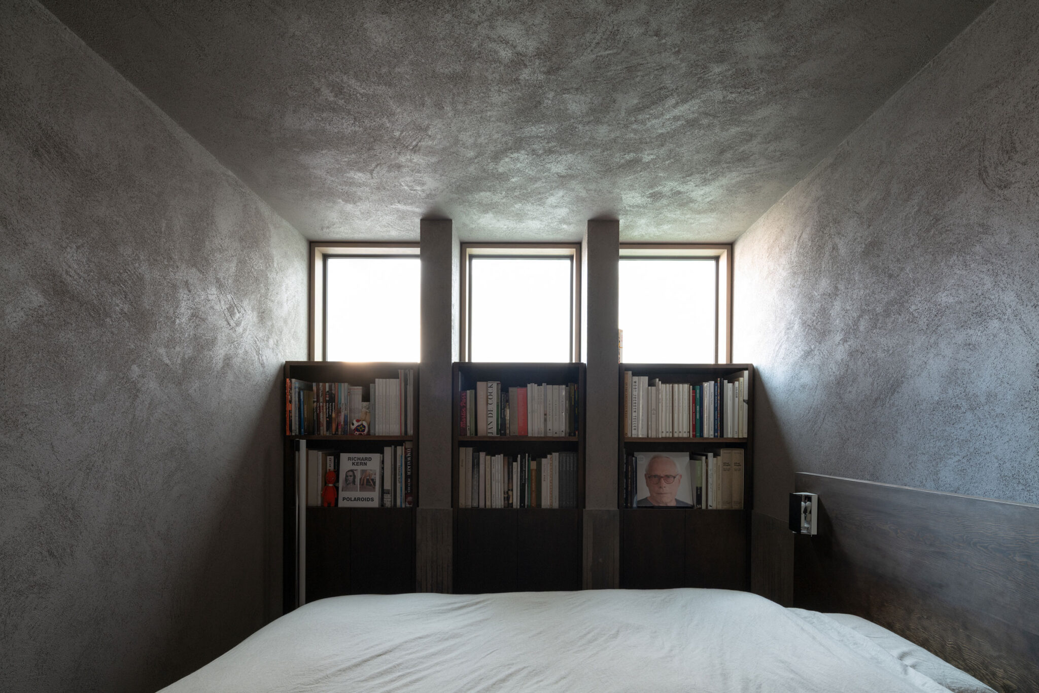 森田悠紀建築設計事務所による、東京の「上目黒の家」。往来のある緑道に面した敷地。内外の“適切な関係”の構築を求め、壁柱を並べて“視線の抜けを確保”しつつ“外からの斜めの視線を遮る”建築を考案。土地の様々な条件に応えた末に“回廊の様な空間”が立上がる1階、寝室 photo©西川公朗