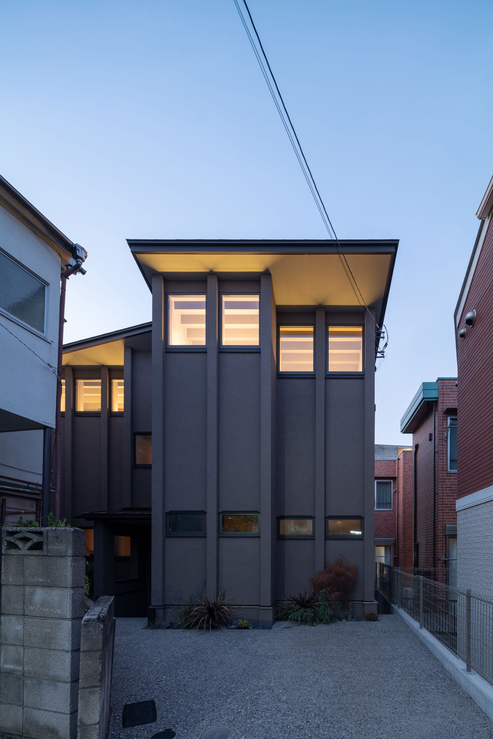 森田悠紀建築設計事務所による、東京の「上目黒の家」。往来のある緑道に面した敷地。内外の“適切な関係”の構築を求め、壁柱を並べて“視線の抜けを確保”しつつ“外からの斜めの視線を遮る”建築を考案。土地の様々な条件に応えた末に“回廊の様な空間”が立上がる外観、南側の道路より見る。夕景 photo©西川公朗
