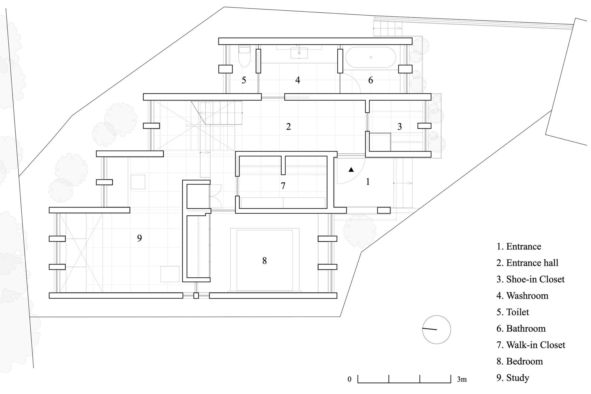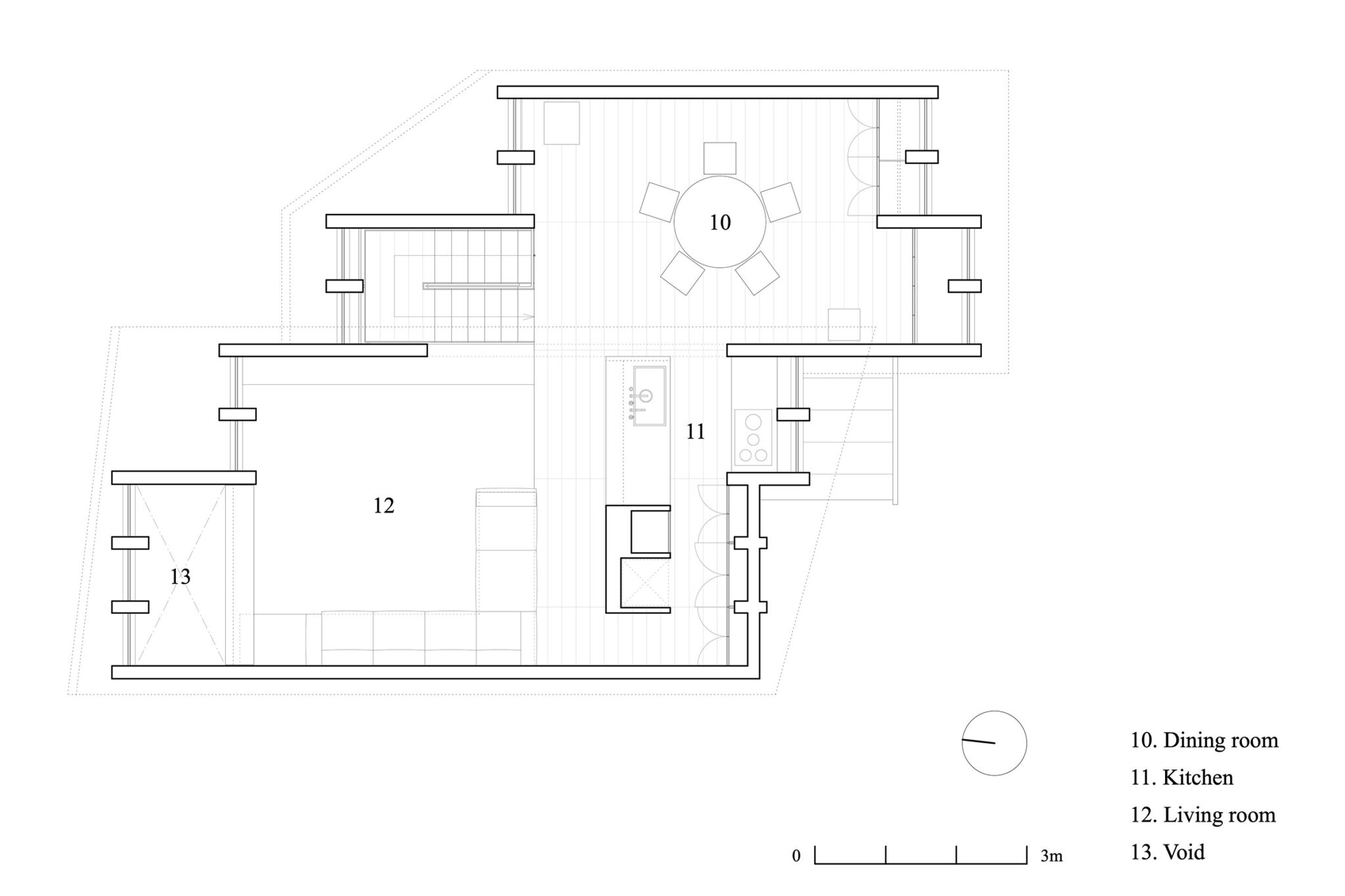 同時に壁柱は構造上の要となり、半間間隔の柱割りは耐熱強化ガラスによる大きな開口を可能にしている。平面は不整形な敷地に沿うように雁行させ、敷地形状がもつ対角線方向の抜けを活かした。