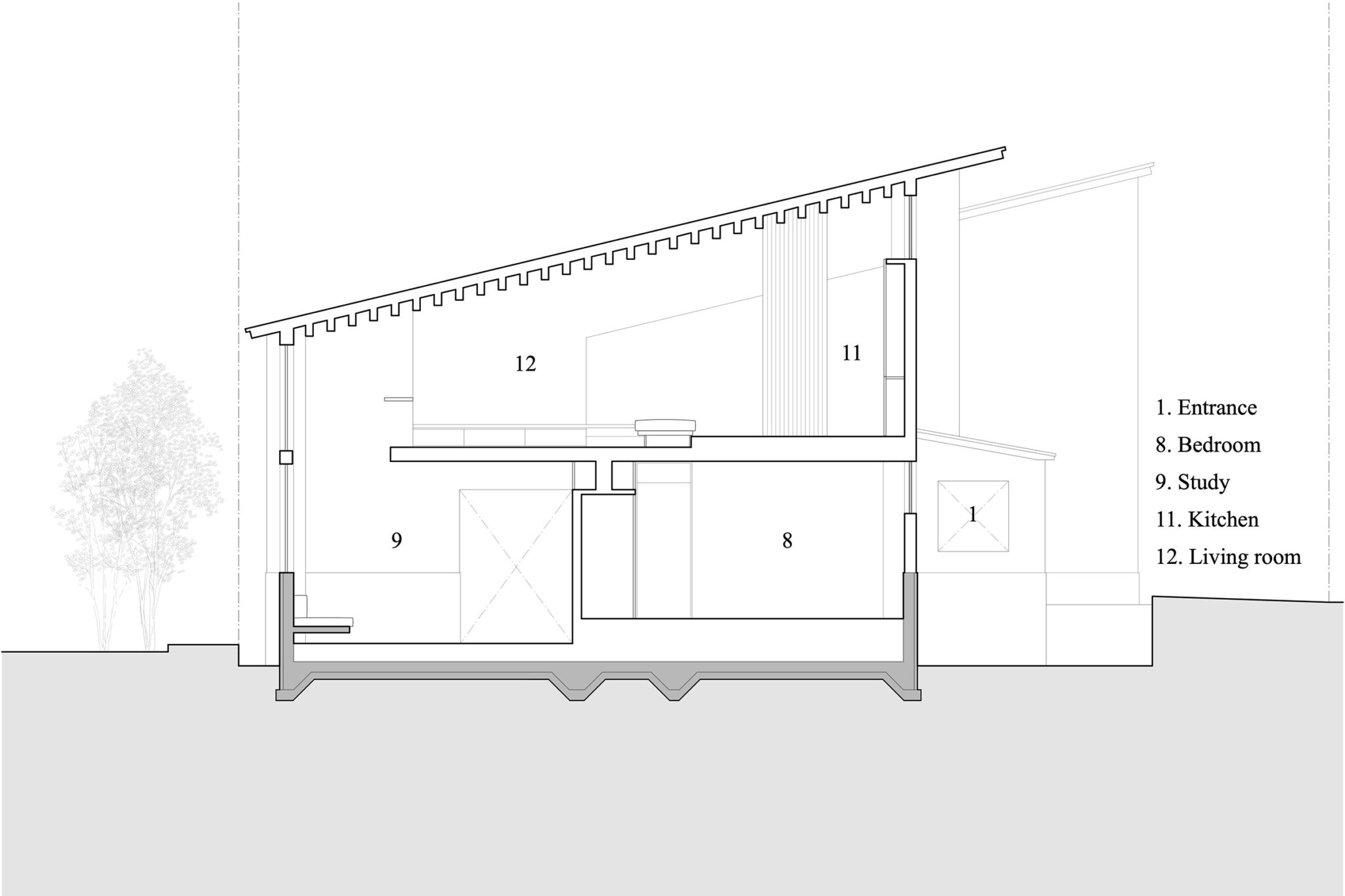 断面計画では地形に呼応し、緑道へ視線を導く2枚の屋根を架け、厳しい斜線制限を躱しつつ、低い軒で北側建物からの視線を遮り、落ち着いたスケール感を実現した。また敷地は内水氾濫による浸水が想定されているため、高基礎にしながらも、量塊感のあるコンクリートで内部を囲い込むことによる安心感をもたらした。