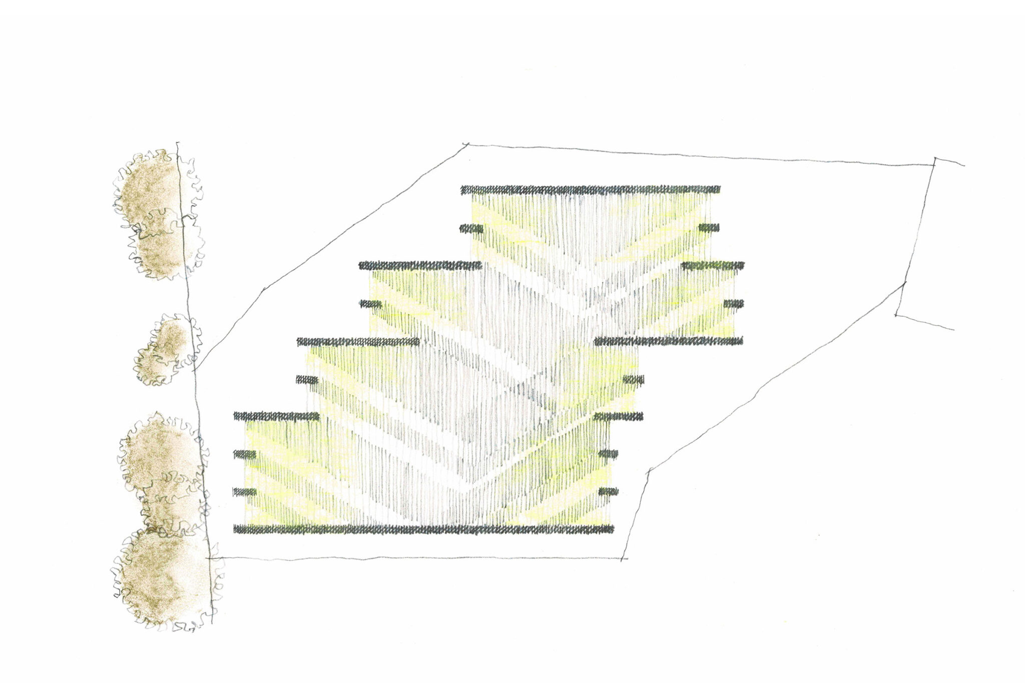 そこで緑道に直交する壁柱の列柱を設け、壁柱に沿った視線の抜けを確保しつつ斜め方向の視線を遮ることで、守られながら開かれる空間を目指した。