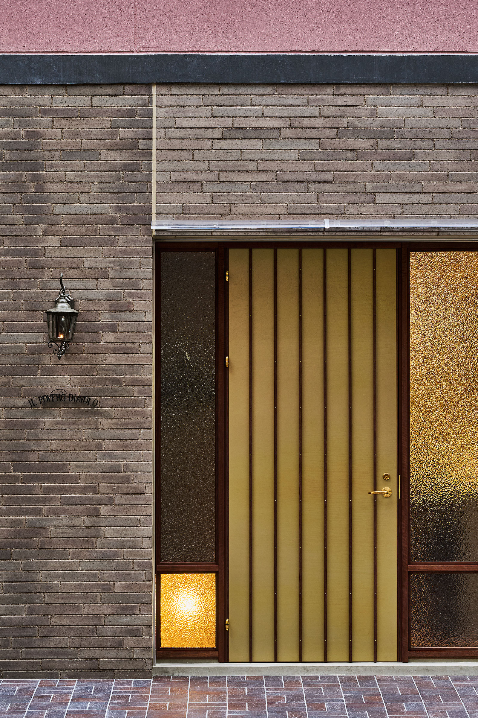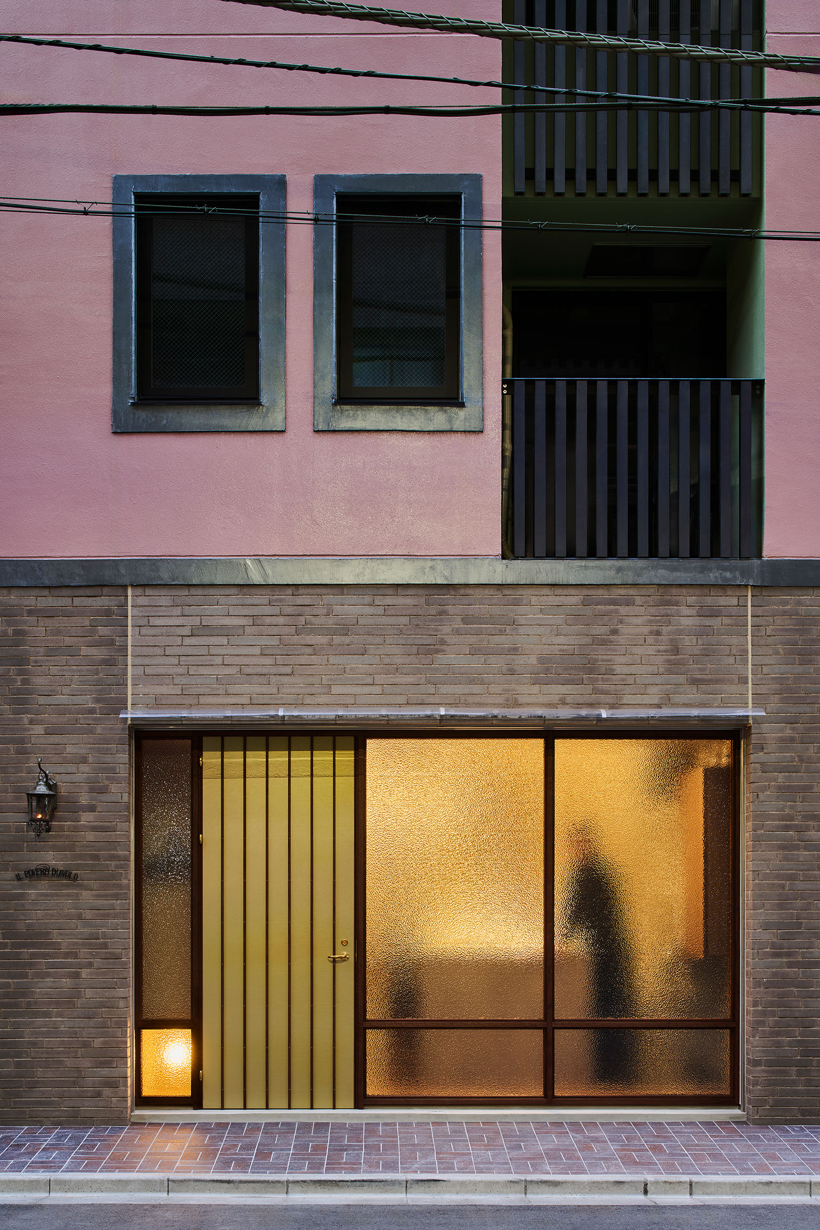 今津康夫 / ninkipen!による、東京・日本橋の飲食店「IL POVERO DIAVOLO TOKYO」。夜は静かになるエリアでの計画。来訪時に“安心感と期待感”を提供する為、シェフ達の振舞を“型板ガラス”越しに伝える“行燈の様に光るファサード”を考案。内部では大きな“シェフズテーブル”が一体感を生む外観、北東側の道路よりエントランスドアを見る。 photo©河田弘樹