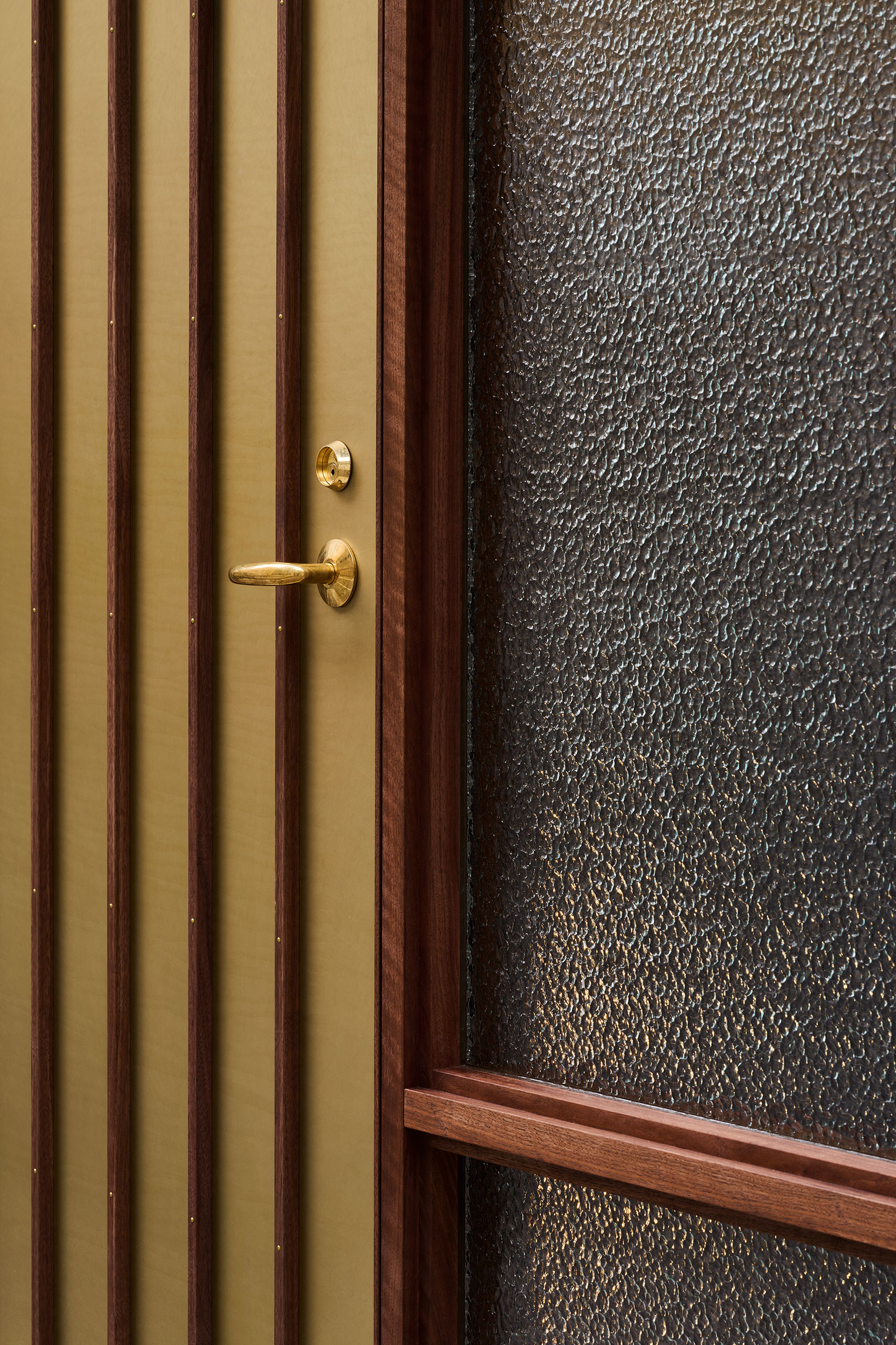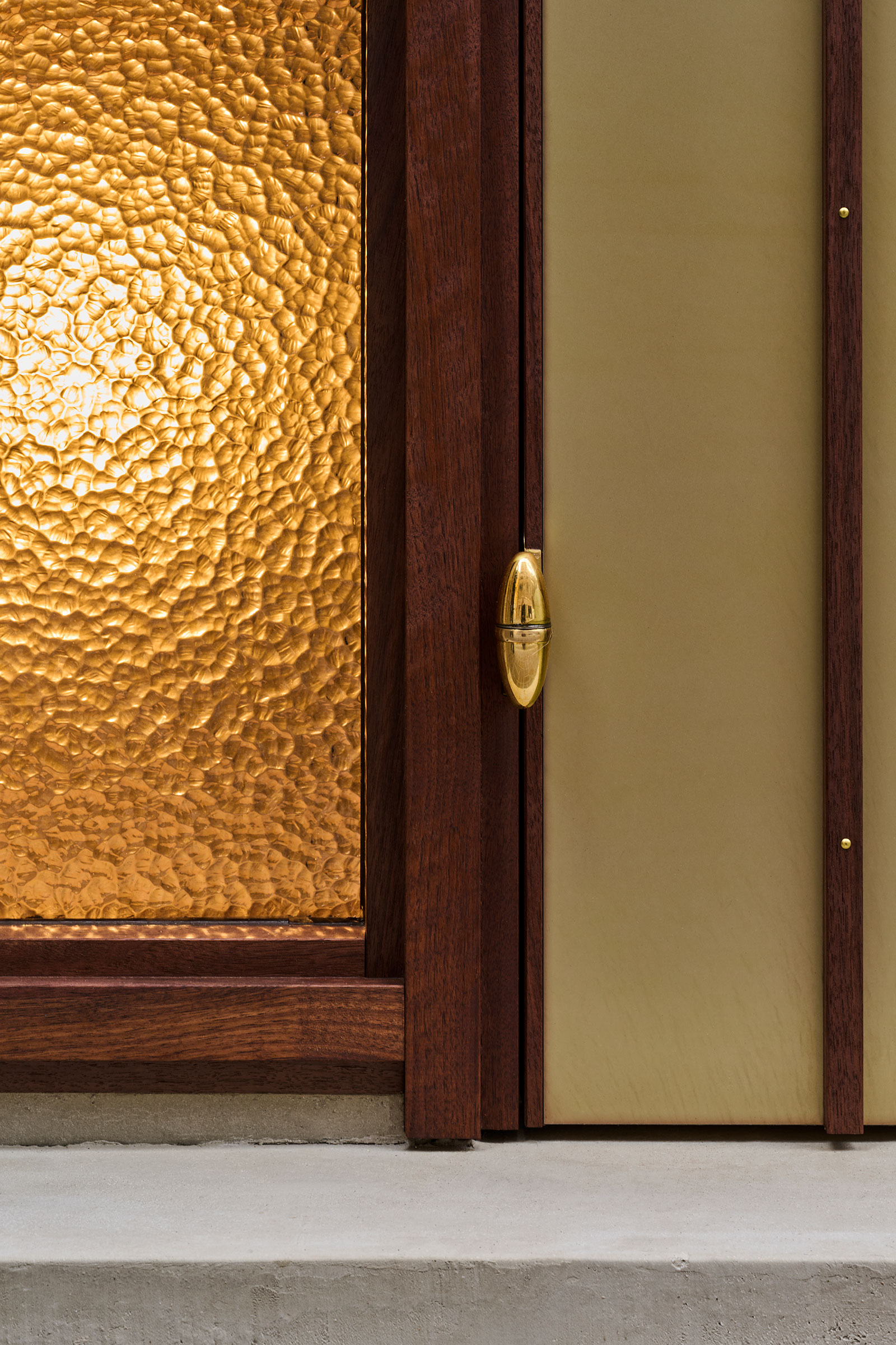 今津康夫 / ninkipen!による、東京・日本橋の飲食店「IL POVERO DIAVOLO TOKYO」。夜は静かになるエリアでの計画。来訪時に“安心感と期待感”を提供する為、シェフ達の振舞を“型板ガラス”越しに伝える“行燈の様に光るファサード”を考案。内部では大きな“シェフズテーブル”が一体感を生む外観、建具の詳細 photo©河田弘樹