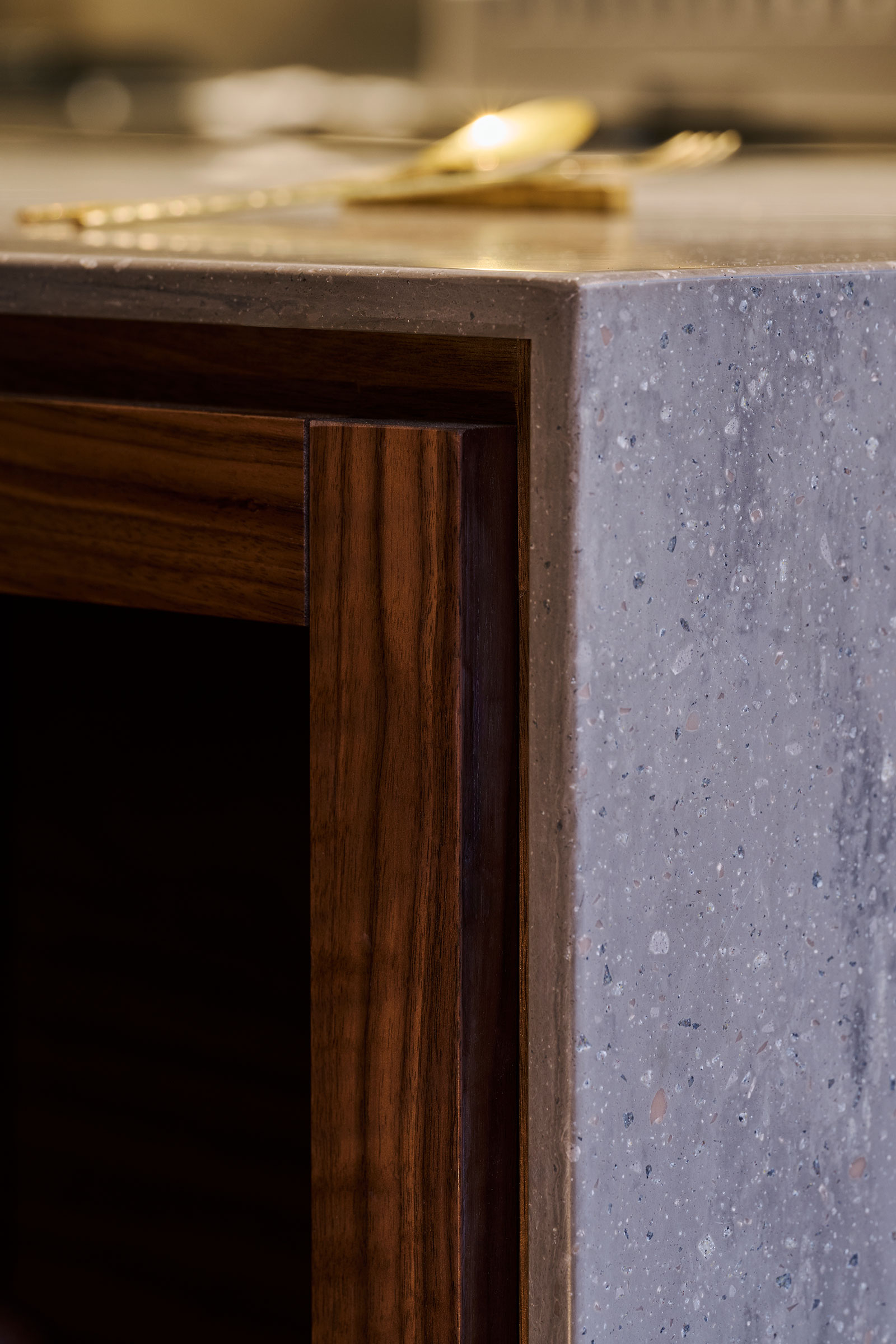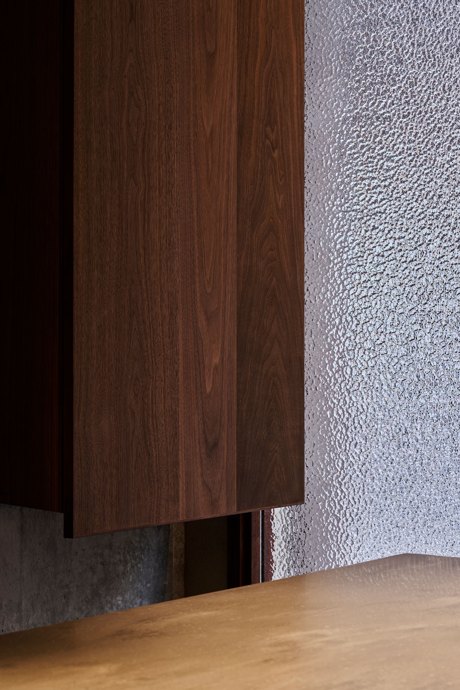 今津康夫 / ninkipen!による、東京・日本橋の飲食店「IL POVERO DIAVOLO TOKYO」。夜は静かになるエリアでの計画。来訪時に“安心感と期待感”を提供する為、シェフ達の振舞を“型板ガラス”越しに伝える“行燈の様に光るファサード”を考案。内部では大きな“シェフズテーブル”が一体感を生むキッチン、キャビネットの詳細 photo©河田弘樹