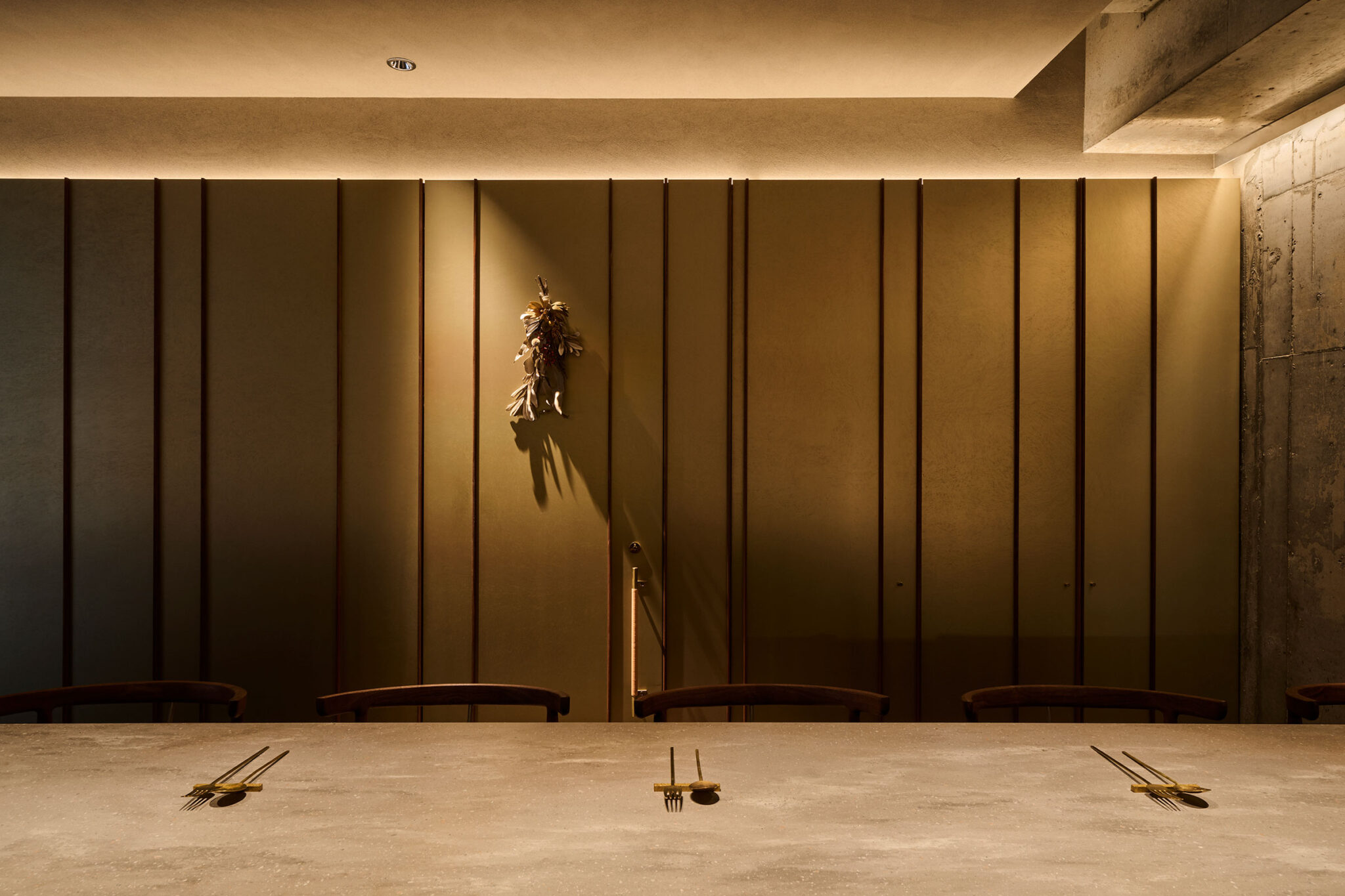 夜は静かになるエリアでの計画です。建築家は、来訪時に“安心感と期待感”を提供する為、シェフ達の振舞を“型板ガラス”越しに伝える“行燈の様に光るファサード”を考案しました。また、内部では大きな“シェフズテーブル”が一体感を生み出します。店舗の場所はこちら(Google Map)。