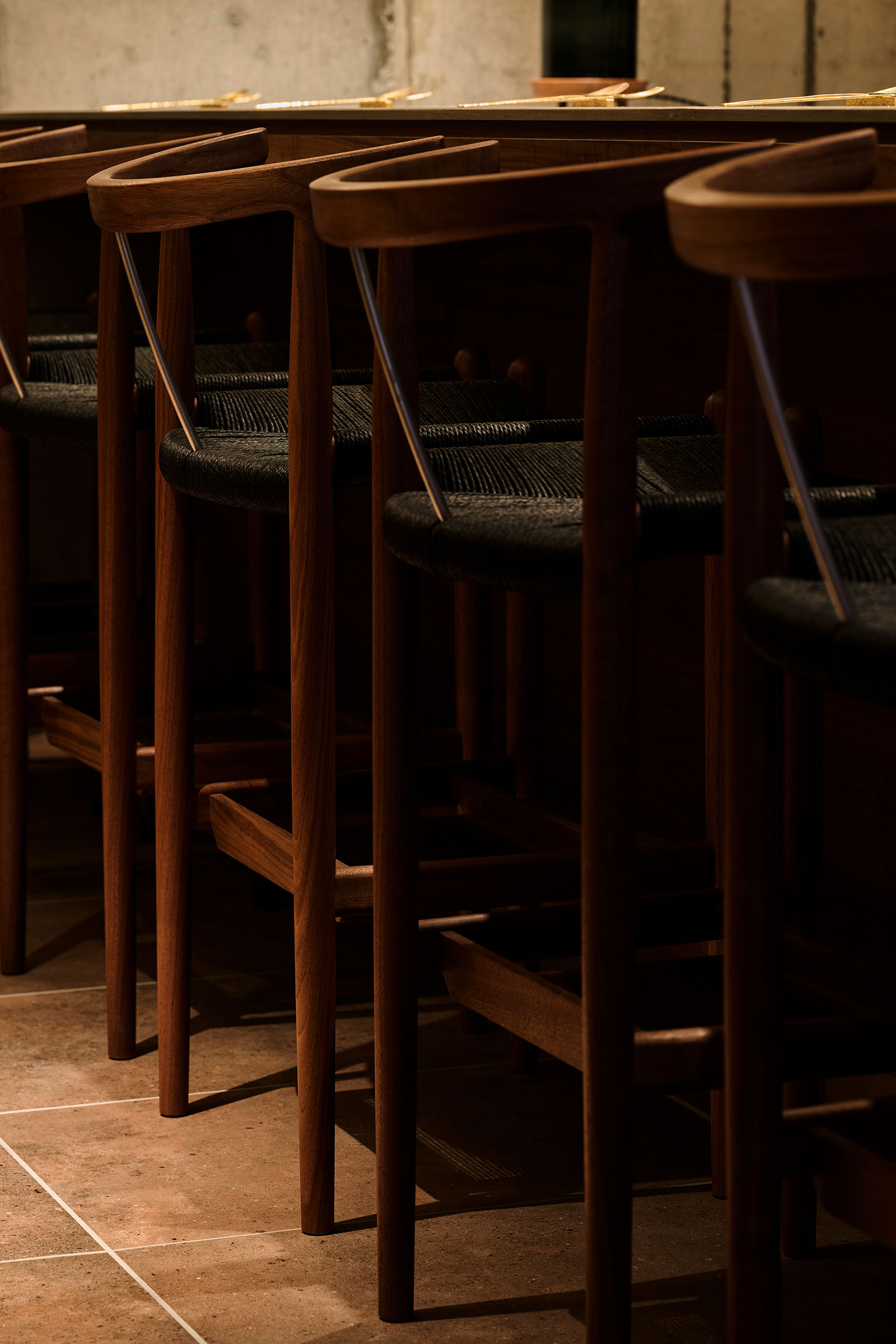 今津康夫 / ninkipen!による、東京・日本橋の飲食店「IL POVERO DIAVOLO TOKYO」。夜は静かになるエリアでの計画。来訪時に“安心感と期待感”を提供する為、シェフ達の振舞を“型板ガラス”越しに伝える“行燈の様に光るファサード”を考案。内部では大きな“シェフズテーブル”が一体感を生む客席、家具の詳細 photo©河田弘樹