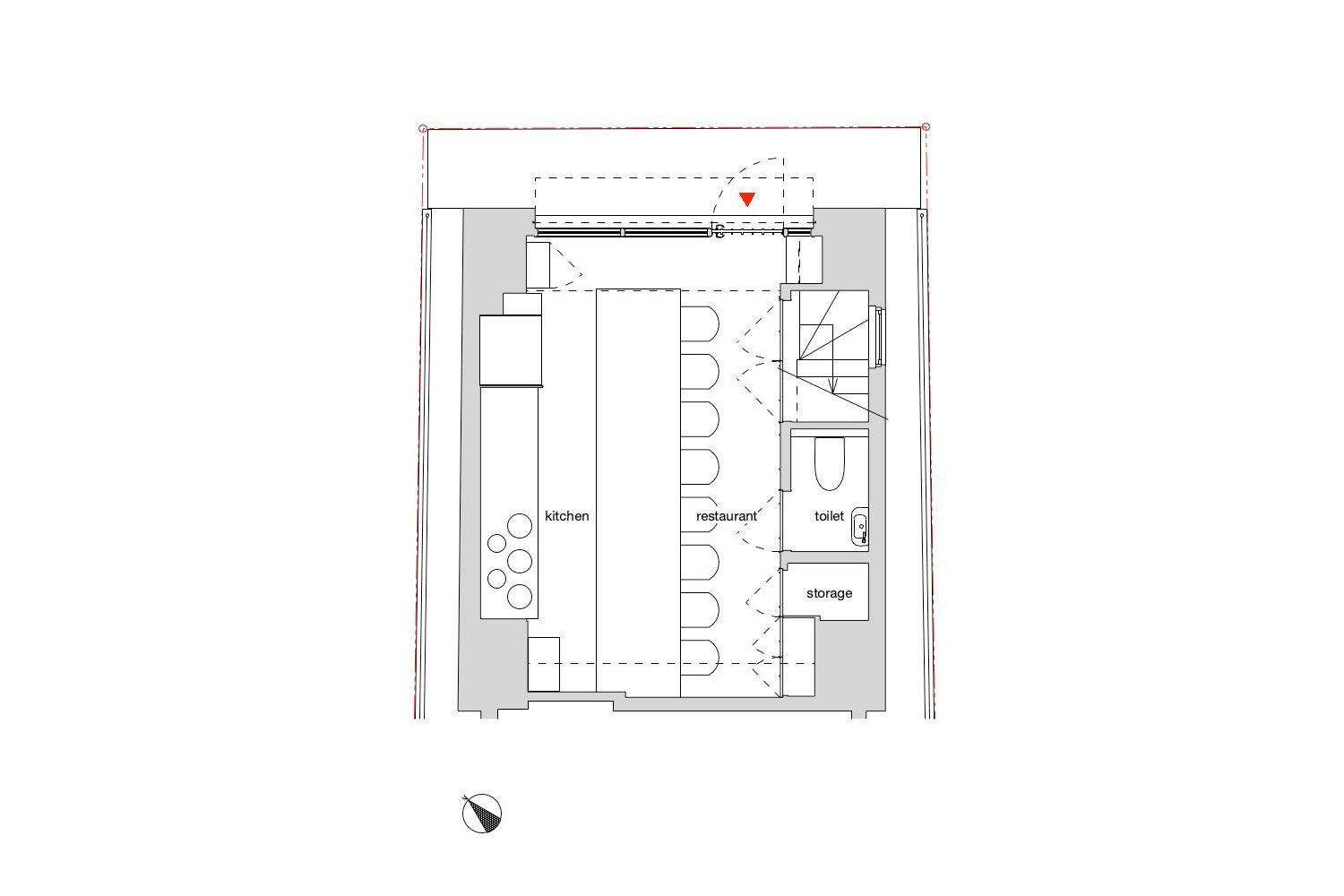 今津康夫 / ninkipen!による、東京・日本橋の飲食店「IL POVERO DIAVOLO TOKYO」。夜は静かになるエリアでの計画。来訪時に“安心感と期待感”を提供する為、シェフ達の振舞を“型板ガラス”越しに伝える“行燈の様に光るファサード”を考案。内部では大きな“シェフズテーブル”が一体感を生む平面図 image©ninkipen!