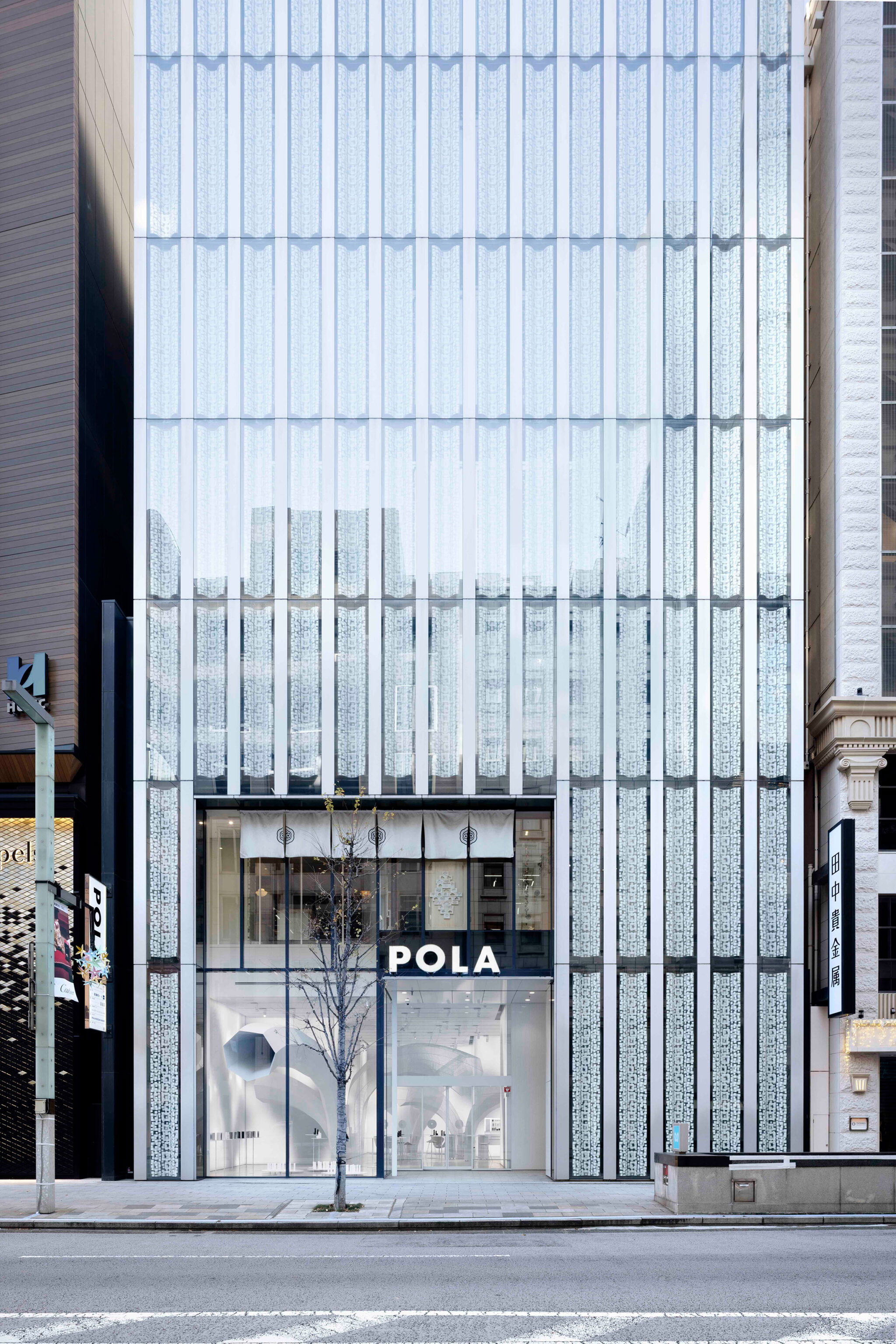 妹島和世による、東京・銀座の店舗「ポーラ ギンザ」。化粧品メーカー“ポーラ”の旗艦店。1階の店舗フロアは、“花や植物”に包まれた“森のような新しい庭”として構想。地下1階のエステフロアは、自分を開放する深い旅へと導く“静謐な空間”とする南東側の道路より店舗が入る建物全体を見る。 写真:新津保建秀