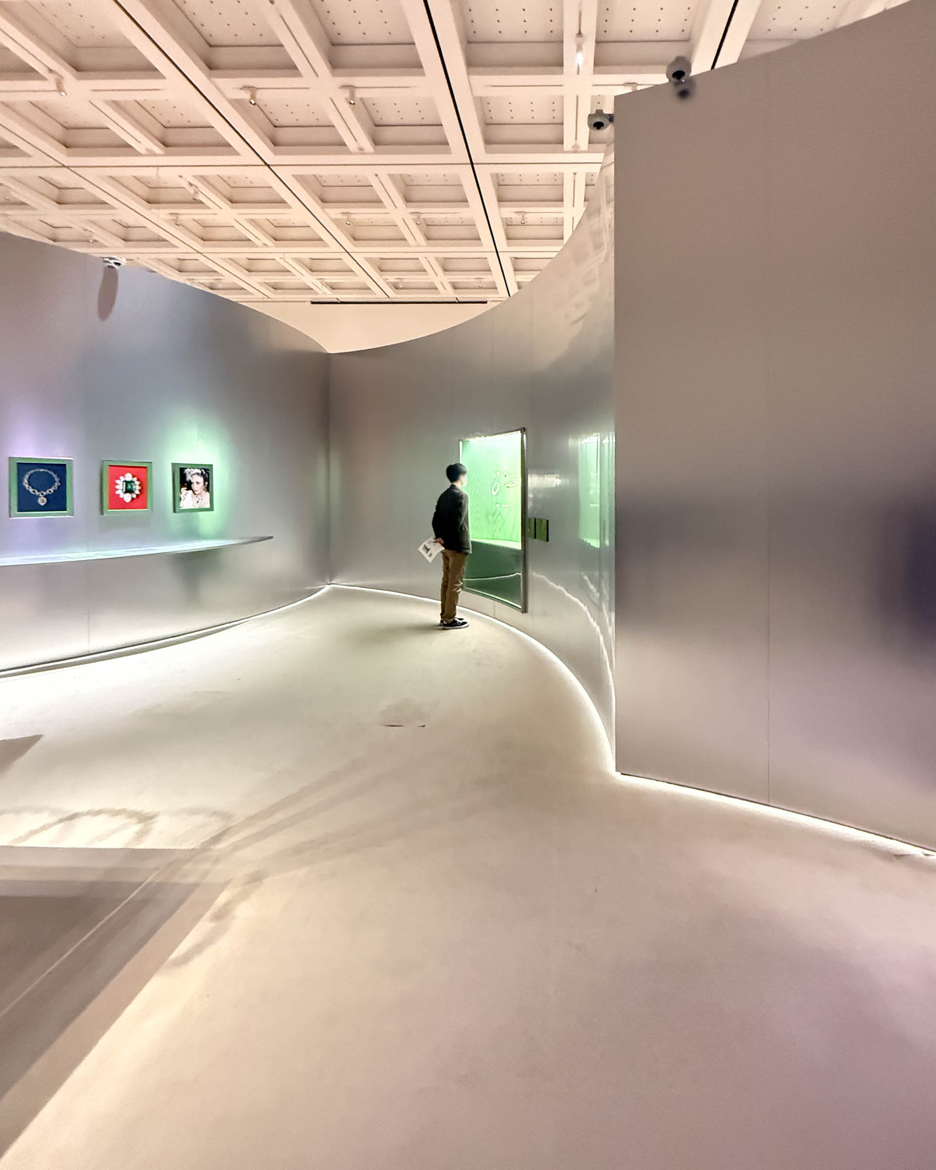 多様な視点で分類されたブルガリの宝飾品のみならず、アーティストの作品や、映像などを、整理して、適切な空間で見せるということに、この多様な仕上げが見事に応えている、、、!