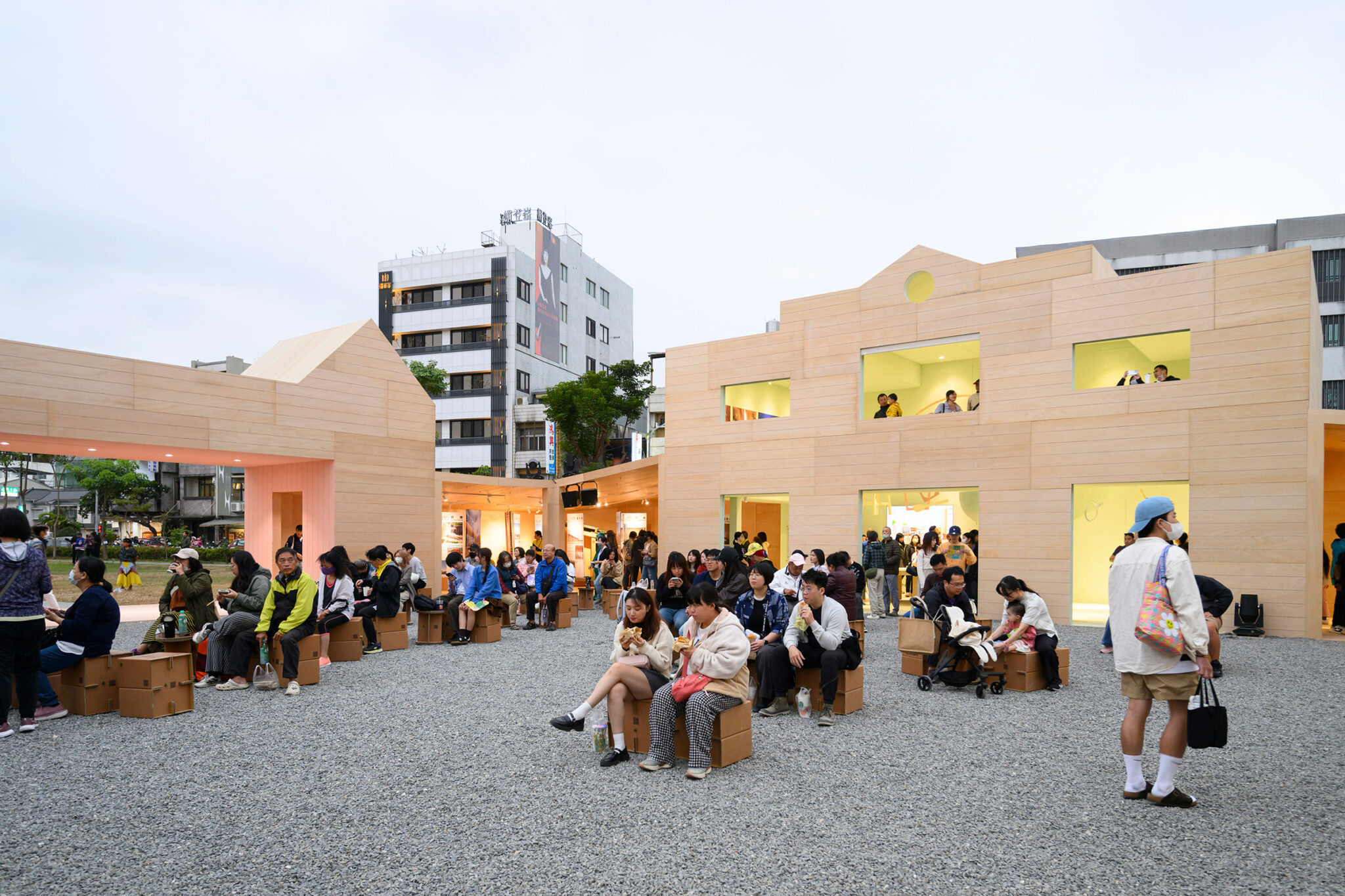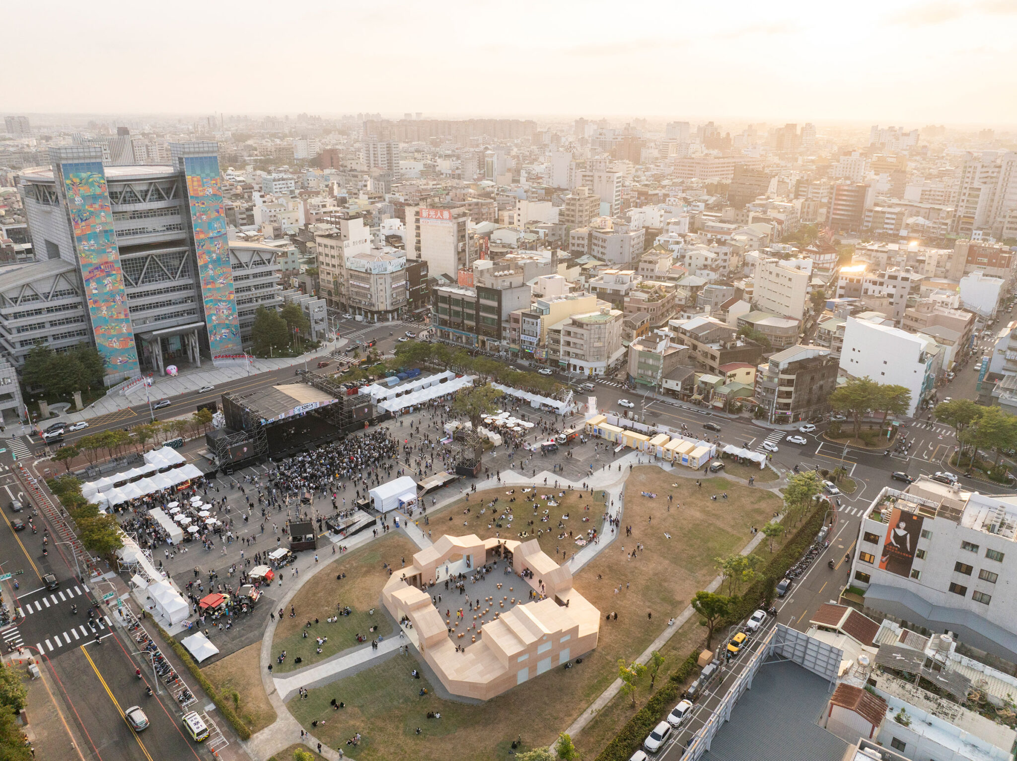 台湾・嘉義市の創設321周年記念祝賀行事のために、MVRDVは、木材の製造・工芸・建設に関する展示を収容した仮設の木造パヴィリオンを完成させました。嘉義市庁舎の向かいに位置する、ウッデン・ワンダーズ・パヴィリオンは、正方形の中庭を囲む構成となっており、その外周構造の形状は、同市の木造建築の遺産に関する綿密な調査に基づいています。本プロジェクトは、12月12日から28日(※2025年)までの嘉義の記念祝賀行事を通して公開され、市民が集い、都市の遺産について学び、嘉義の「木の未来」について語り合う場を提供します。