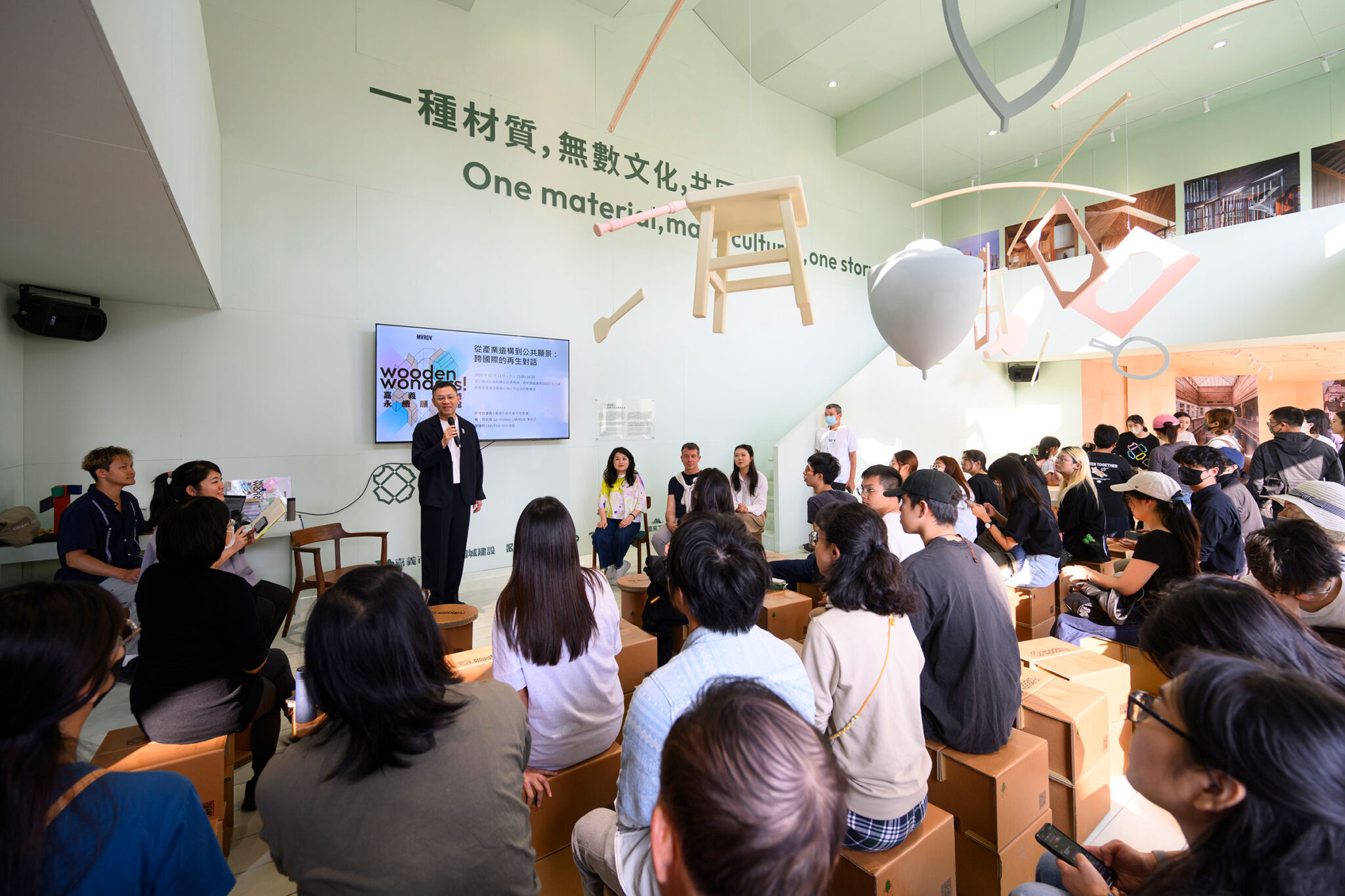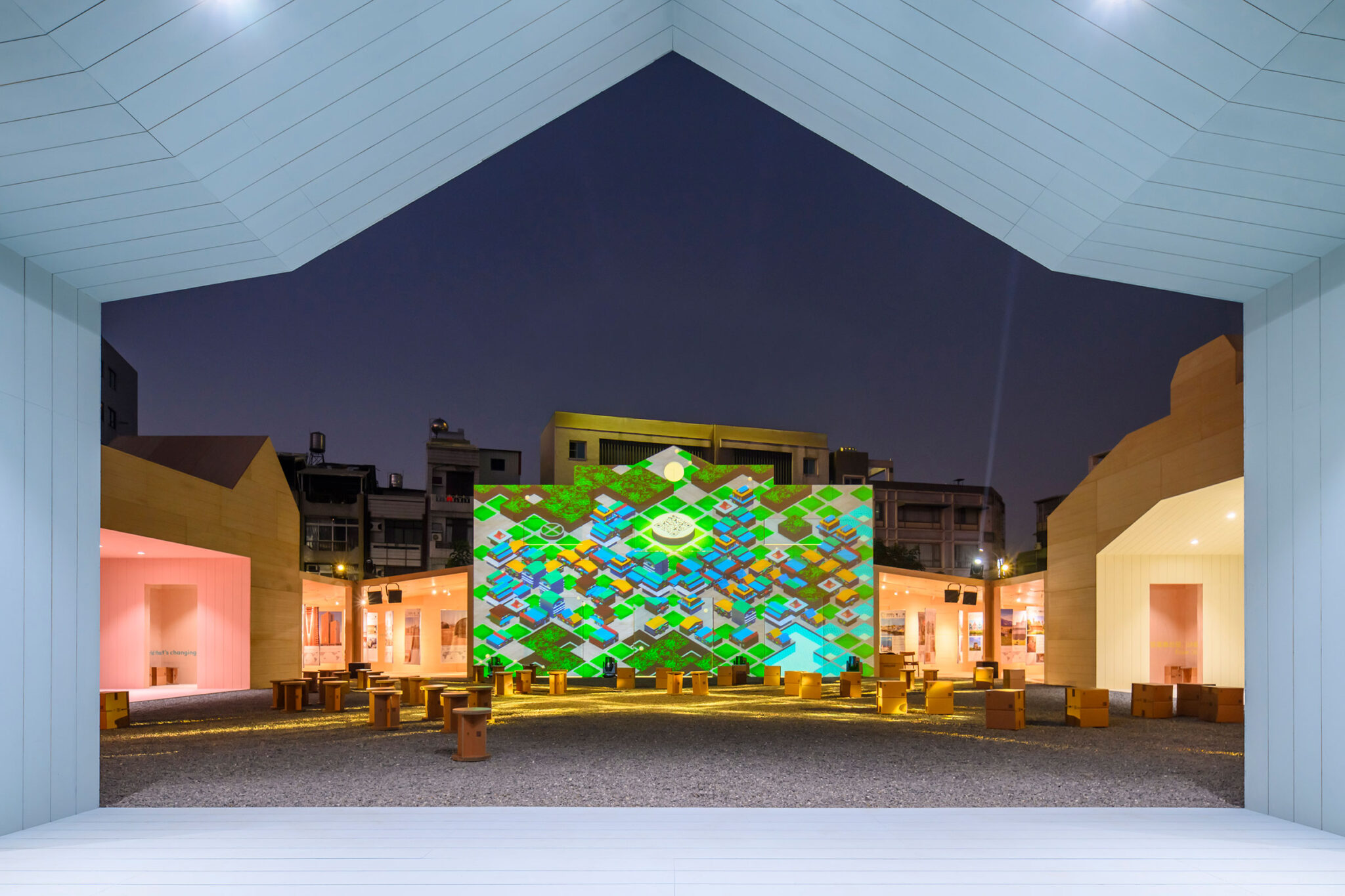 毎晩パヴィリオンの立面にライトショーが投影される中庭空間と、広々としたメインホールを備えたウッデン・ワンダーズ・パヴィリオンは、市の記念祝賀行事の期間中、主要な交流の場として機能します。そのため、本パヴィリオンでは一般向けに一連のイベントが開催され、MVRDVのパートナーであるヤン・クニッカー(Jan Knikker)および台湾代表のフイ・シン・リャオ(Hui Hsin Liao)に加え、嘉義市の都市発展局長であるフアイチュン・シュー(Huai-chun Hsu)、ならびに南華大学芸術・デザイン学部長のチェン・チェンチョー(Cheng-che Chen)が登壇するフォーラムなどが行われます。また、MVRDVのプロジェクトリーダーであるヴェロニカ・デラ・ヴェントゥーラ(Veronica Della Ventura)および建築家のハーン・ツォウ(Herng Tzou)による3つのレクチャーも行われます。パヴィリオンのイベントスケジュールの詳細については、こちらをご覧ください。