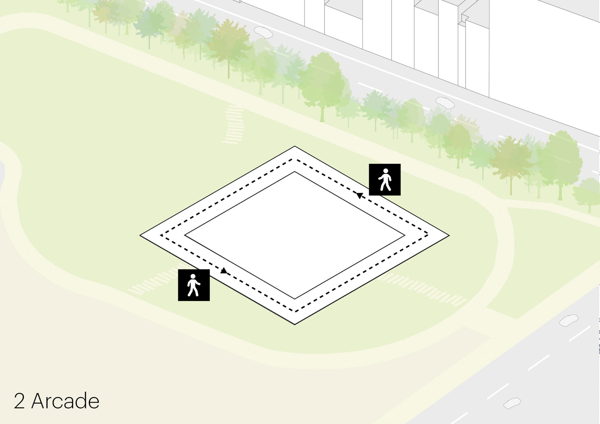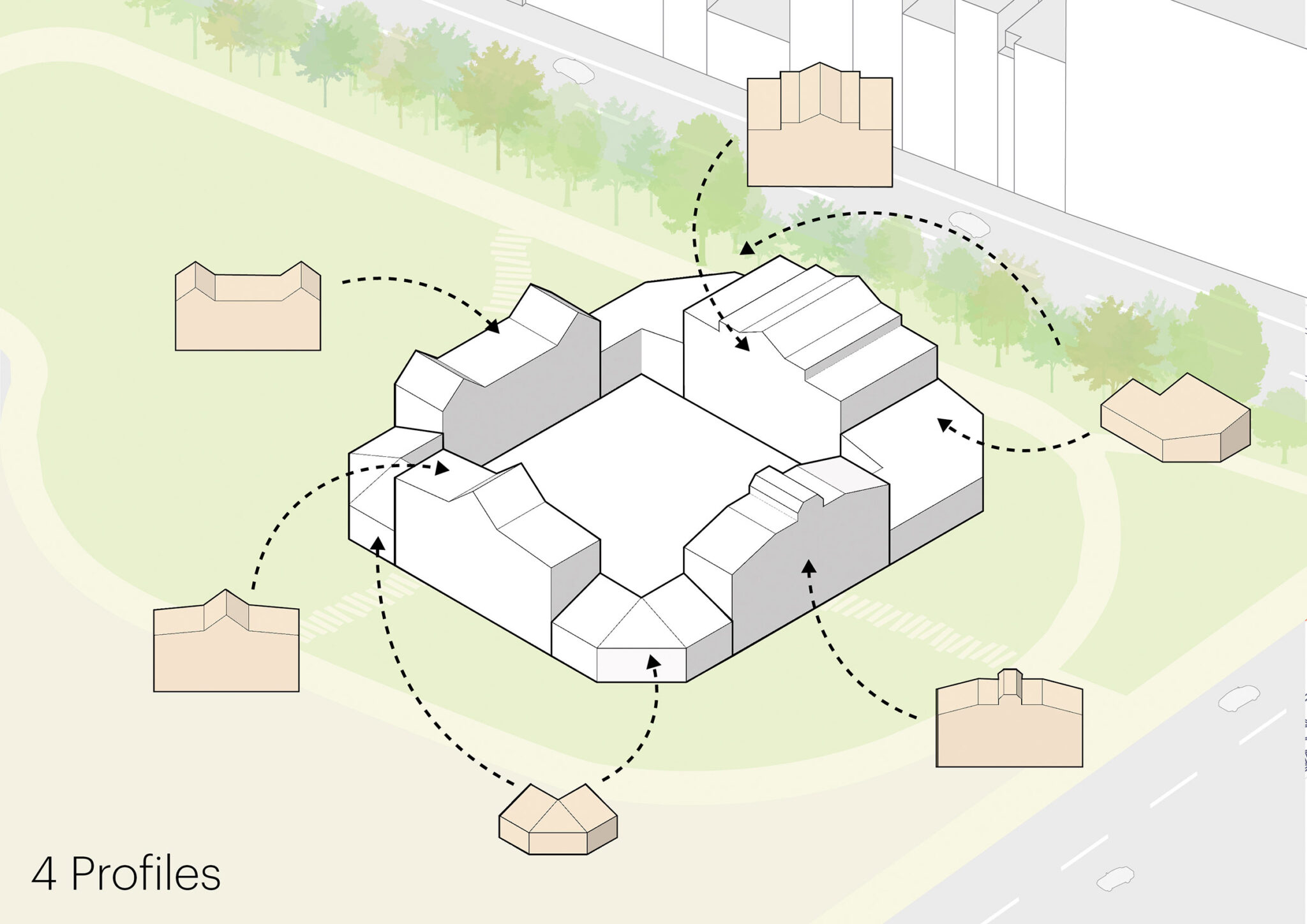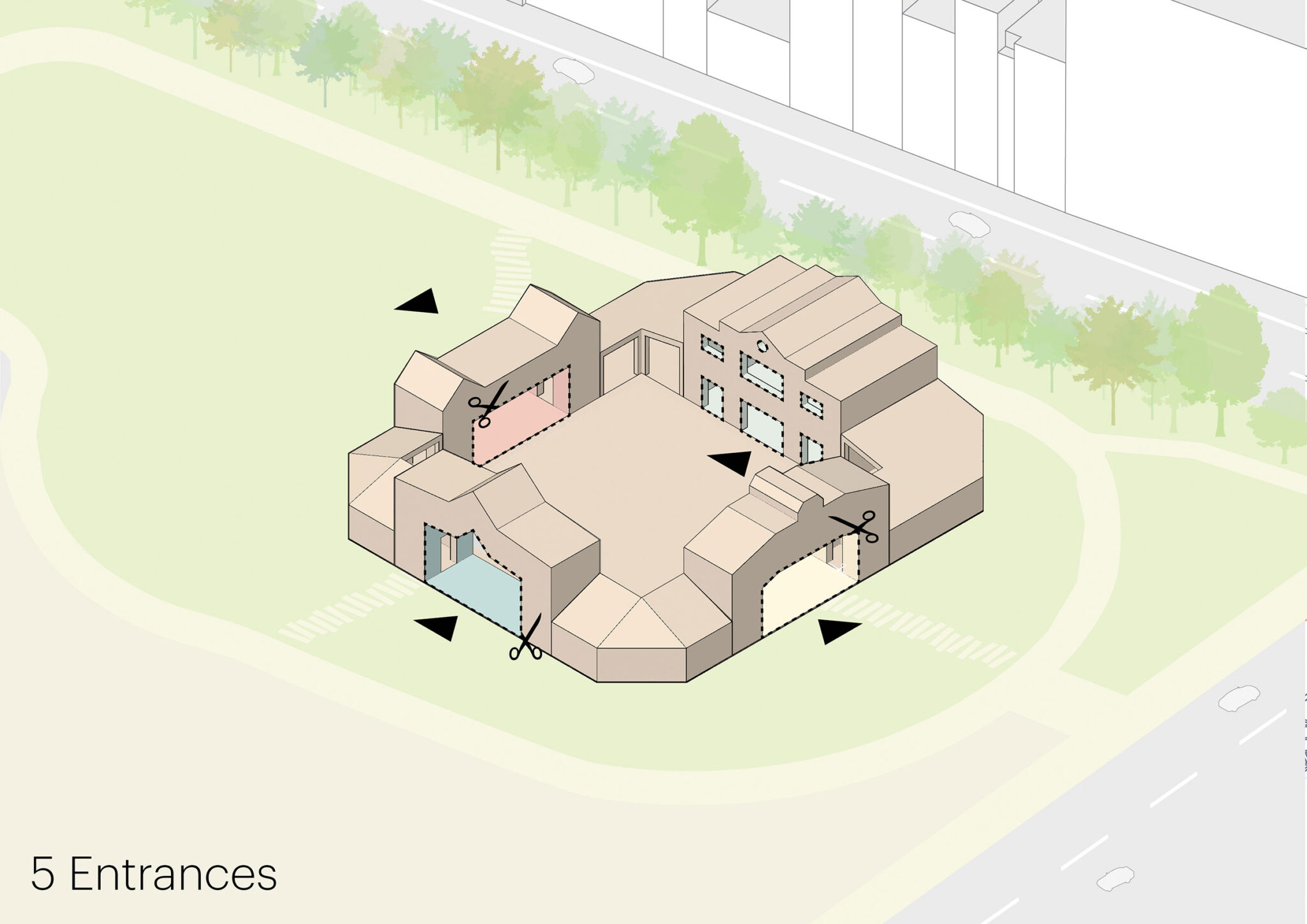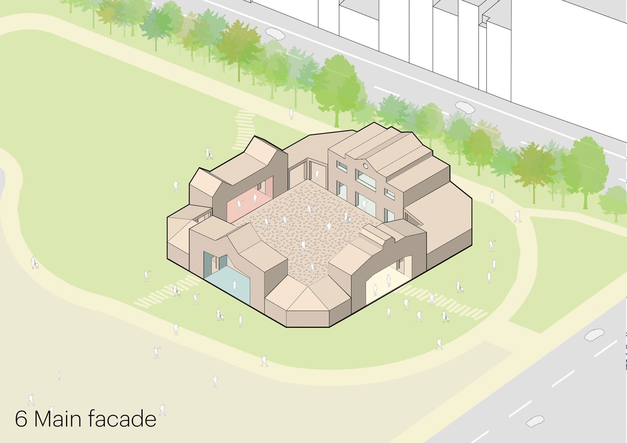 これらの要素はパヴィリオンのデザインにも反映されており、4つの面取りされた角は街角のカフェやレストランを想起させています。また、パヴィリオンの各辺は、美術館や警察署といった著名な木造建築に着想を得た屋根ラインによって際立たせられています。これらのうち三つの側面は中庭へと通じるゲートを形成しており、その内部に施されたパステルカラーは、それぞれが参照している元の建築の色彩を想起させるディテールであり、この都市のリビングルームへと来訪者を迎え入れます。
