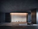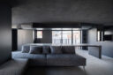 L字型のルーフテラスのある区画でのプロジェクトです。建築家は、開放性や快適さの享受を求め、既存個室の壁を取り払って“外へ視線が抜ける大らかな空間”を創出しました。また、スケールの大きな二つの造作家具を用いて暮らしの場の“緩やかな分節”も行っています。