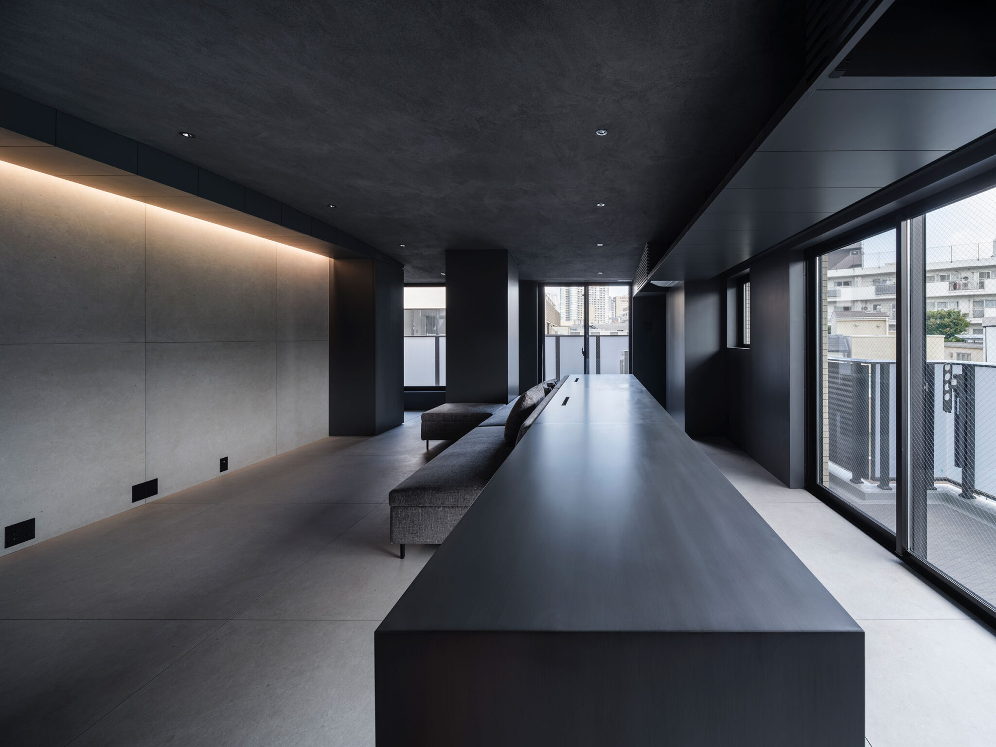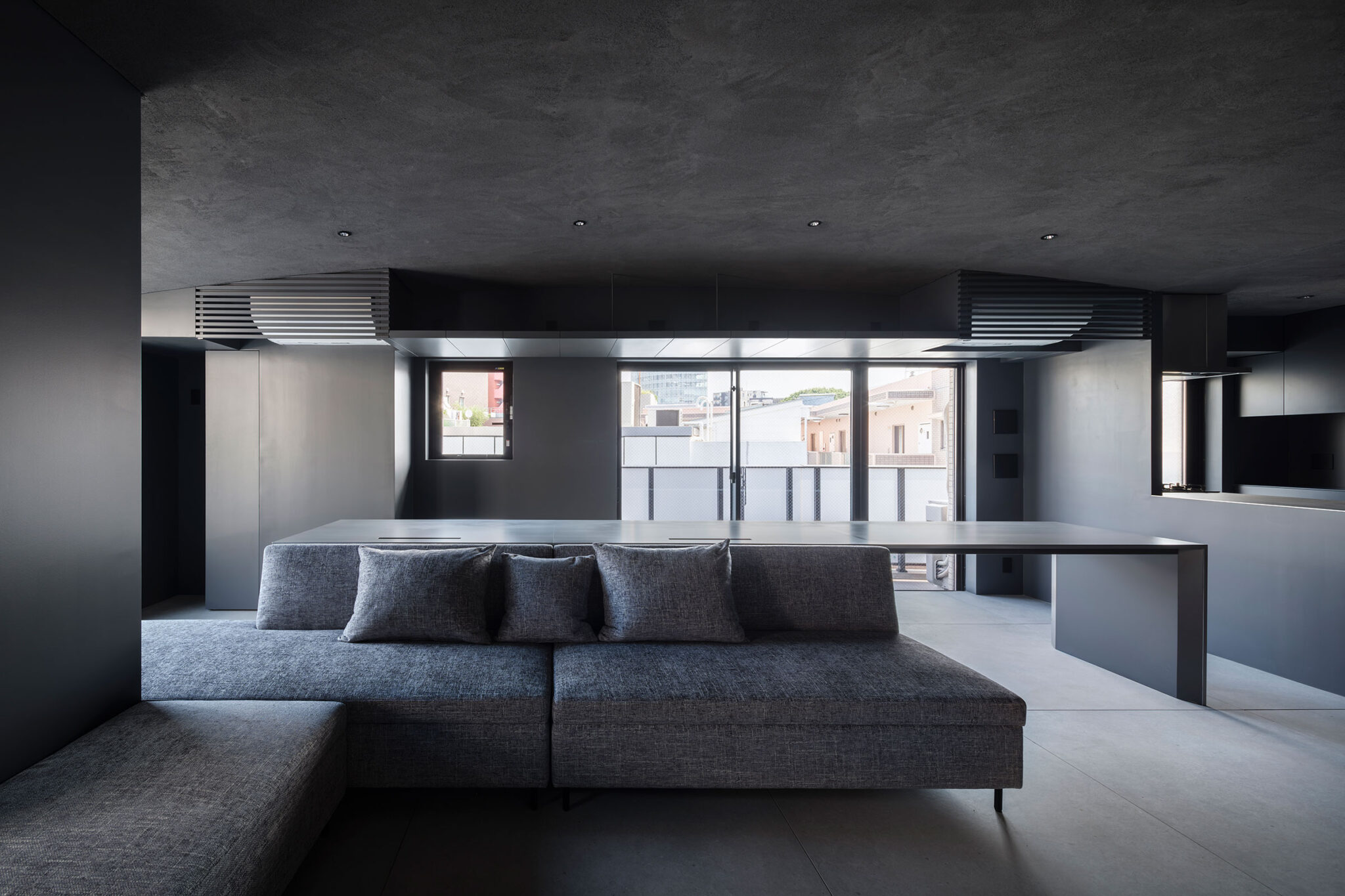 L字型のルーフテラスのある区画でのプロジェクトです。建築家は、開放性や快適さの享受を求め、既存個室の壁を取り払って“外へ視線が抜ける大らかな空間”を創出しました。また、スケールの大きな二つの造作家具を用いて暮らしの場の“緩やかな分節”も行っています。