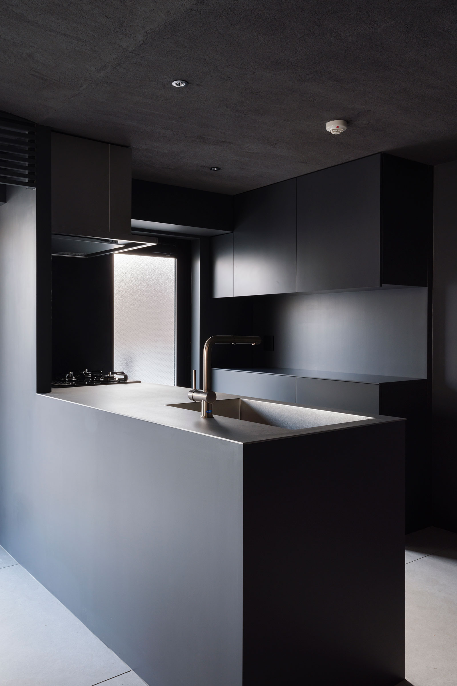 黒川智之建築設計事務所による、東京・渋谷区の住戸改修「北参道の住宅」。L字型のルーフテラスのある区画。開放性や快適さの享受を求め、既存個室の壁を取り払って“外へ視線が抜ける大らかな空間”を創出。スケールの大きな二つの造作家具を用いて暮らしの場の“緩やかな分節”も行うキッチン photo©中山保寛