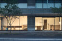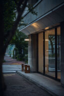 橋本卓磨 / oocによる、東京・中央区の「o tokyo」。自身のオフィス兼カフェの計画。物が潜在的に持つ“存在としての美しさ”に興味を持ち、石や人工物などの“連続から成る什器”を中心に据える空間を考案。予期しない違和感や非日常が創造の原点となる環境も意図西側の道路より開口部越しに内部を見る。夕景 photo©橋本越百