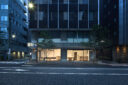 橋本卓磨 / oocによる、東京・中央区の「o tokyo」。自身のオフィス兼カフェの計画。物が潜在的に持つ“存在としての美しさ”に興味を持ち、石や人工物などの“連続から成る什器”を中心に据える空間を考案。予期しない違和感や非日常が創造の原点となる環境も意図オフィス兼カフェの入る建物の外観を見る。夕景 photo©橋本越百