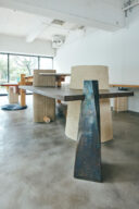 橋本卓磨 / oocによる、東京・中央区の「o tokyo」。自身のオフィス兼カフェの計画。物が潜在的に持つ“存在としての美しさ”に興味を持ち、石や人工物などの“連続から成る什器”を中心に据える空間を考案。予期しない違和感や非日常が創造の原点となる環境も意図奥から、「テーブル1」「テーブル2」「テーブル3」。 photo©橋本越百
