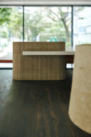 橋本卓磨 / oocによる、東京・中央区の「o tokyo」。自身のオフィス兼カフェの計画。物が潜在的に持つ“存在としての美しさ”に興味を持ち、石や人工物などの“連続から成る什器”を中心に据える空間を考案。予期しない違和感や非日常が創造の原点となる環境も意図左奥:「テーブル2」、右手前:「テーブル1」 photo©橋本越百