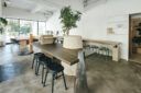 橋本卓磨 / oocによる、東京・中央区の「o tokyo」。自身のオフィス兼カフェの計画。物が潜在的に持つ“存在としての美しさ”に興味を持ち、石や人工物などの“連続から成る什器”を中心に据える空間を考案。予期しない違和感や非日常が創造の原点となる環境も意図エントランス側から「テーブル4」とキッチンを見る。 photo©橋本越百