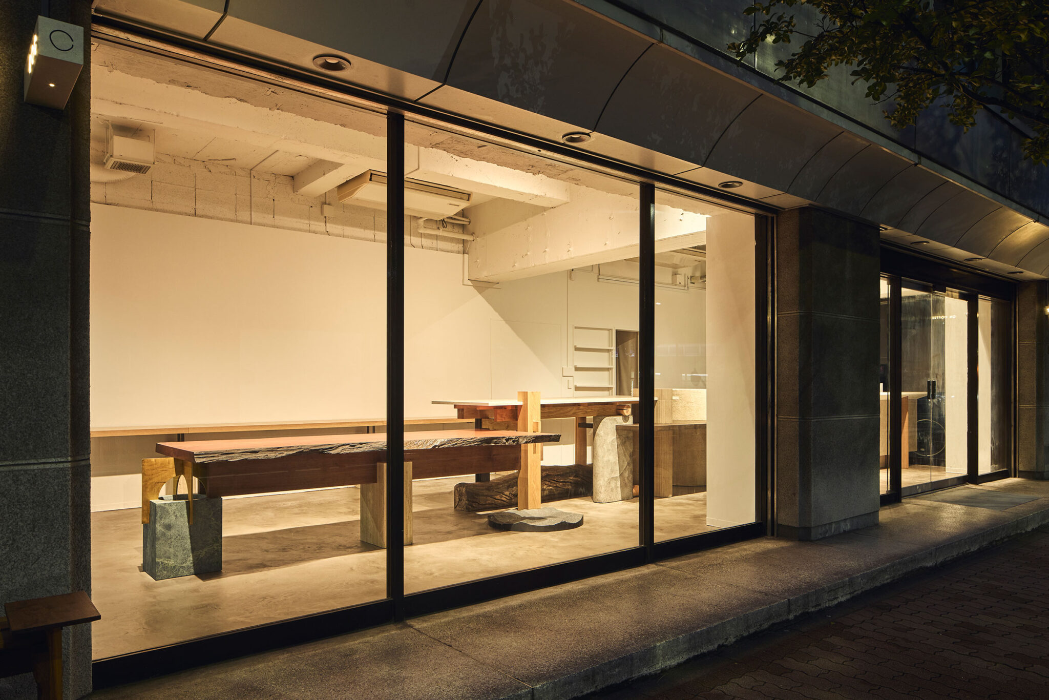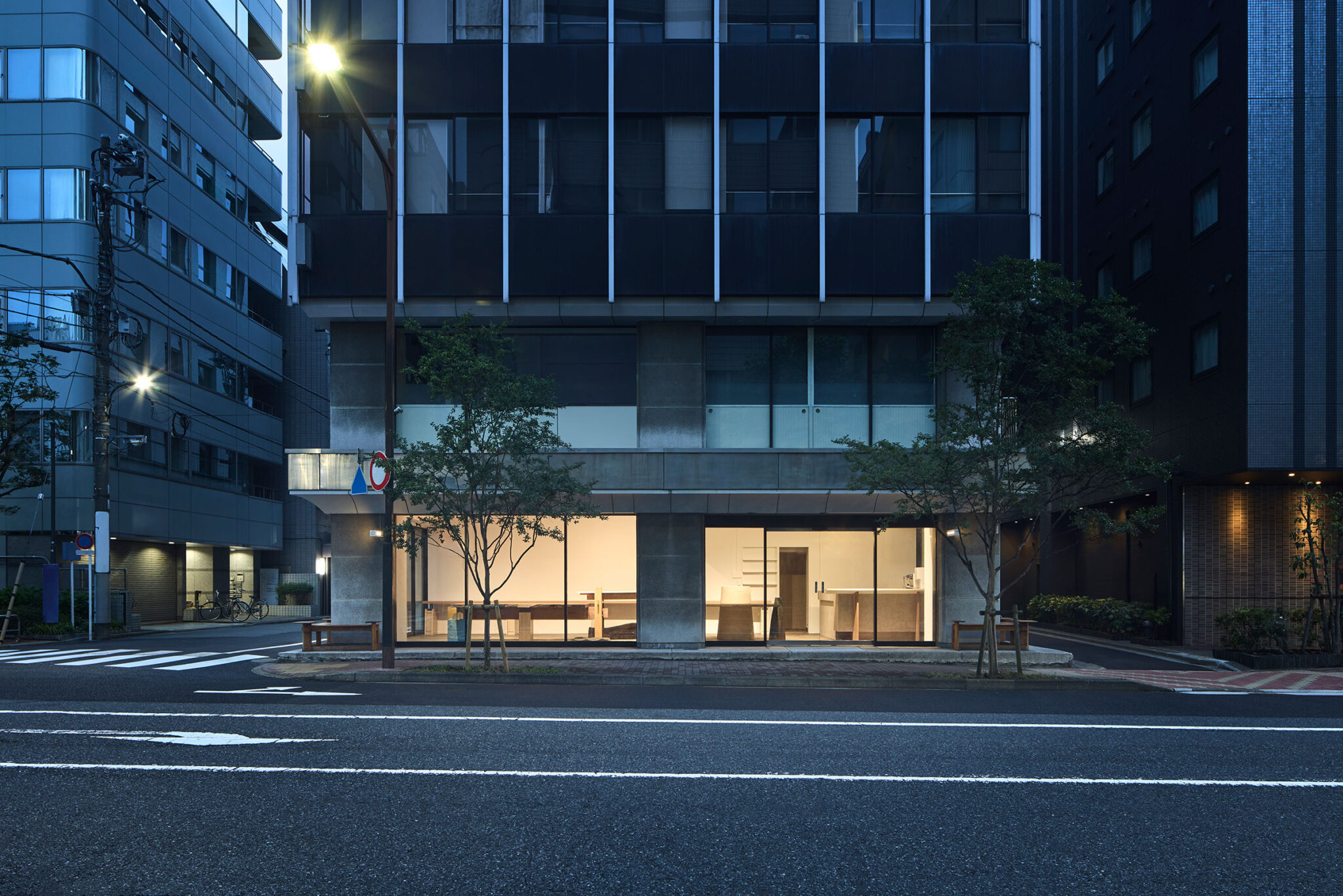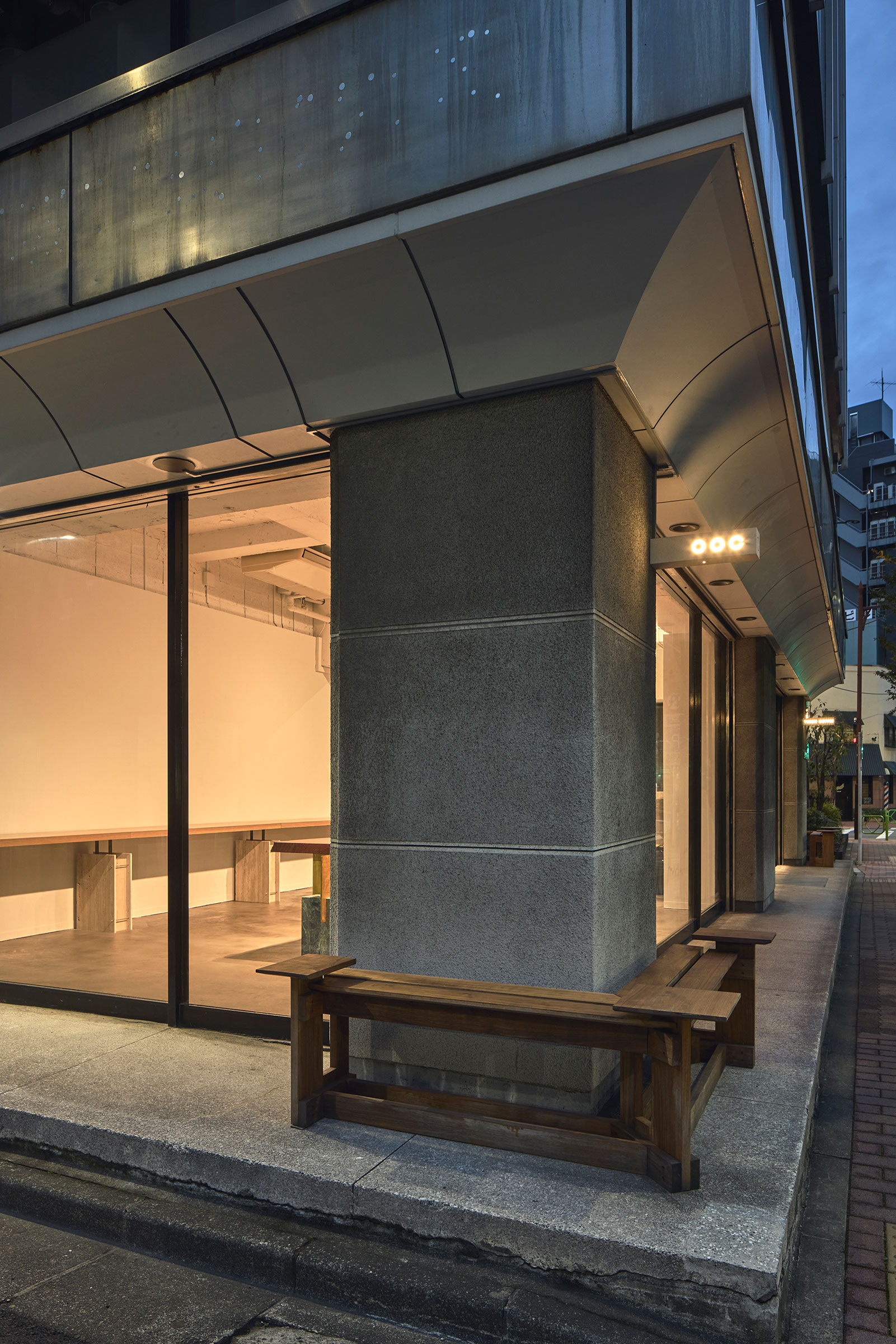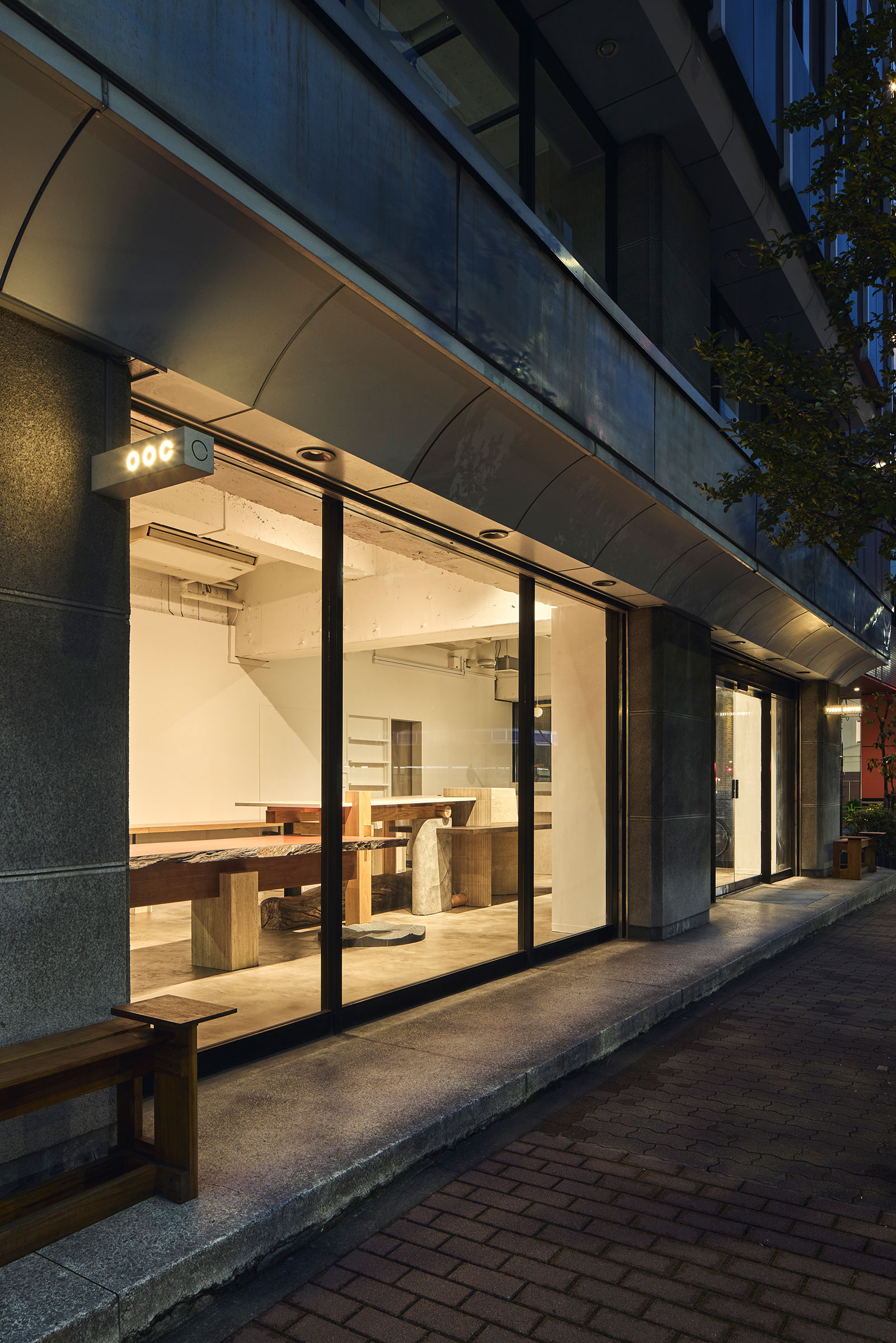 橋本卓磨 / oocによる、東京・中央区の「o tokyo」。自身のオフィス兼カフェの計画。物が潜在的に持つ“存在としての美しさ”に興味を持ち、石や人工物などの“連続から成る什器”を中心に据える空間を考案。予期しない違和感や非日常が創造の原点となる環境も意図西側の道路より開口部越しに内部を見る。夕景 photo©橋本越百
