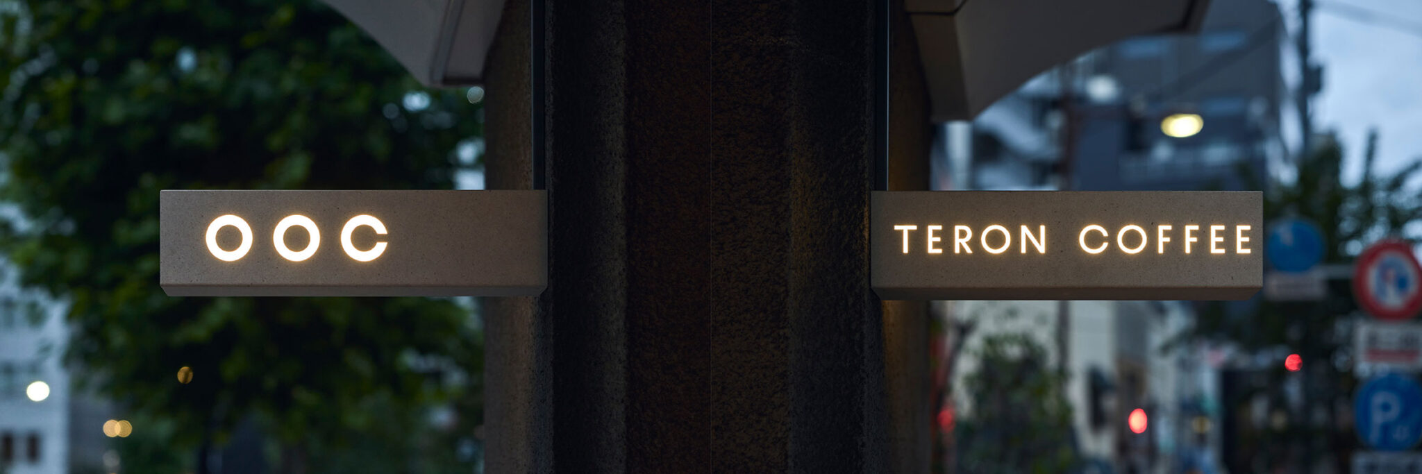 橋本卓磨 / oocによる、東京・中央区の「o tokyo」。自身のオフィス兼カフェの計画。物が潜在的に持つ“存在としての美しさ”に興味を持ち、石や人工物などの“連続から成る什器”を中心に据える空間を考案。予期しない違和感や非日常が創造の原点となる環境も意図サイン。夕景 photo©橋本越百