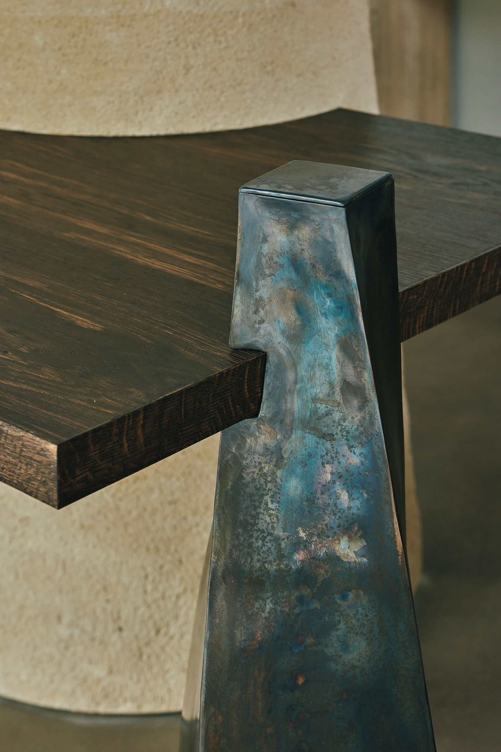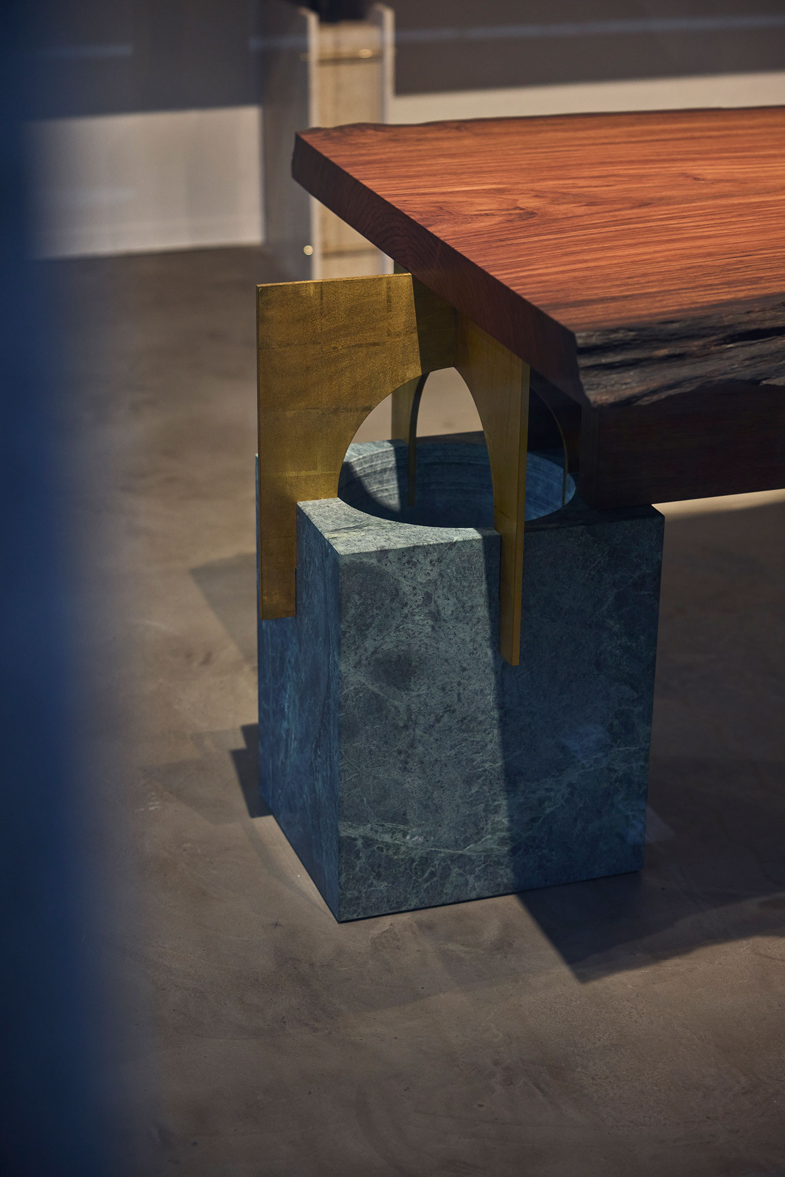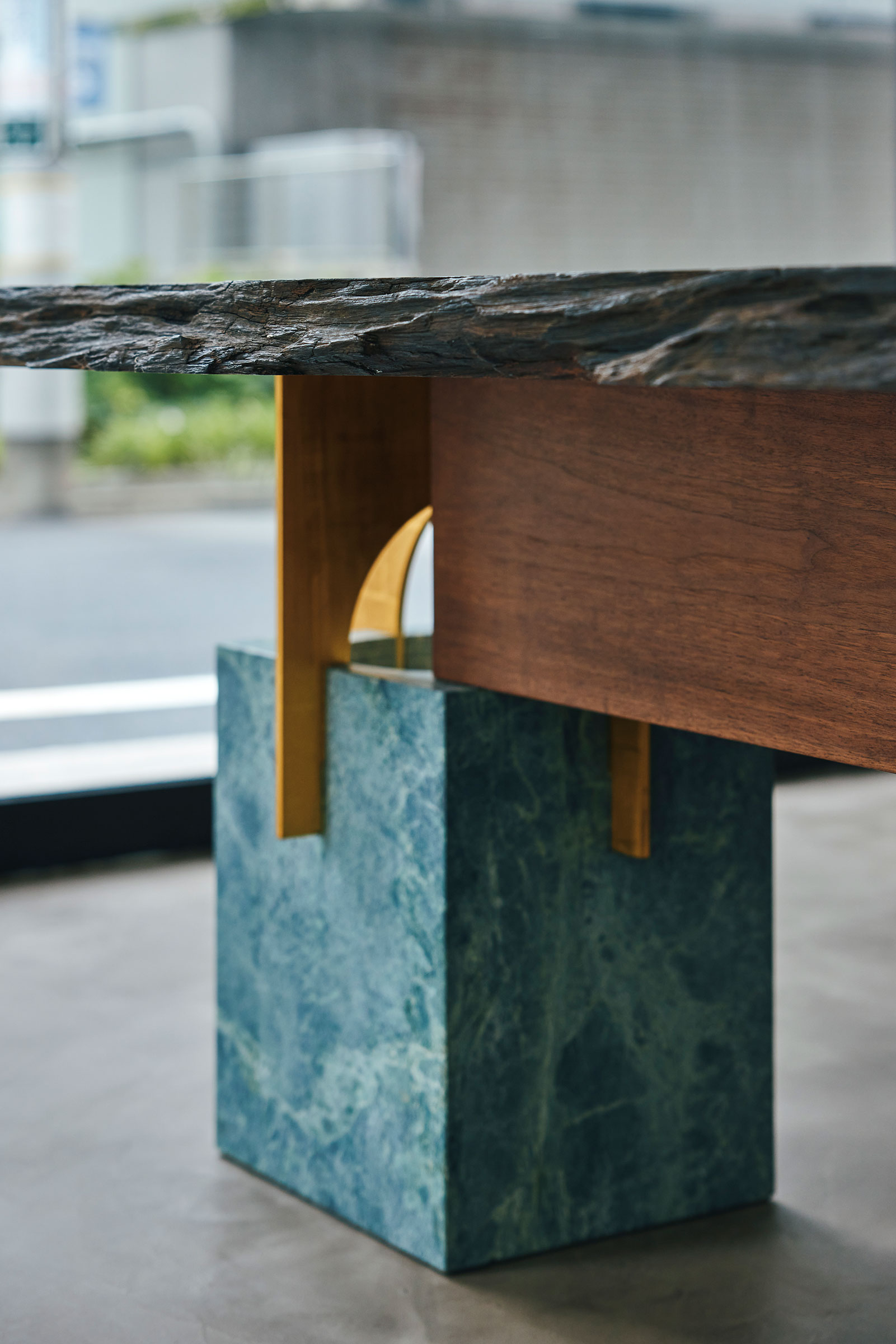 橋本卓磨 / oocによる、東京・中央区の「o tokyo」。自身のオフィス兼カフェの計画。物が潜在的に持つ“存在としての美しさ”に興味を持ち、石や人工物などの“連続から成る什器”を中心に据える空間を考案。予期しない違和感や非日常が創造の原点となる環境も意図「テーブル3」 photo©橋本越百