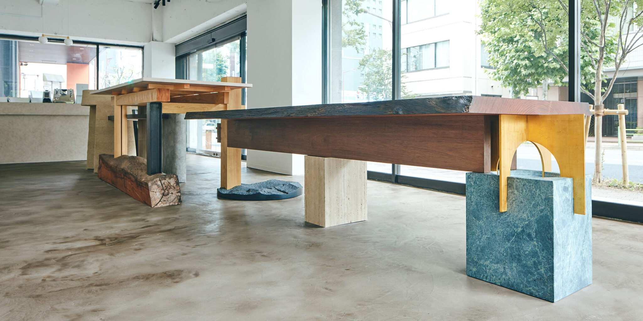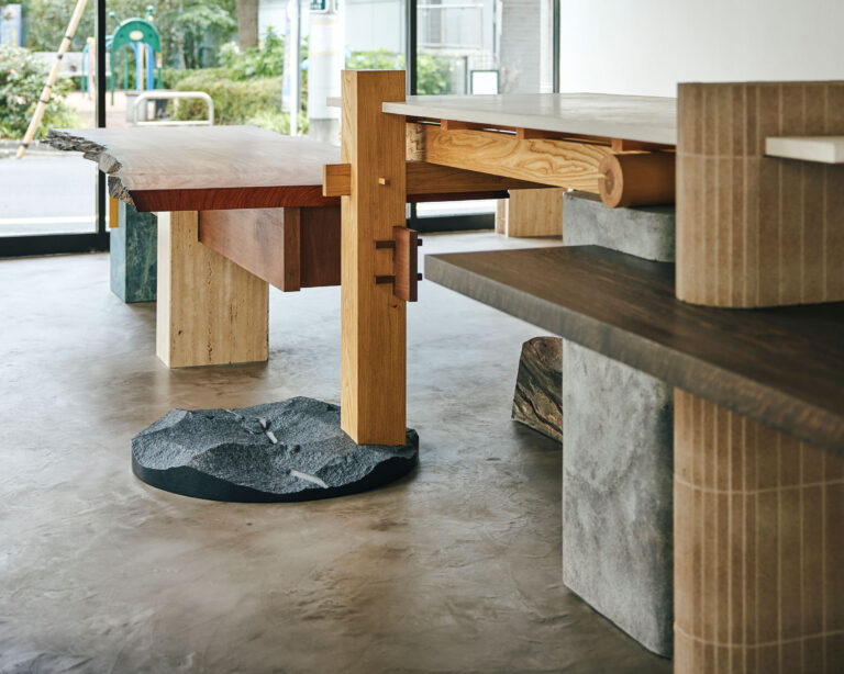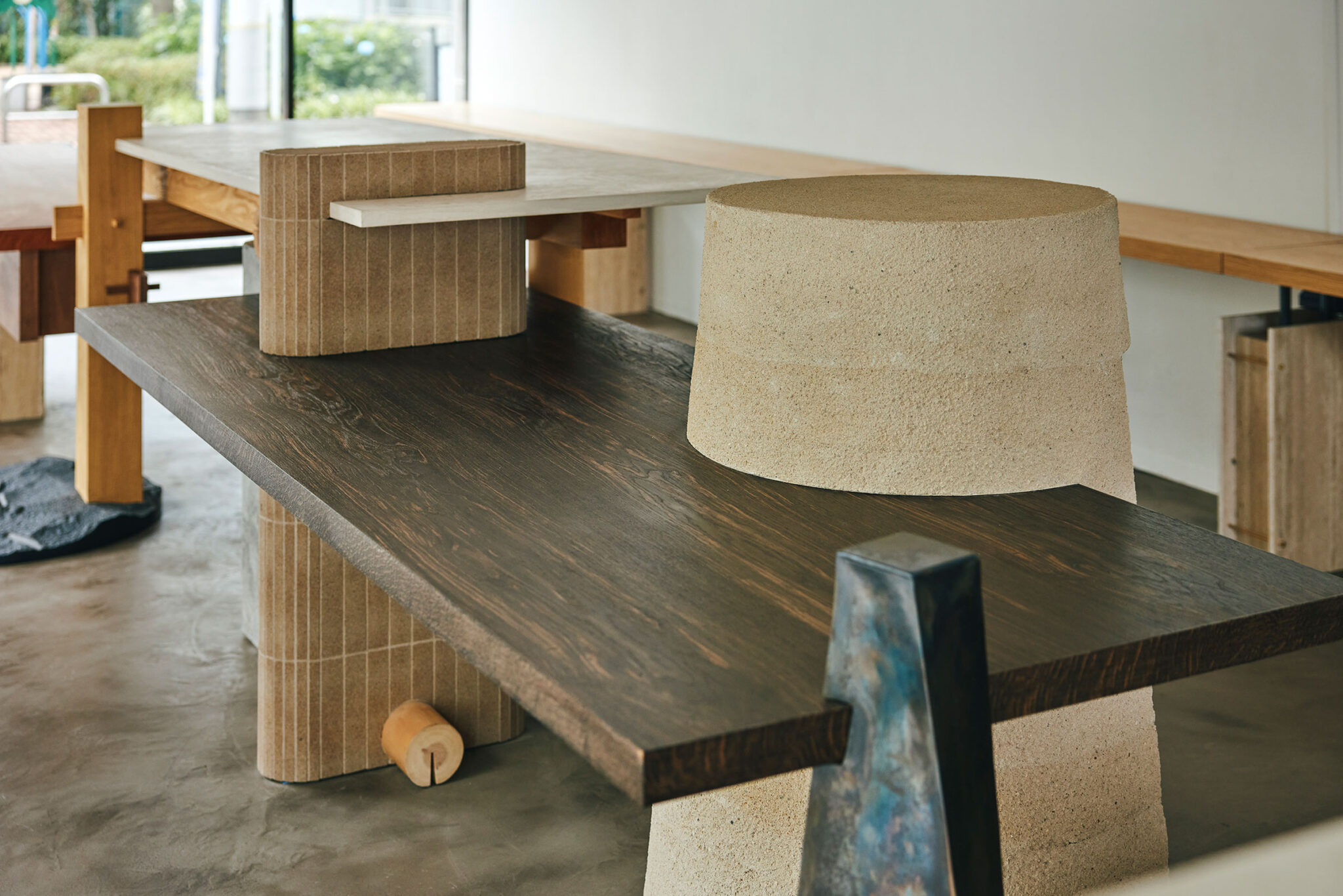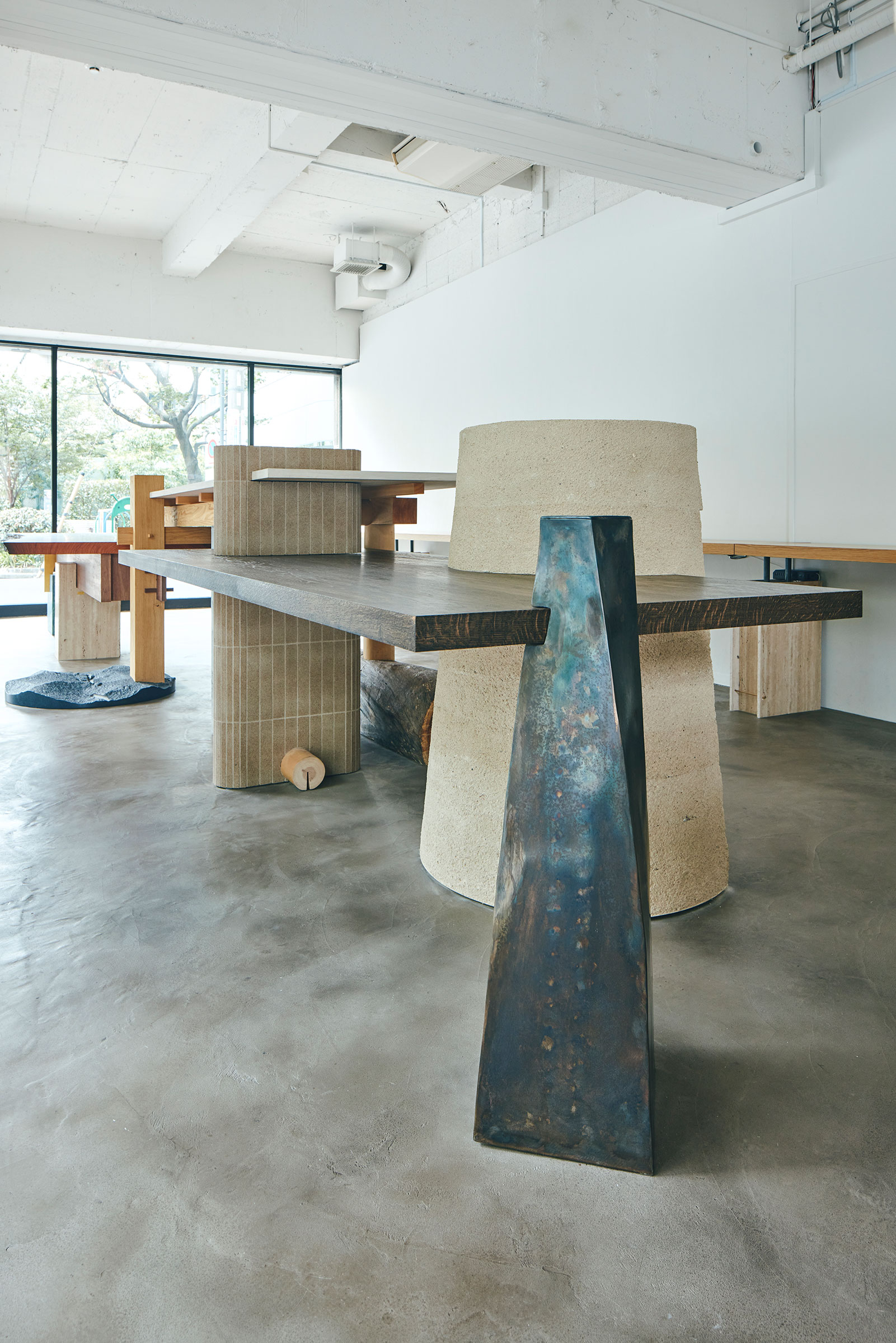 橋本卓磨 / oocによる、東京・中央区の「o tokyo」。自身のオフィス兼カフェの計画。物が潜在的に持つ“存在としての美しさ”に興味を持ち、石や人工物などの“連続から成る什器”を中心に据える空間を考案。予期しない違和感や非日常が創造の原点となる環境も意図左奥:「テーブル2」、右手前:「テーブル1」 photo©橋本越百