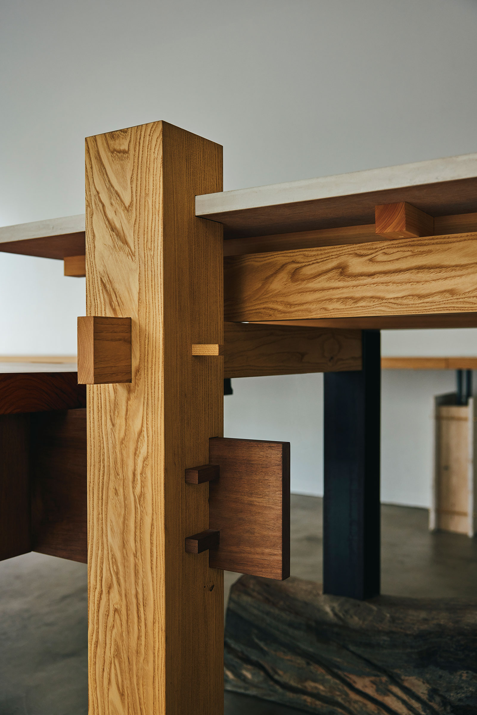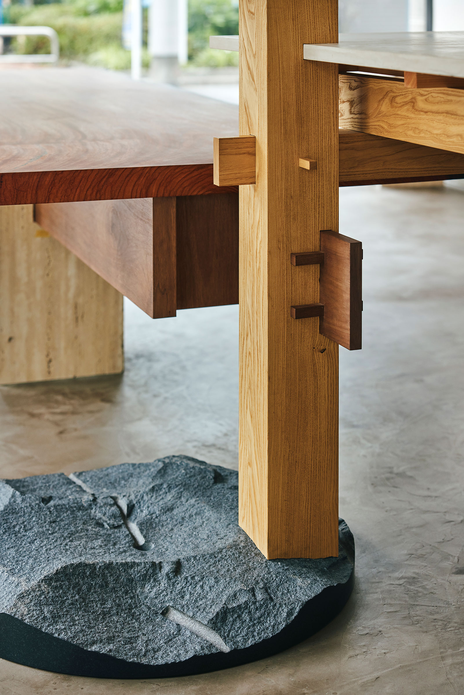 橋本卓磨 / oocによる、東京・中央区の「o tokyo」。自身のオフィス兼カフェの計画。物が潜在的に持つ“存在としての美しさ”に興味を持ち、石や人工物などの“連続から成る什器”を中心に据える空間を考案。予期しない違和感や非日常が創造の原点となる環境も意図「テーブル2」の詳細 photo©橋本越百