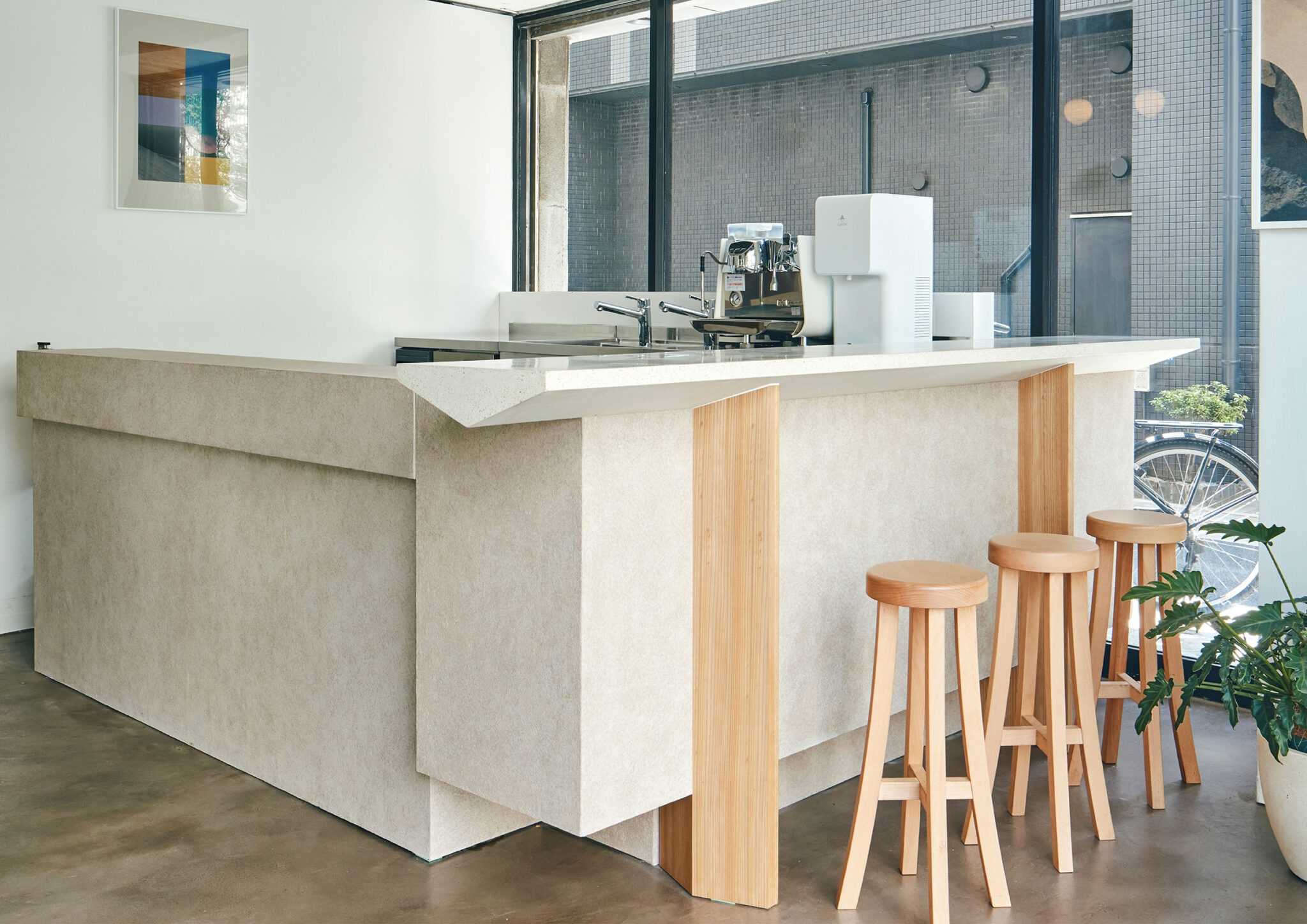 橋本卓磨 / oocによる、東京・中央区の「o tokyo」。自身のオフィス兼カフェの計画。物が潜在的に持つ“存在としての美しさ”に興味を持ち、石や人工物などの“連続から成る什器”を中心に据える空間を考案。予期しない違和感や非日常が創造の原点となる環境も意図「テーブル4」とキッチン photo©橋本越百
