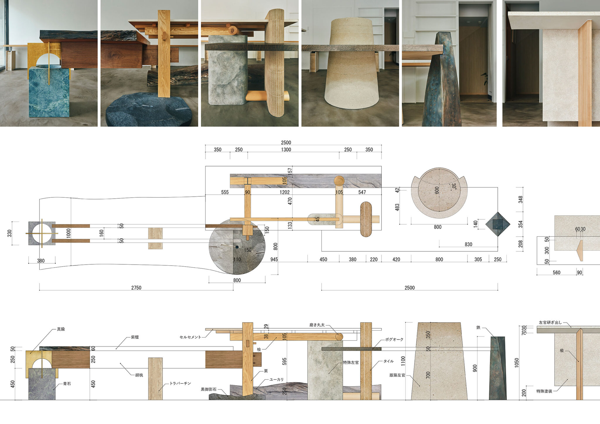 橋本卓磨 / oocによる、東京・中央区の「o tokyo」。自身のオフィス兼カフェの計画。物が潜在的に持つ“存在としての美しさ”に興味を持ち、石や人工物などの“連続から成る什器”を中心に据える空間を考案。予期しない違和感や非日常が創造の原点となる環境も意図テーブル詳細図 image©ooc