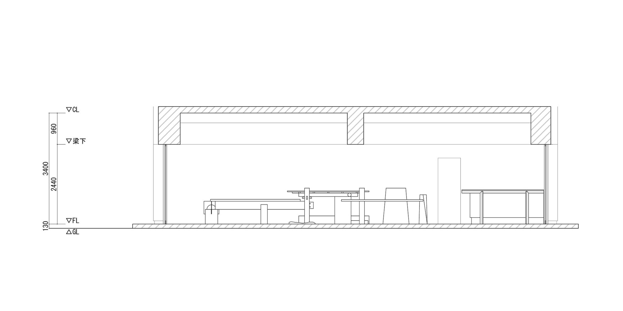 橋本卓磨 / oocによる、東京・中央区の「o tokyo」。自身のオフィス兼カフェの計画。物が潜在的に持つ“存在としての美しさ”に興味を持ち、石や人工物などの“連続から成る什器”を中心に据える空間を考案。予期しない違和感や非日常が創造の原点となる環境も意図断面図 image©ooc