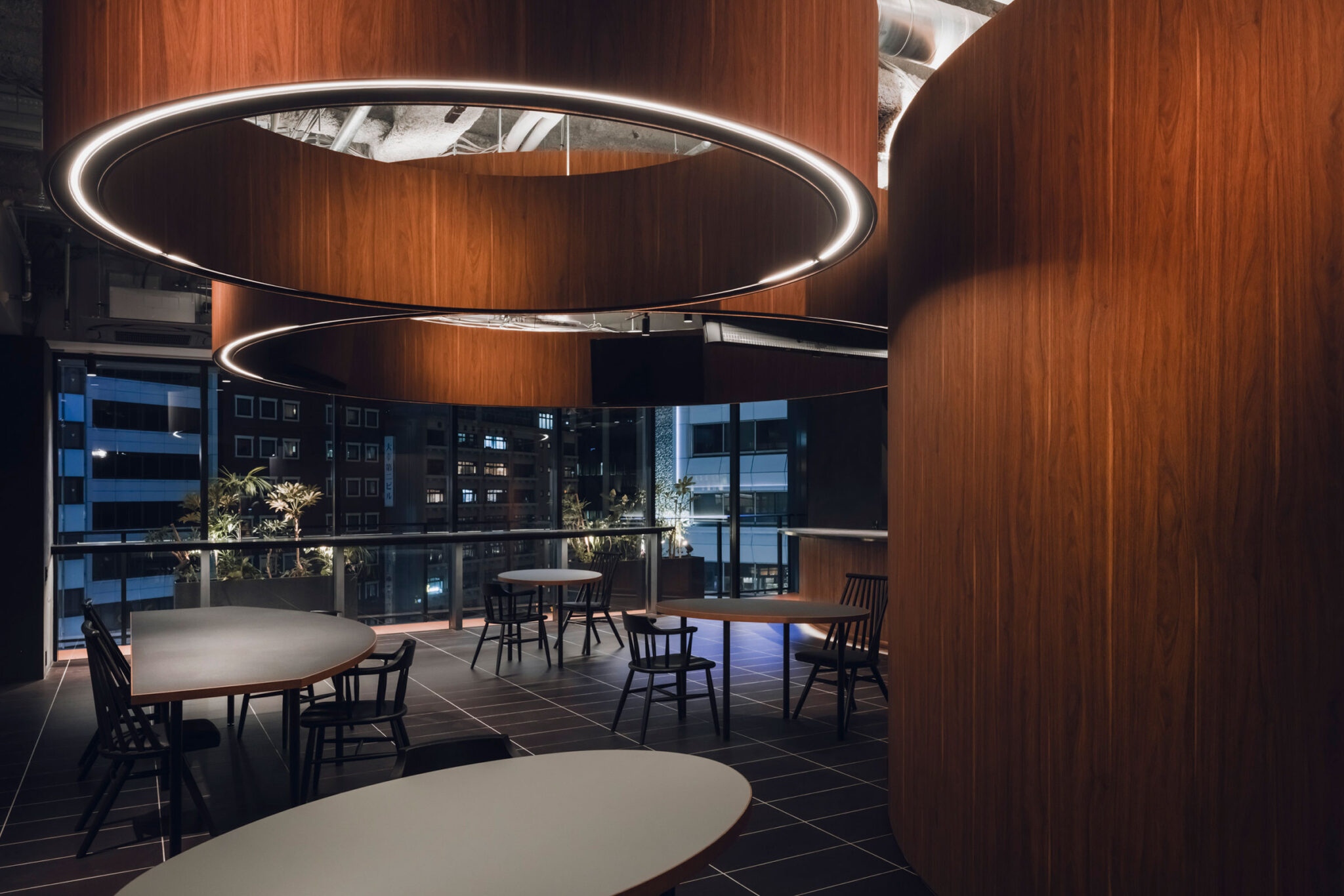 オフィスの1層を多用途に使える場とする計画です。建築家は、“使い方が更新され続ける”与件に対し、“空間の余地”自体を“空間の構成”とする設計を志向しました。そして、スケールレスな“6つのリング”で変化に耐えうる“骨格”を創り出しました。