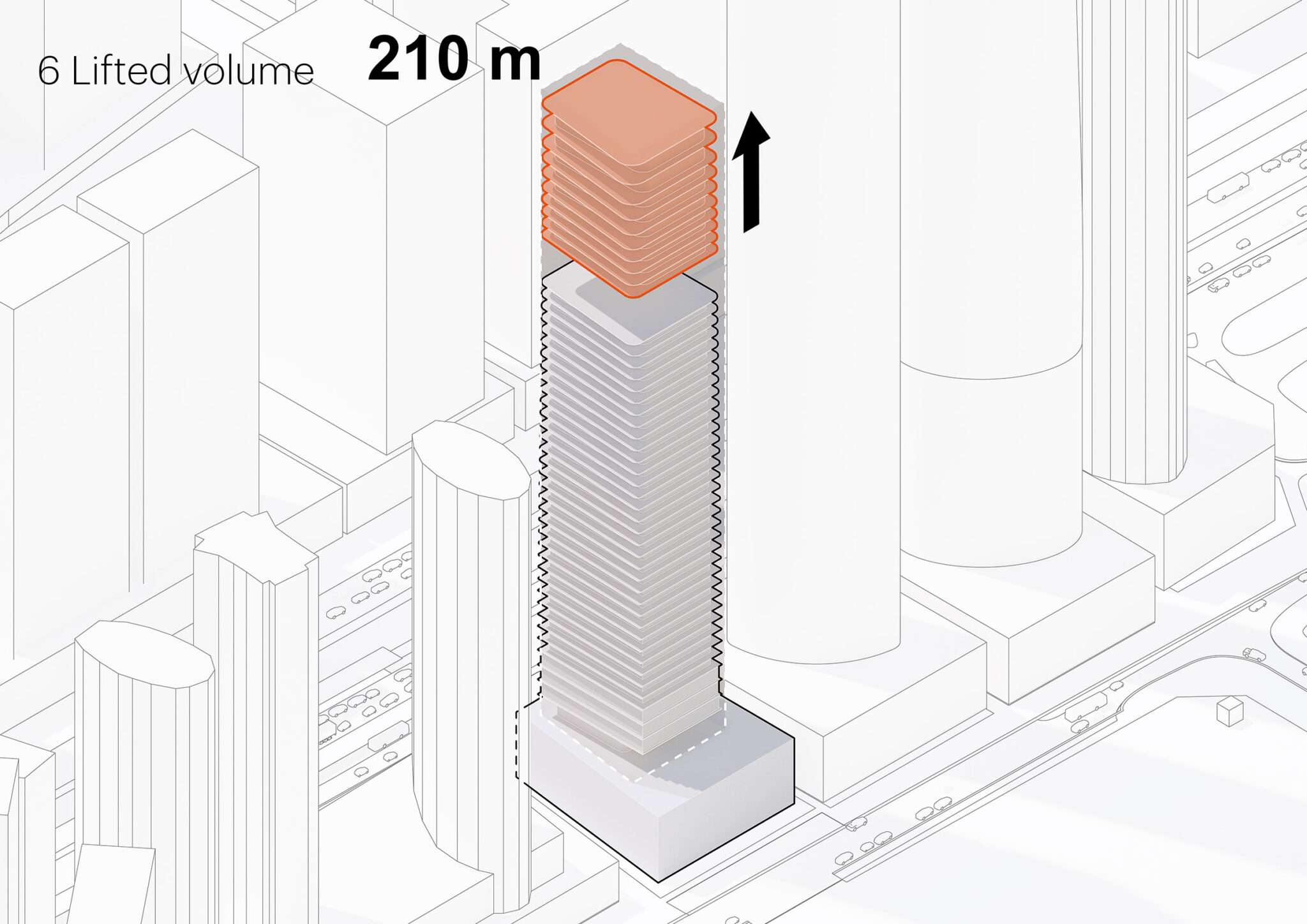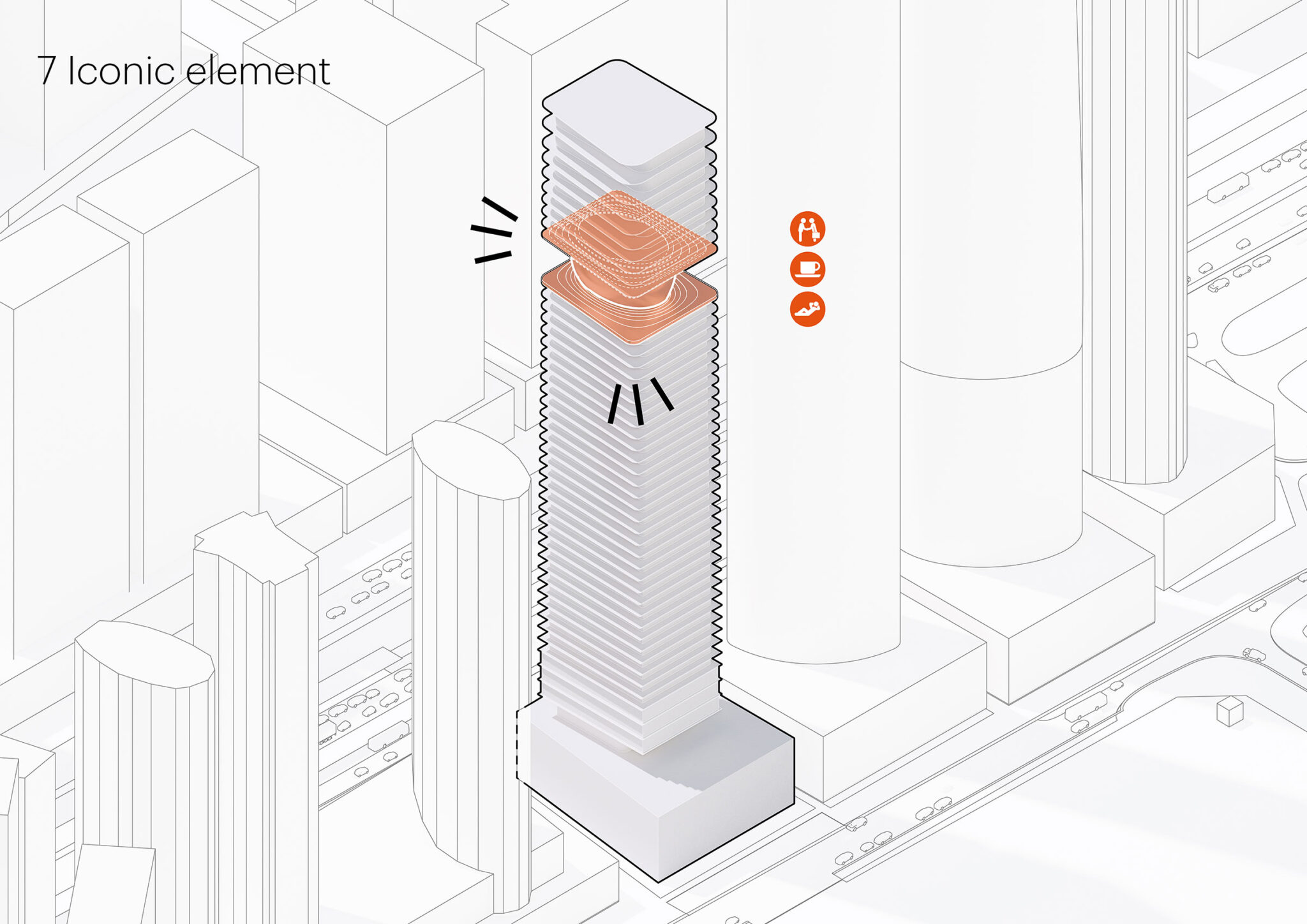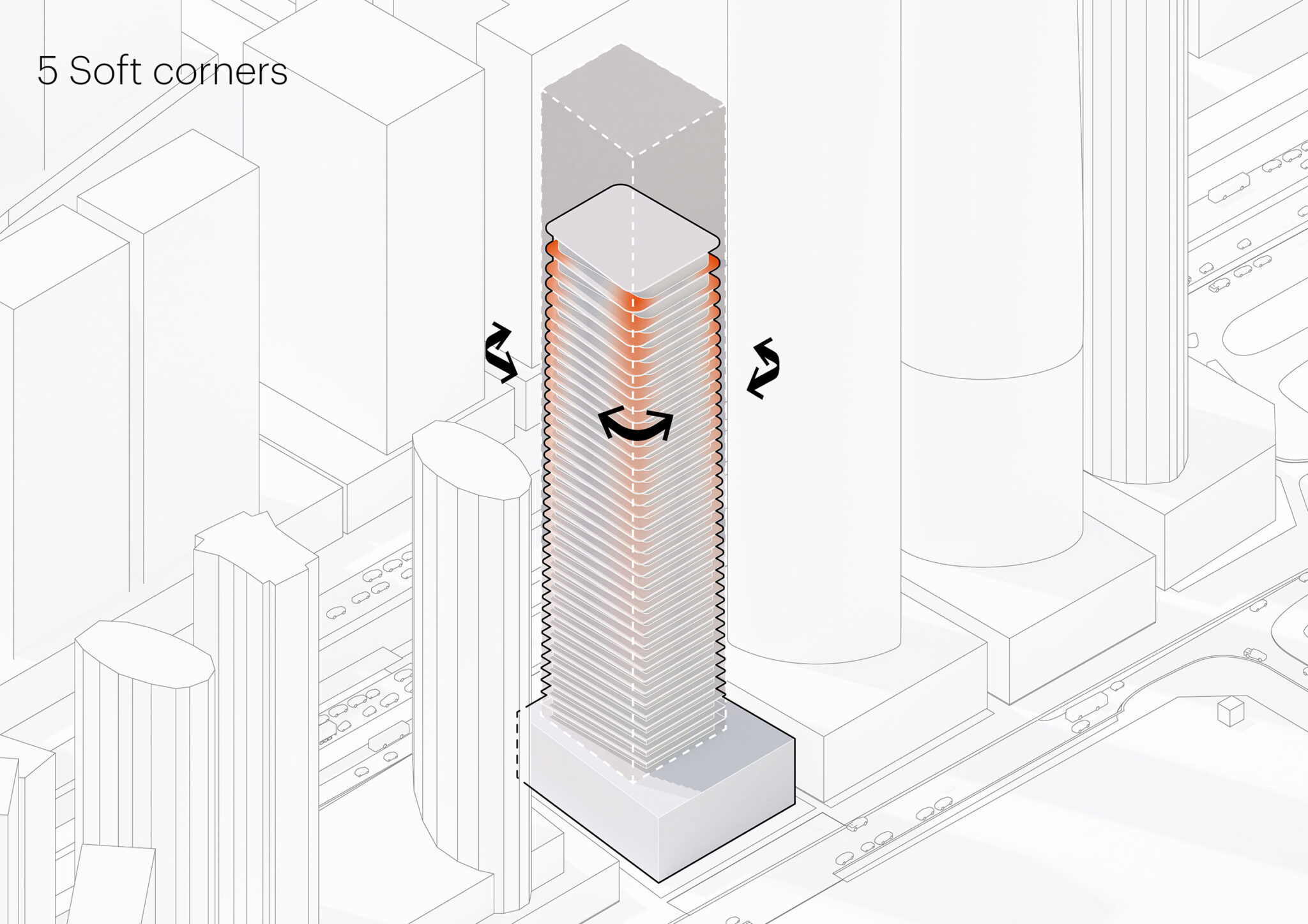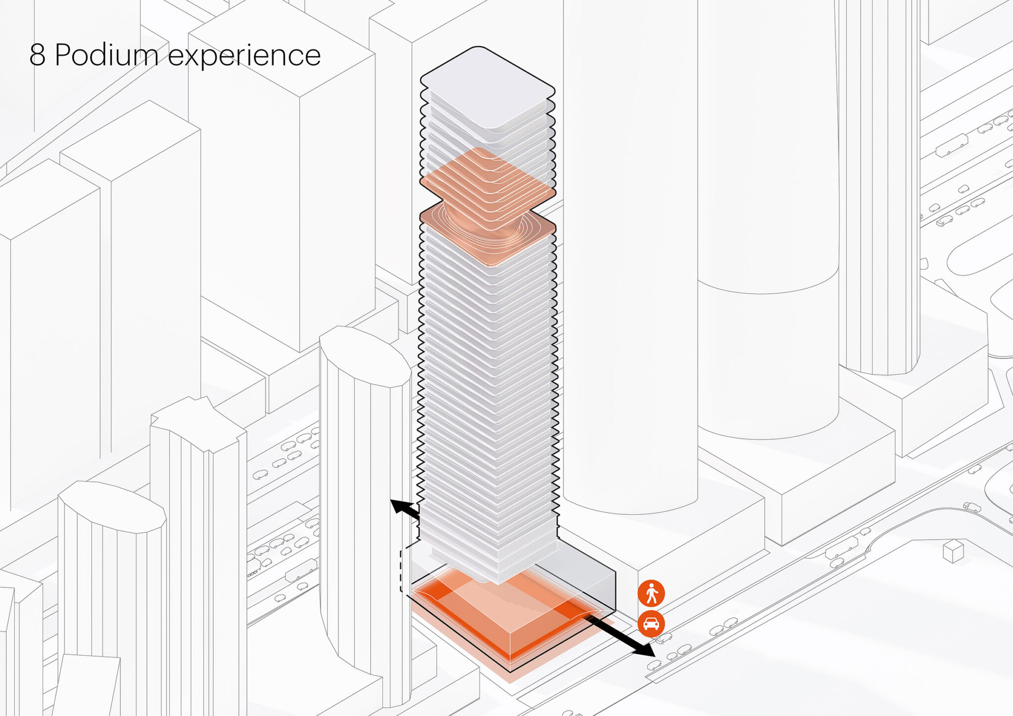 優劣を競い合うゲームを続けるのではなく、MVRDVのデザインは、スペクタクルよりも興味を引くことを重んじる新たなアプローチを提示しています。それは、洗練された直線的なタワーの上部を持ち上げて、タワー全高のおよそ4分の3の位置に、真珠に着想を得た、光を放つ卵形の特別な要素を現します。その位置と、タワーの階と階の間にほとんど控えめとも言える形で埋め込まれている在り方によって、この要素は、より高くより派手な周囲の建物の中にあっても、注目を集めることに成功します。