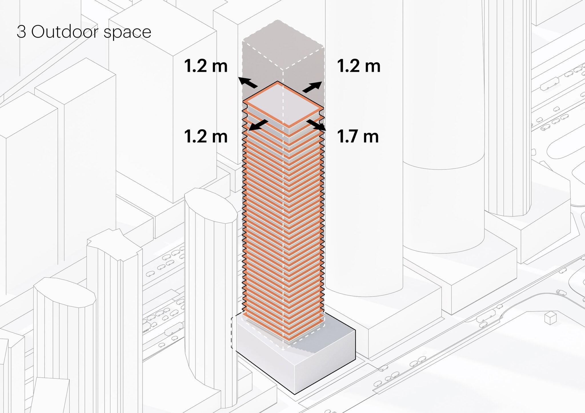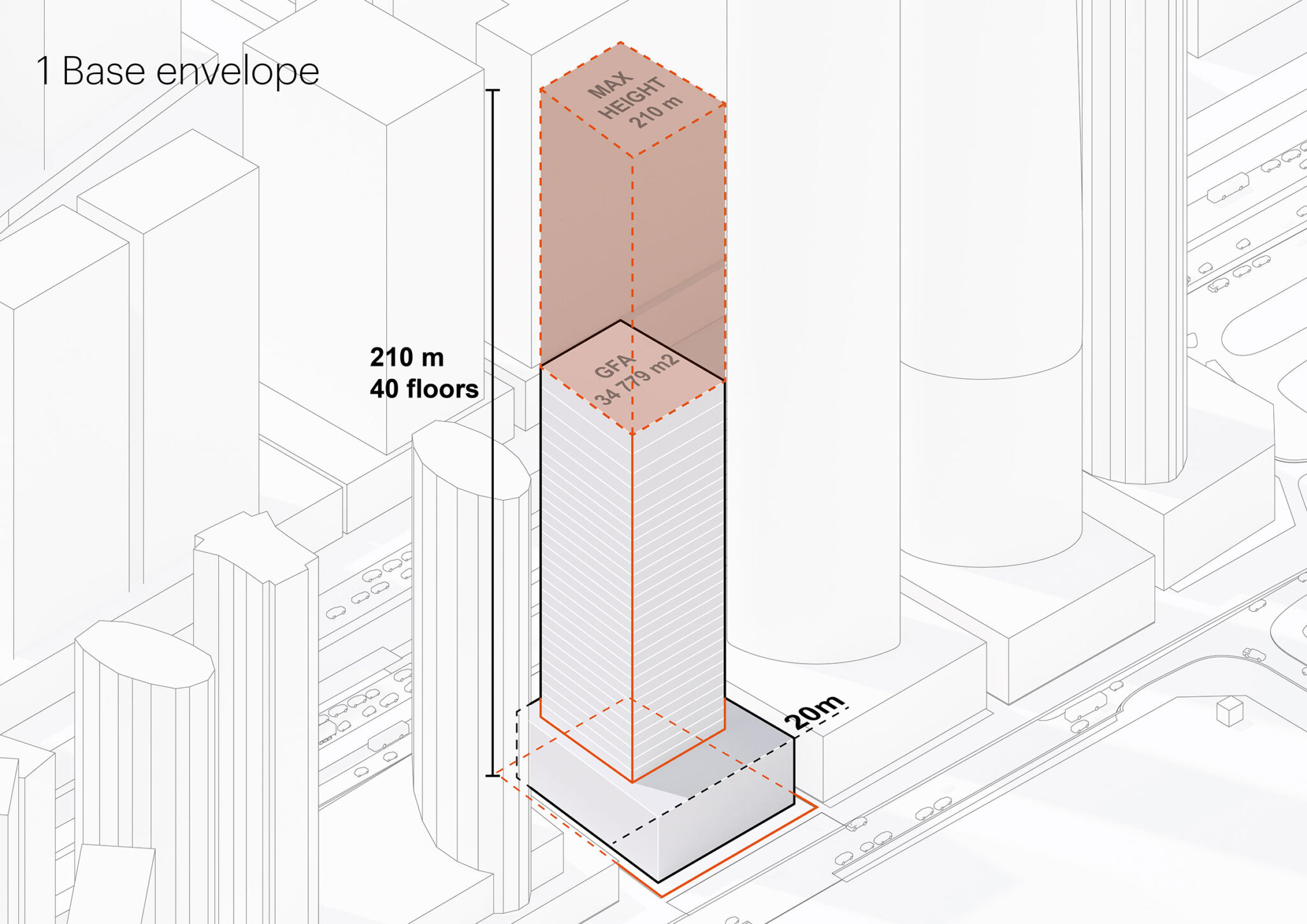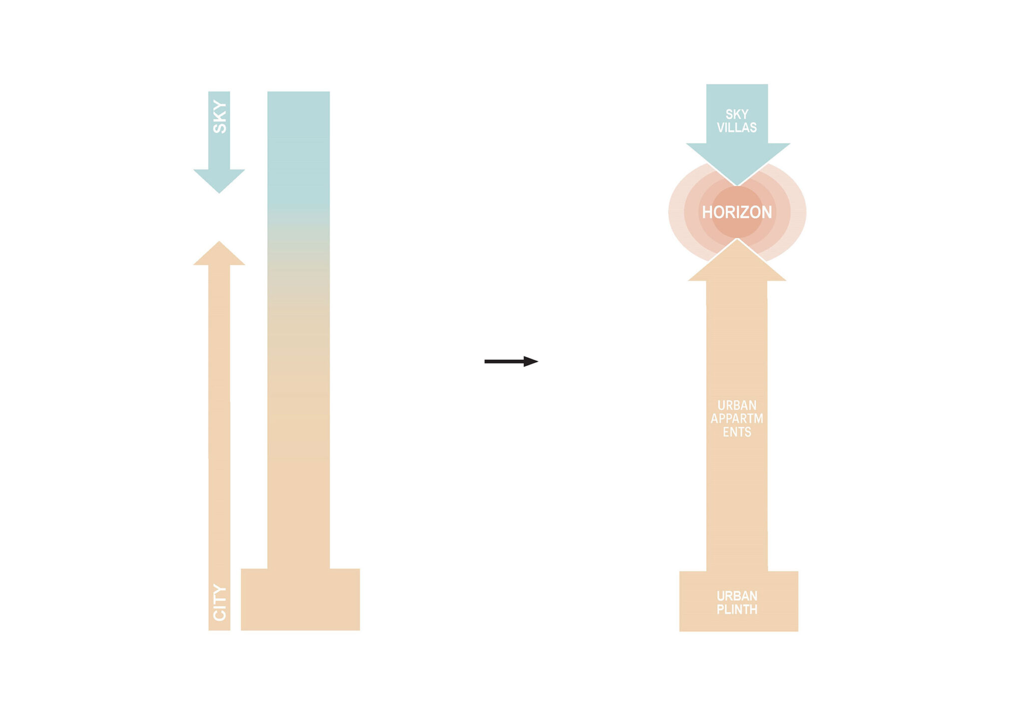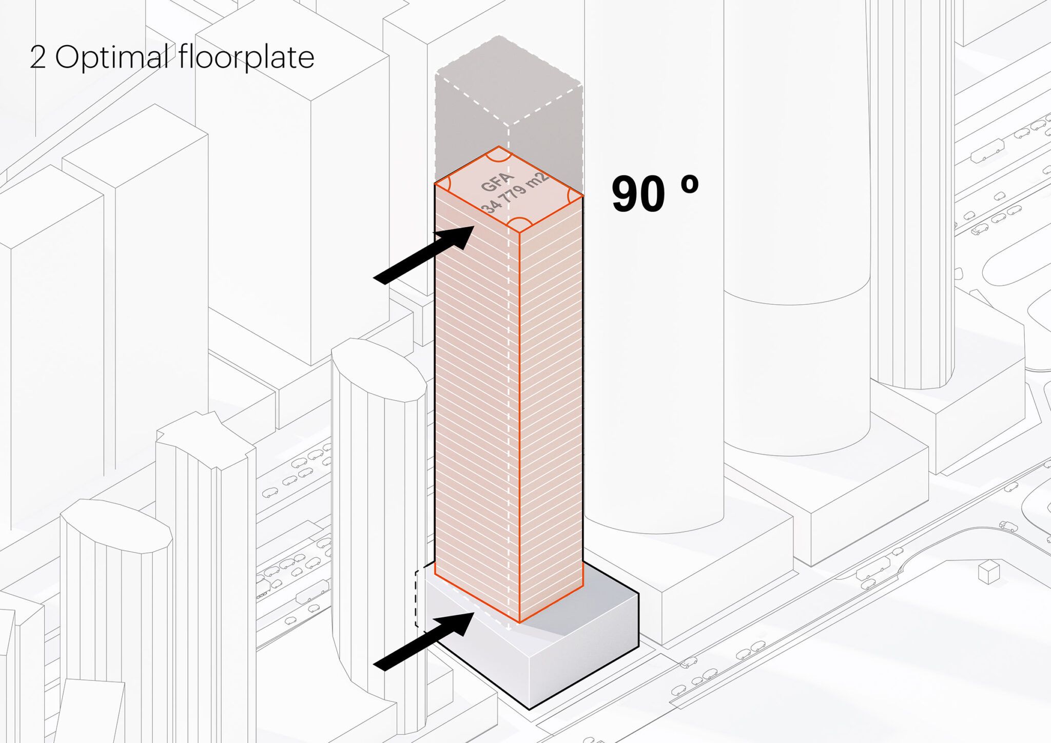 優劣を競い合うゲームを続けるのではなく、MVRDVのデザインは、スペクタクルよりも興味を引くことを重んじる新たなアプローチを提示しています。それは、洗練された直線的なタワーの上部を持ち上げて、タワー全高のおよそ4分の3の位置に、真珠に着想を得た、光を放つ卵形の特別な要素を現します。その位置と、タワーの階と階の間にほとんど控えめとも言える形で埋め込まれている在り方によって、この要素は、より高くより派手な周囲の建物の中にあっても、注目を集めることに成功します。