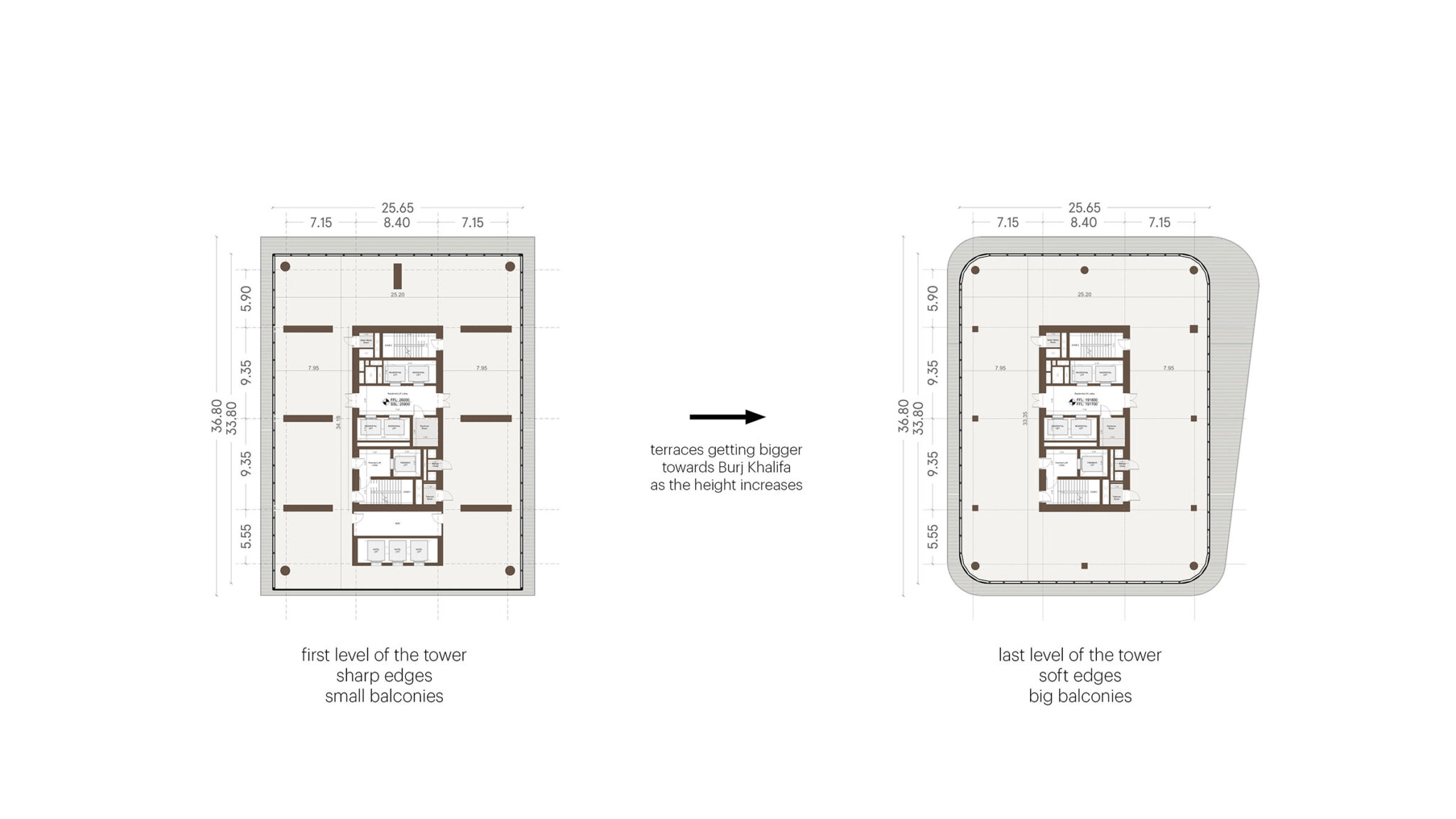 このデザインのファサードは、奥行き2メートルの周囲を回り込むバルコニーによって生み出される力強い水平帯によって特徴づけられており、これらは強い日差しから建物内部を保護するのに役立っています。ファサードの他の要素も「都市から空へ」というモチーフに沿っており、基壇部からタワー頂部にかけて徐々に変化していく複数の特徴を備えています。タワー基部では輪郭がはっきりした矩形のコーナーが、上部に向かうにつれて丸みを帯びた形状へと変化します。また、基部では都市を映し出していたミラーガラスは、空へと近づくにつれて次第に透明性を高めていきます。さらに建物北側のコーナーでは、バルコニーが建物上部に向かって外側へと広がり、より大きなスカイ・ヴィラのための屋外空間を拡張するとともに、ブルジュ・ハリファへの眺望を最大限に活かしています。