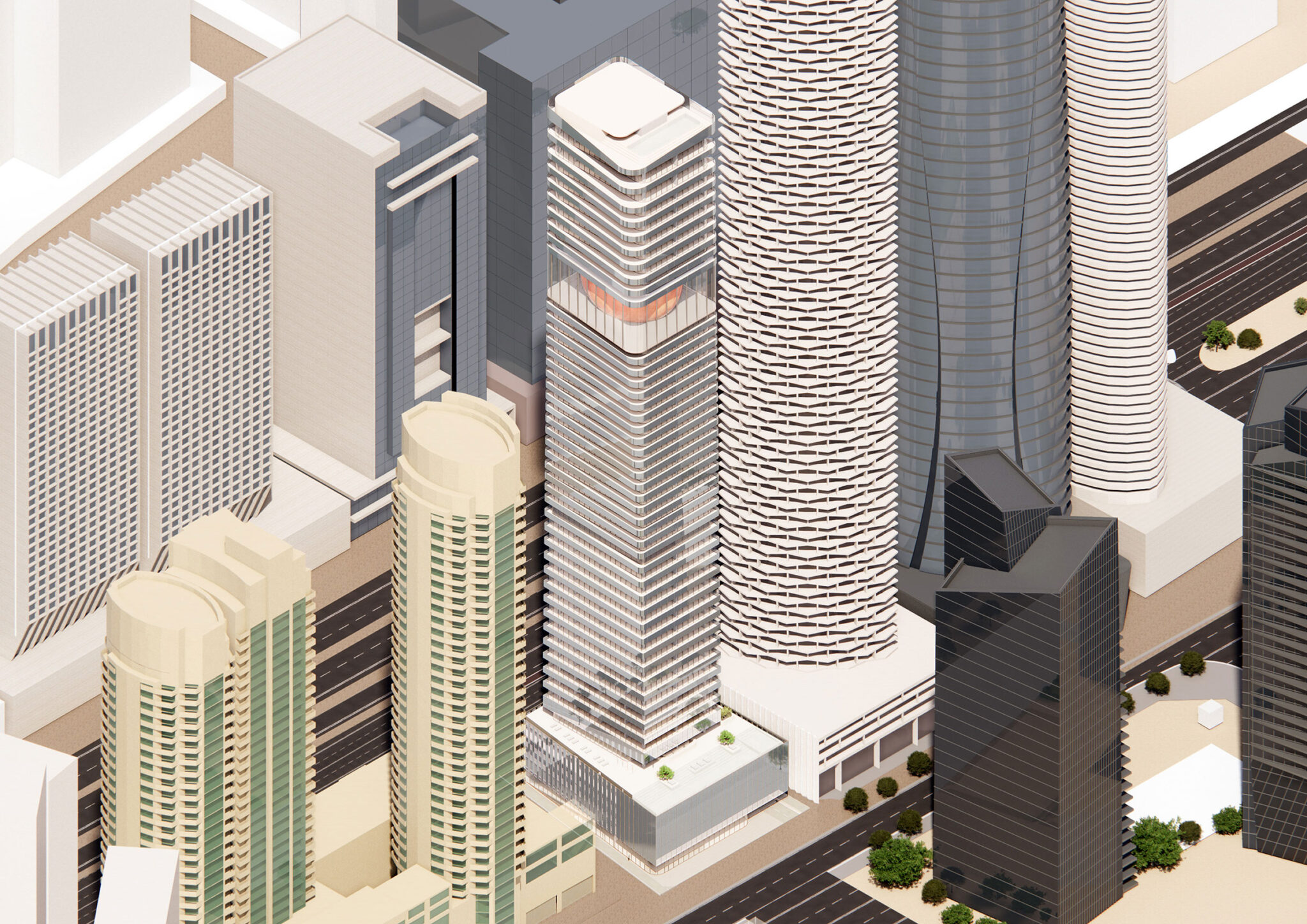 世界的に知られる高層都市での計画です。建築家は、ビル群が“注目を競い合う”状況の中で、スペクタクルではない方法で興味を引く新たなアプローチの提示を志向しました。そして、タワーの中間に“光を放つ卵形の特別な要素”を配する建築を考案しました。