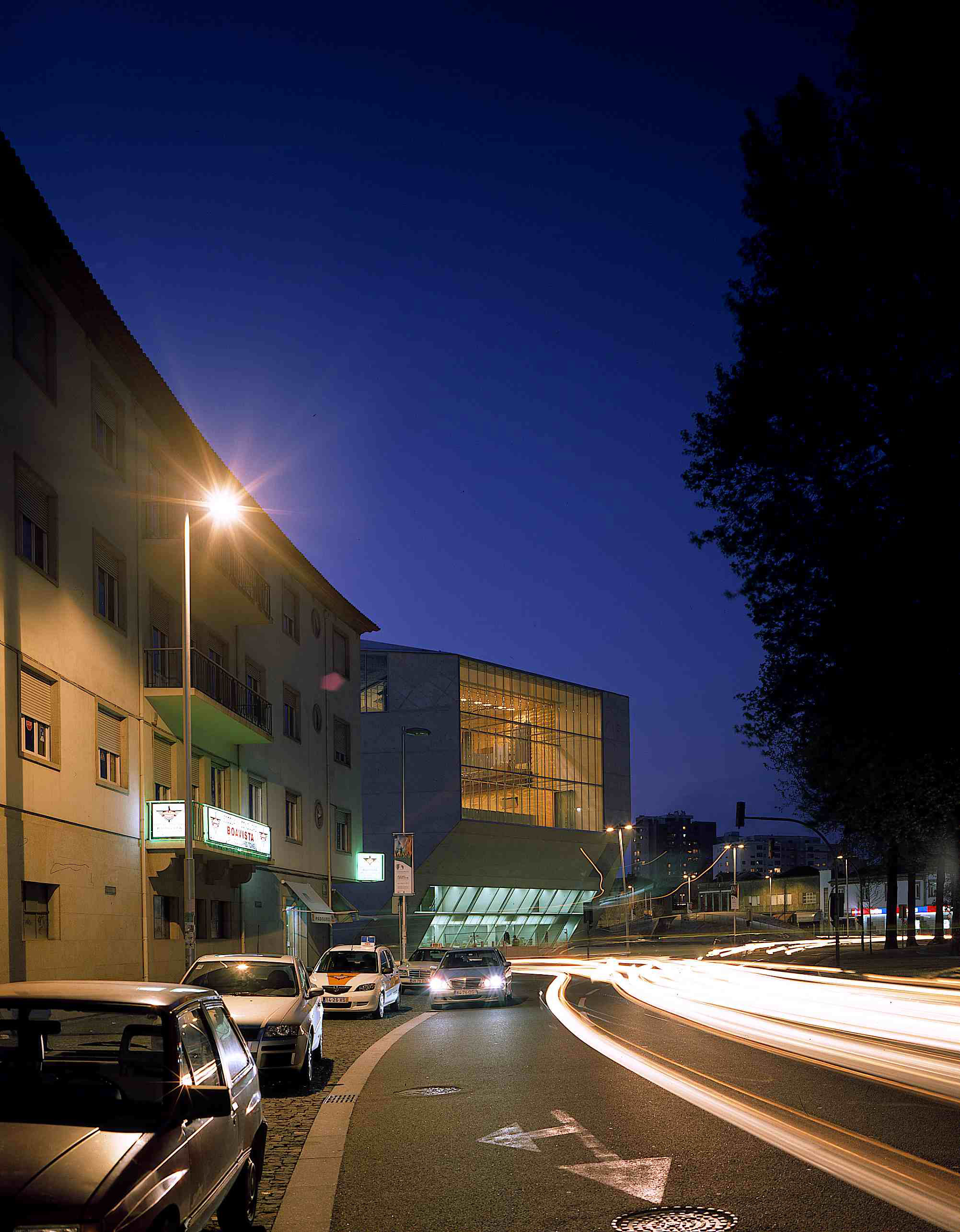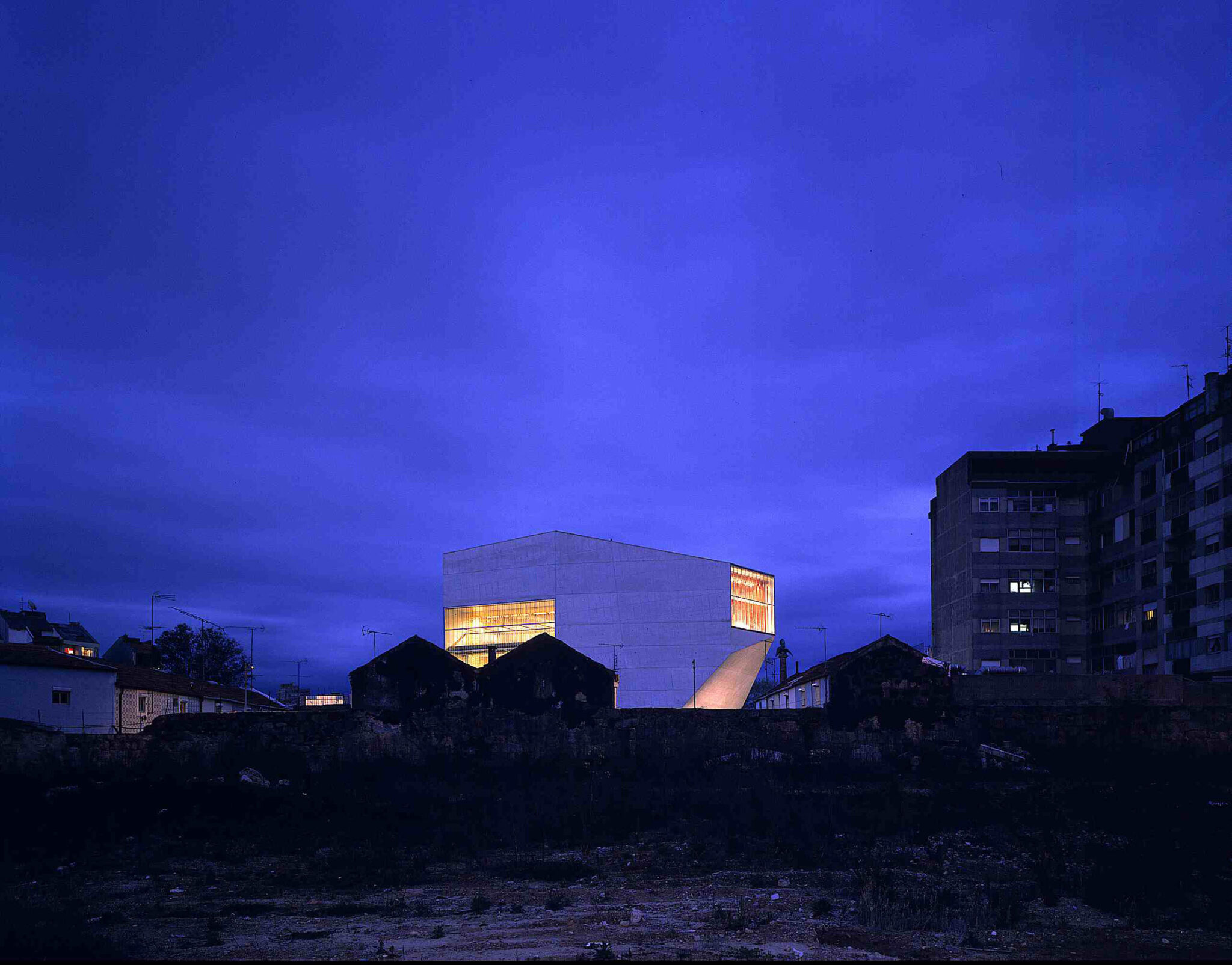 The past thirty years have seen frantic attempts by architects to escape the domination of the “shoe-box” concert hall. Rather than struggle with the inescapable acoustic superiority of this traditional shape, the Casa da Musica attempts to reinvigorate the traditional concert hall in another way: by redefining the relationship between the hallowed interior and the general public outside. The Casa da Musica, the new home of the National Orchestra of Porto, stands on a new public square in the historic Rotunda da Boavista. It has a distinctive faceted form, made of white concrete, which remains solid and believable in an age of too many icons. Inside, the elevated 1,300-seat (shoe box-shaped) Grand Auditorium has corrugated glass facades at either end that open the hall to the city and offer Porto itself as a dramatic backdrop for performances. Casa da Musica reveals its contents without being didactic; at the same time, it casts the city in a new light.