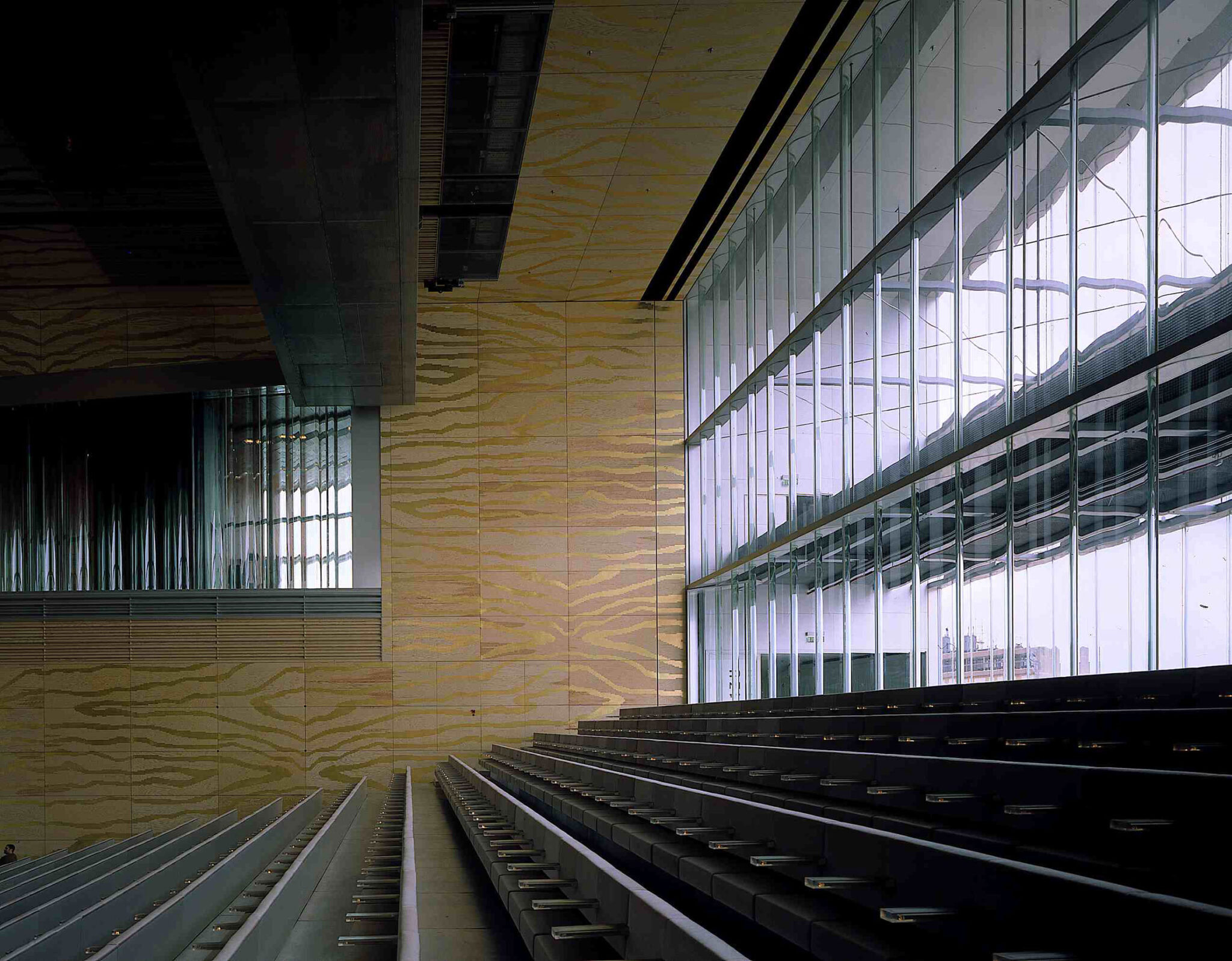 意図的に大きな中央ホワイエは設けられておらず、その代わりに、階段、プラットフォーム、エスカレーターによる連続したパブリック・ルートが、グランド・オーディトリウム周囲の諸空間を結んでいます。この建物は建築的な冒険となっています。